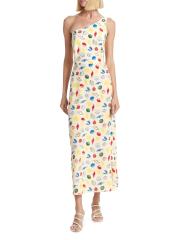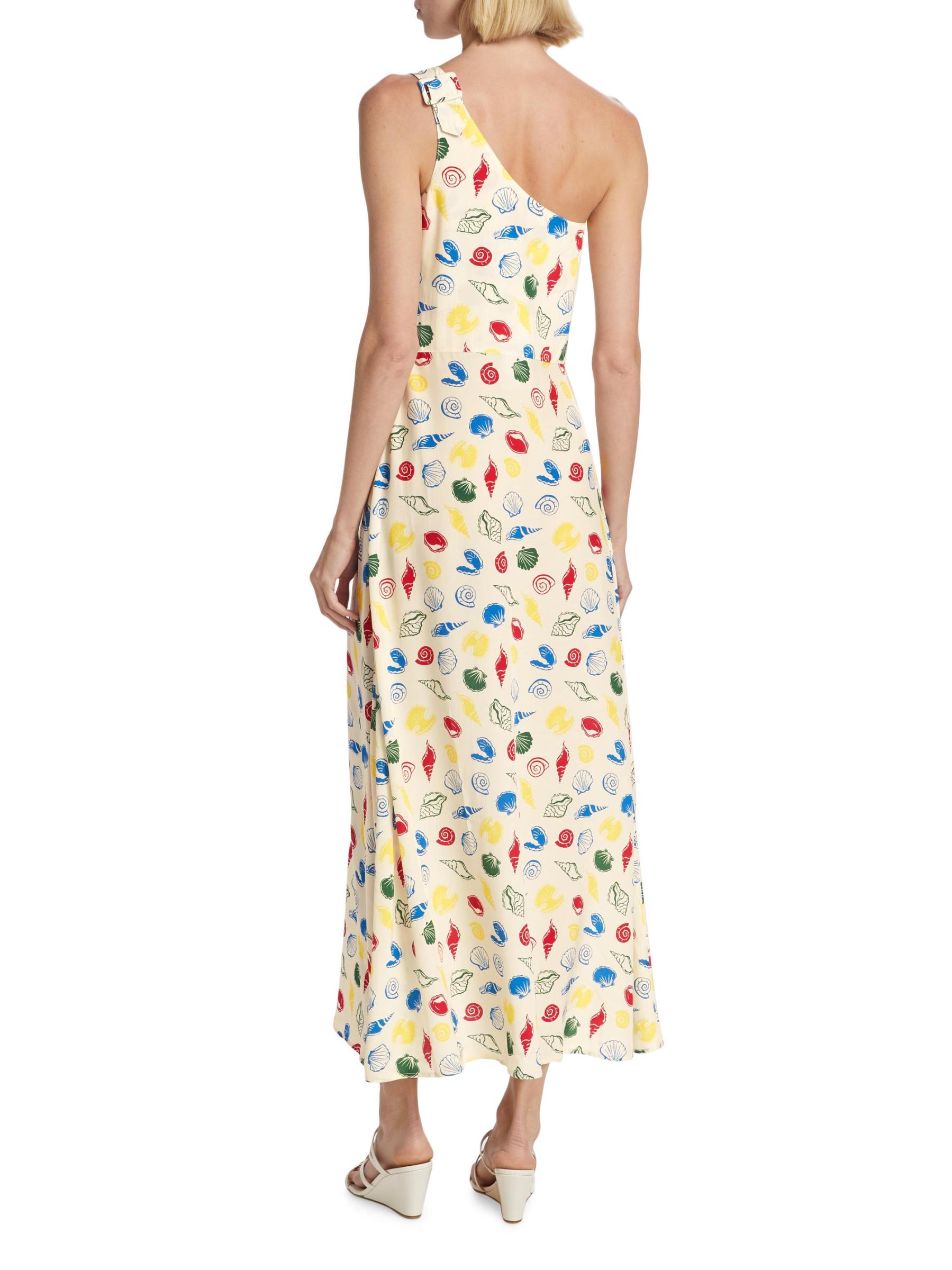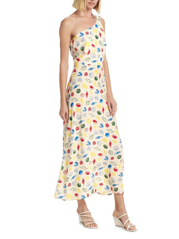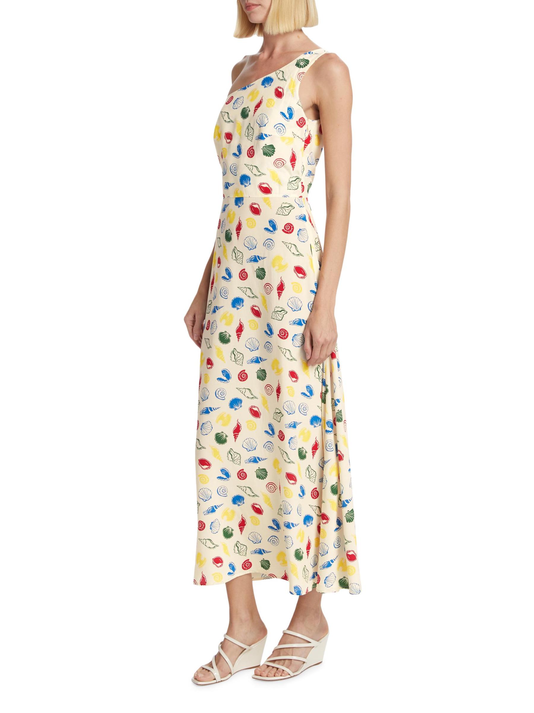 يتميّز فستان Elena midi من HVN بتقويرة بكتف واحد، مزيّن بنقشة صدفية.