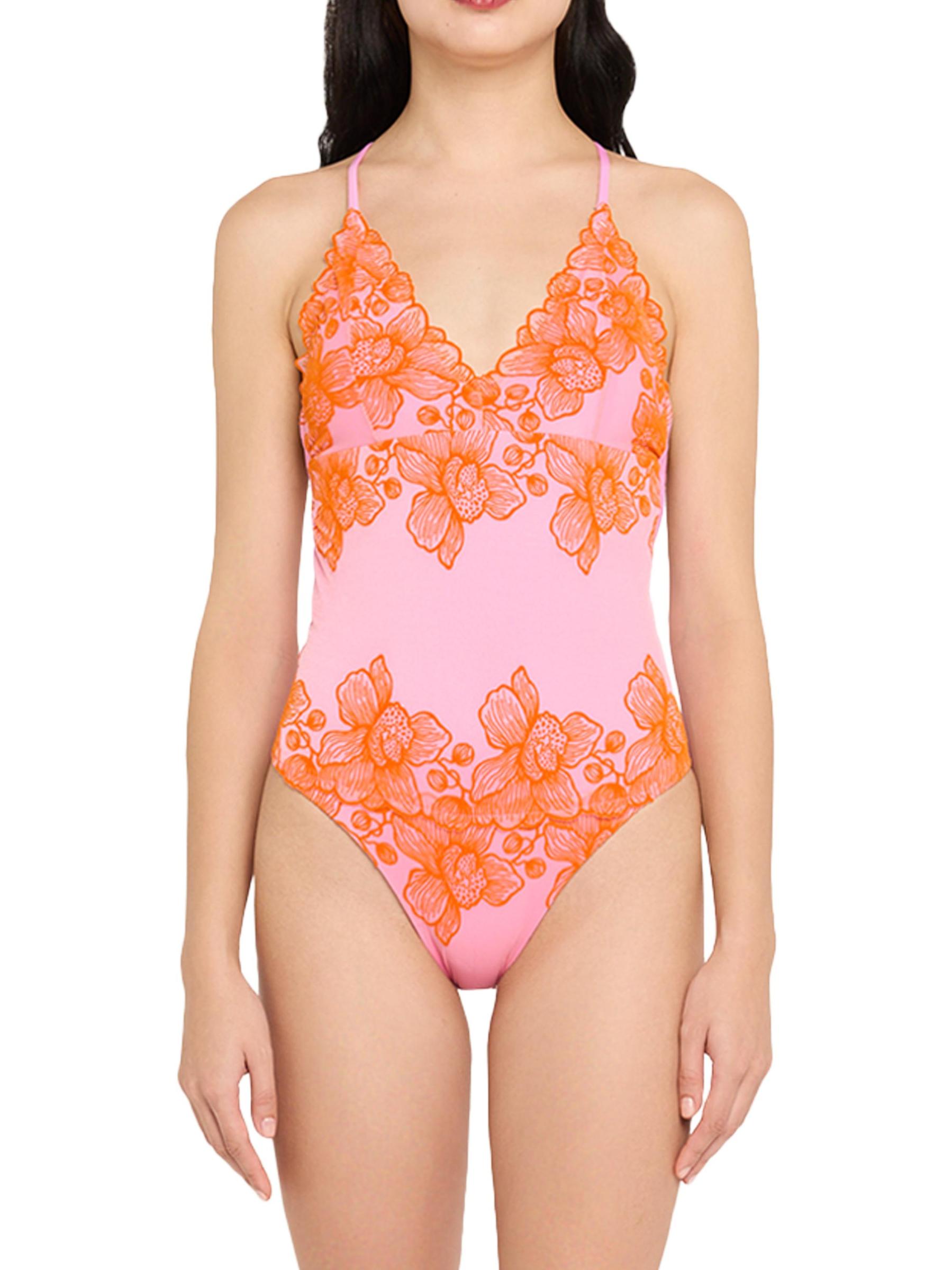 تم تصميم بدلة السباحة Eloise المكونة من قطعة واحدة من PQ من مزيج النايلون المرن بطبعة زهرية متباينة. يتميز الجزء السفلي من الظهر لهذا الطراز بأحزمة ربط ذاتية وتغطية متوسطة للمقعد.