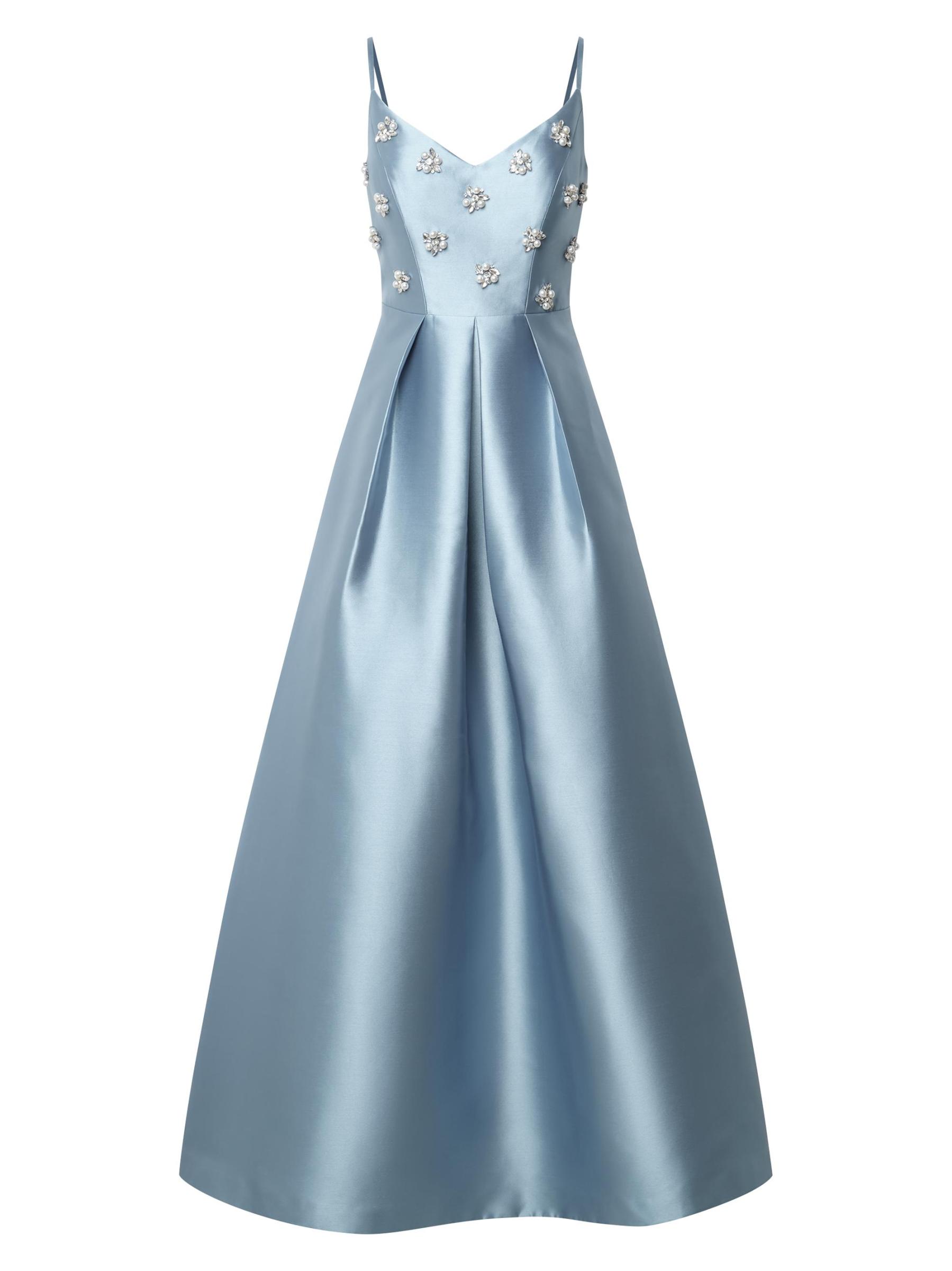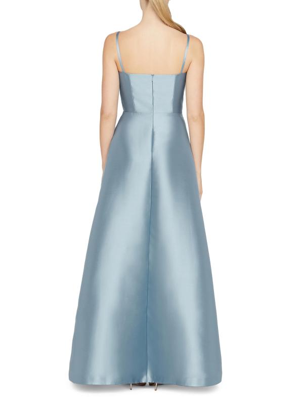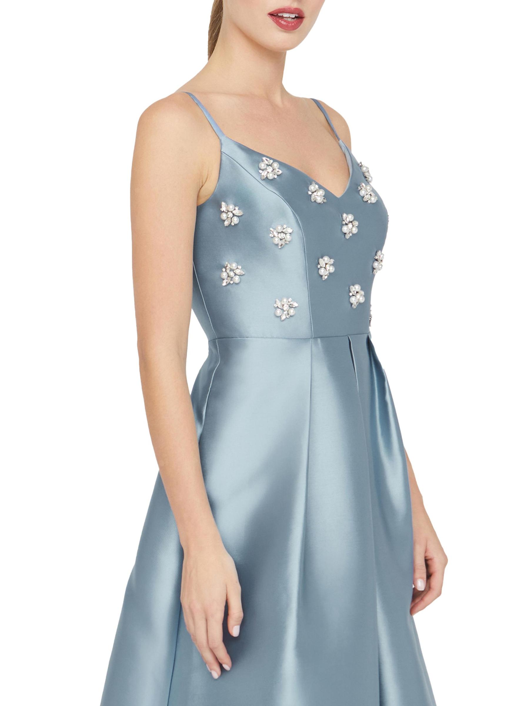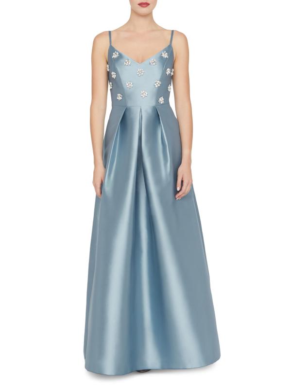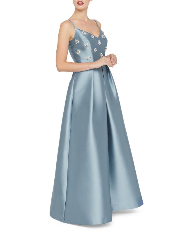 يتميز فستان Eloise المناسب والمضيء من تصميم Kay Unger، المصنوع من الساتان الفاخر، بزخارف نباتية مزخرفة بالخرز على الجزء الأمامي من الصدّار، وطيات على الخصر، وجيوب على درزات.