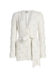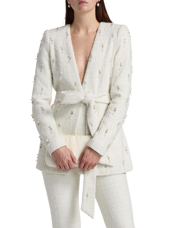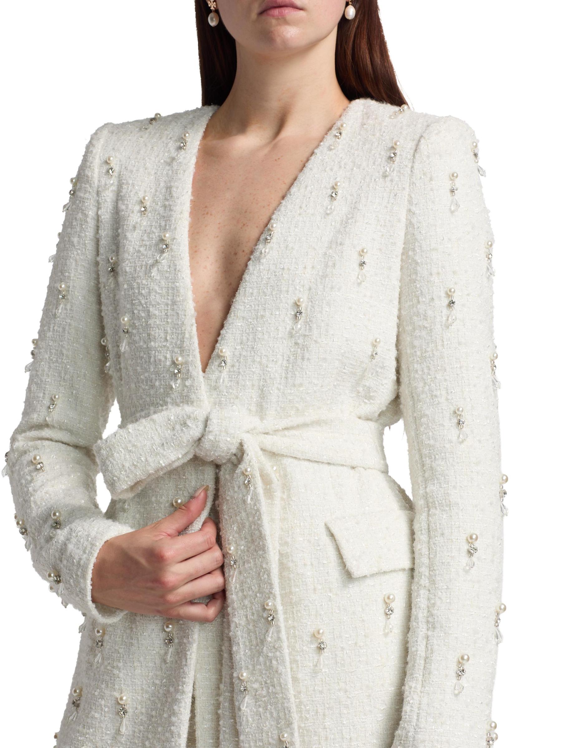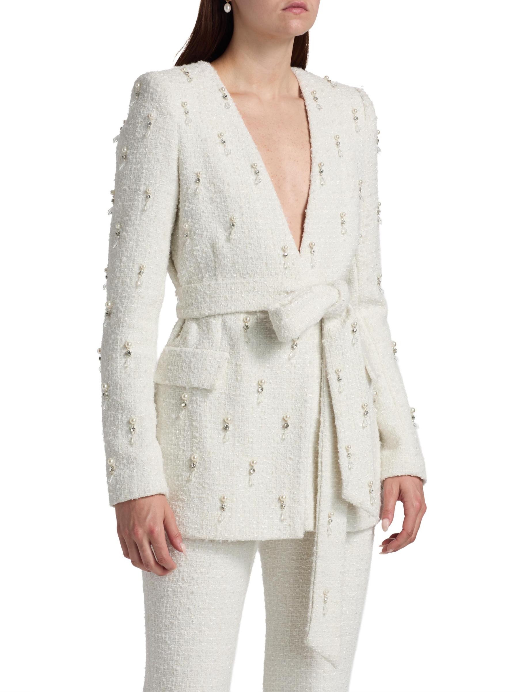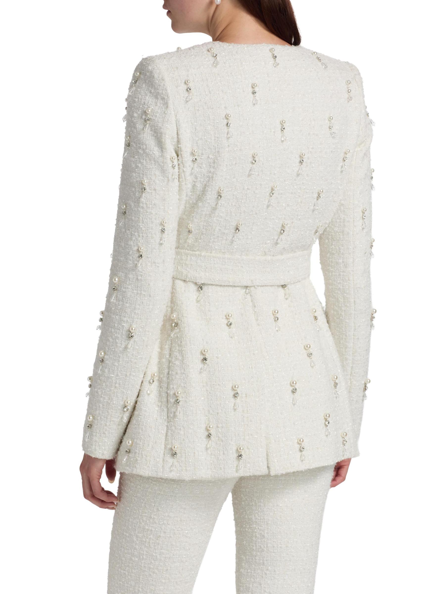 تم تصميم هذه السترة المسائية من Badgley Mischka باللؤلؤ الصناعي وأحجار الراين.رقبة واسعة على شكل حرف V أكمام طويلة حزام ربط ذاتي جيوب بسحّاب على الخصر إغلاق بأزرار أمامية 100% بوليستر تنظيف البقع مستوردة