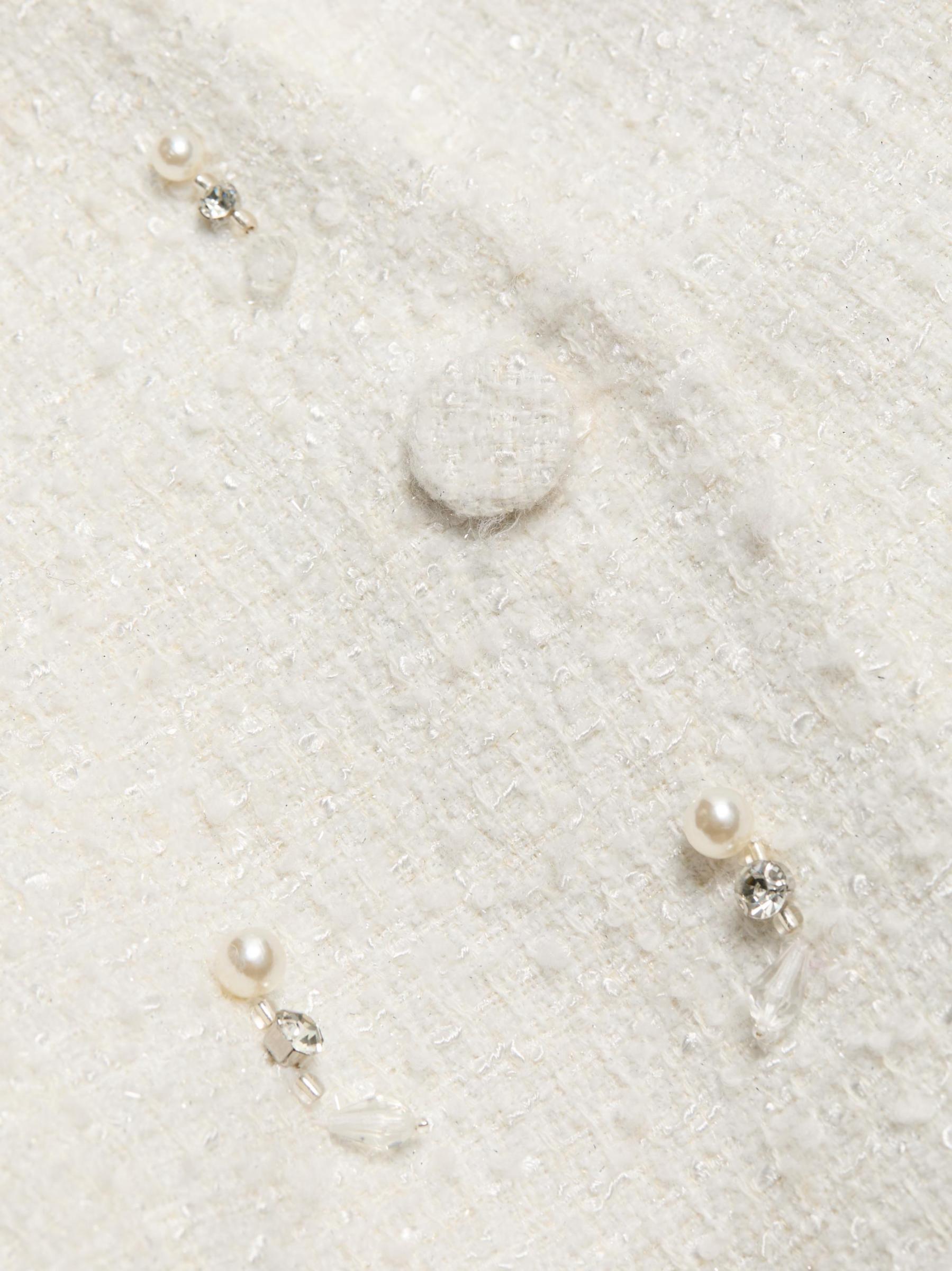 تم تصميم هذه السترة المسائية من Badgley Mischka باللؤلؤ الصناعي وأحجار الراين.