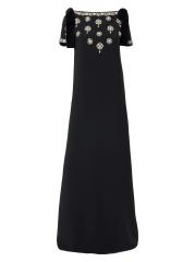 من مجموعة الشاليه. يُعد فستان Carolina Herrera المصنوع من الكريب على شكل حرف A قطعة راقية وفخمة، وقد تم تزيينه بشكل معقد بميداليات من اللؤلؤ الصناعي والكريستال والخرز على الصدر والياقة والأساور. تضيف الأقواس المخملية الرقيقة عند الكتفين لمسة نهائية من الأناقة لهذا النمط الخالد.
