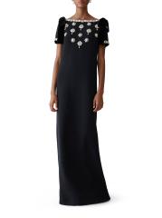 من مجموعة الشاليه. يُعد فستان Carolina Herrera المصنوع من الكريب على شكل حرف A قطعة راقية وفخمة، وقد تم تزيينه بشكل معقد بميداليات من اللؤلؤ الصناعي والكريستال والخرز على الصدر والياقة والأساور. تضيف الأقواس المخملية الرقيقة عند الكتفين لمسة نهائية من الأناقة لهذا النمط الخالد.بوتنك أكمام قصيرة شق خلفي إغلاق بسحّاب خلفي مخفي 92% بوليستر/ 8% بولي يوريثين تنظيف جاف مستوردة