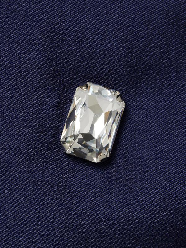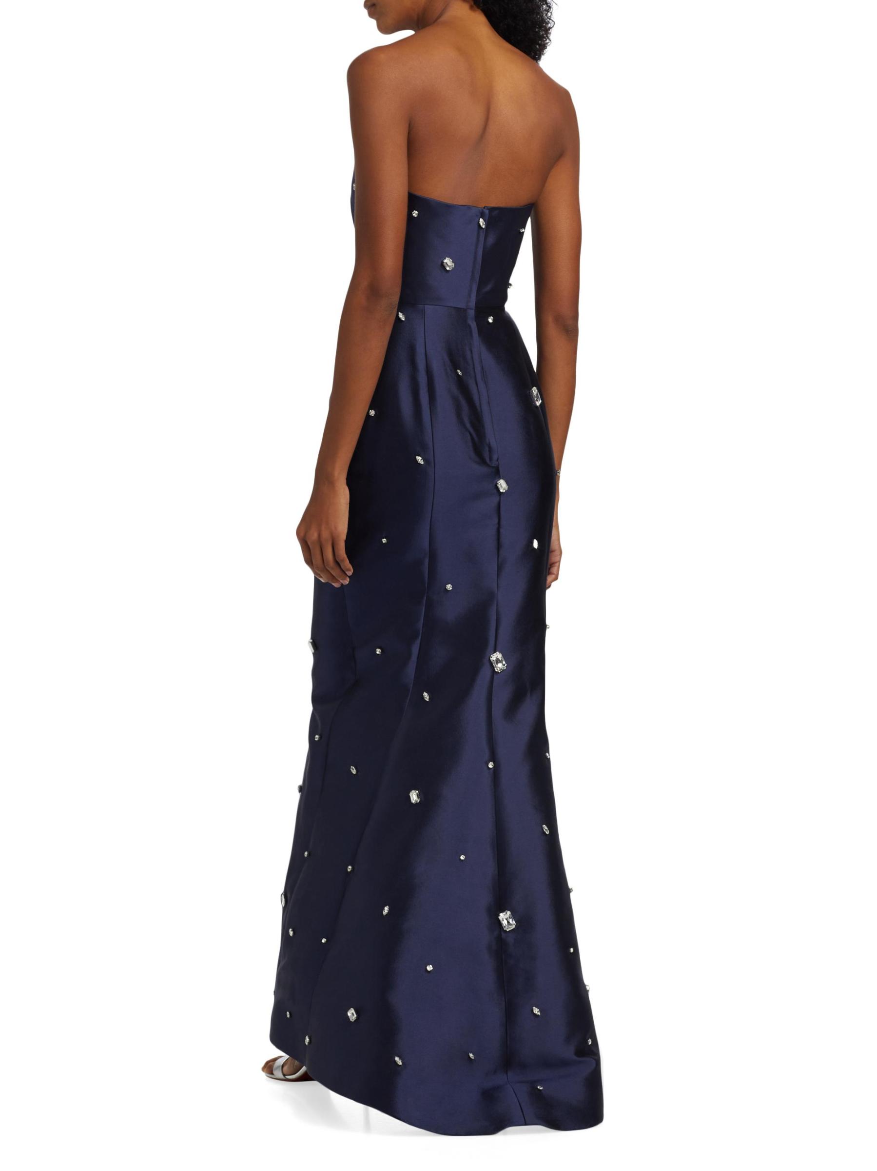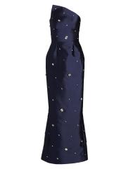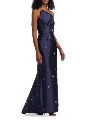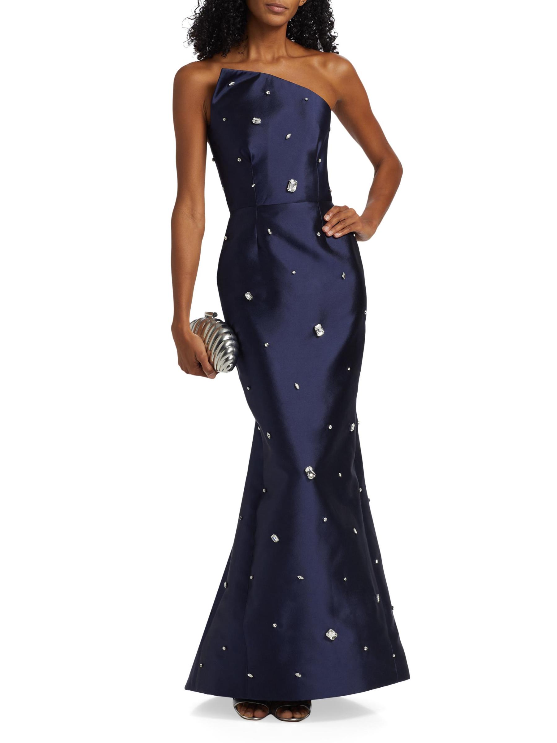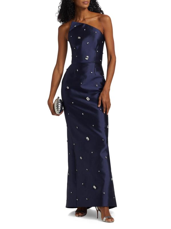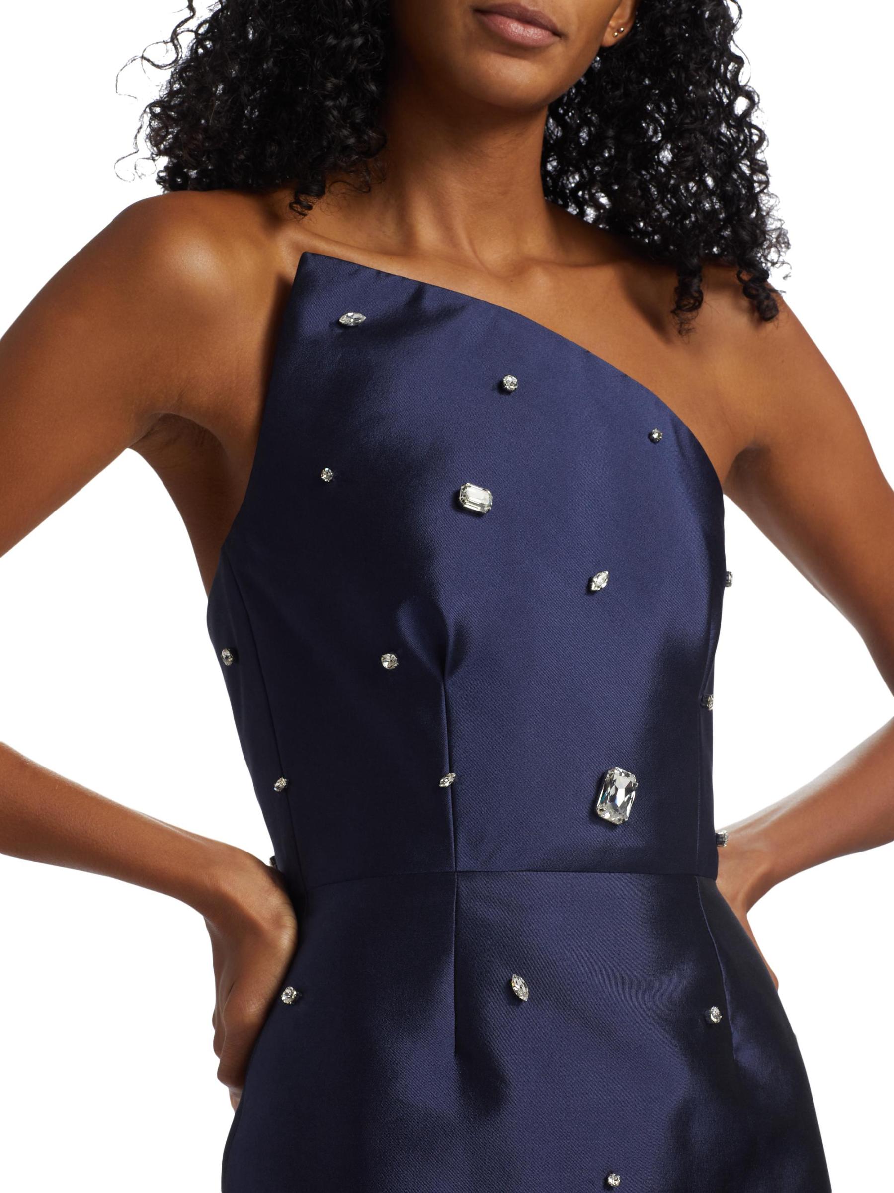 يُبرز فستان Catherine Regehr المذهل غير المتماثل، المصنوع من رادزيمير الحريري، التصميم بالأحجار الكريمة المزخرفة.