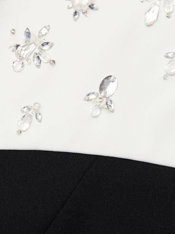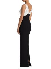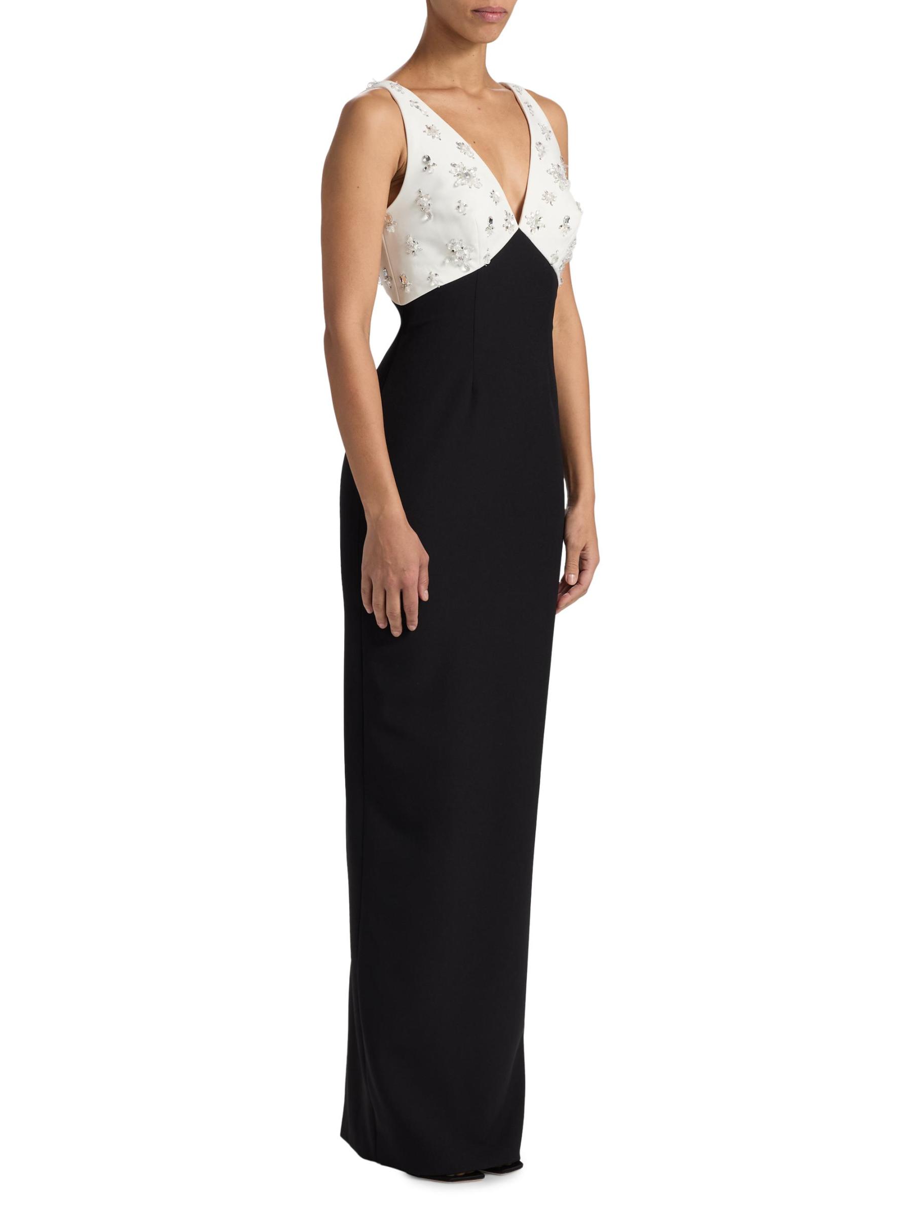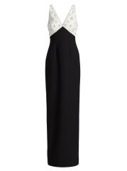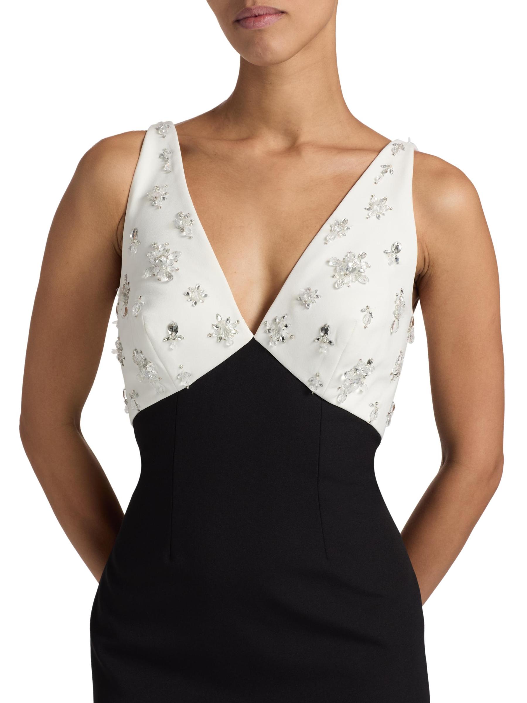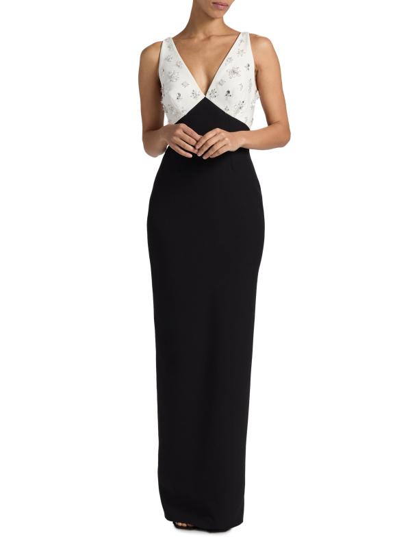 يتميز فستان Pamella Roland ذو اللونين المصنوع من الكريب على شكل عمود بتفاصيل مزخرفة على الصدّار المتباين، مما يوازن الشق الخلفي الجذاب.