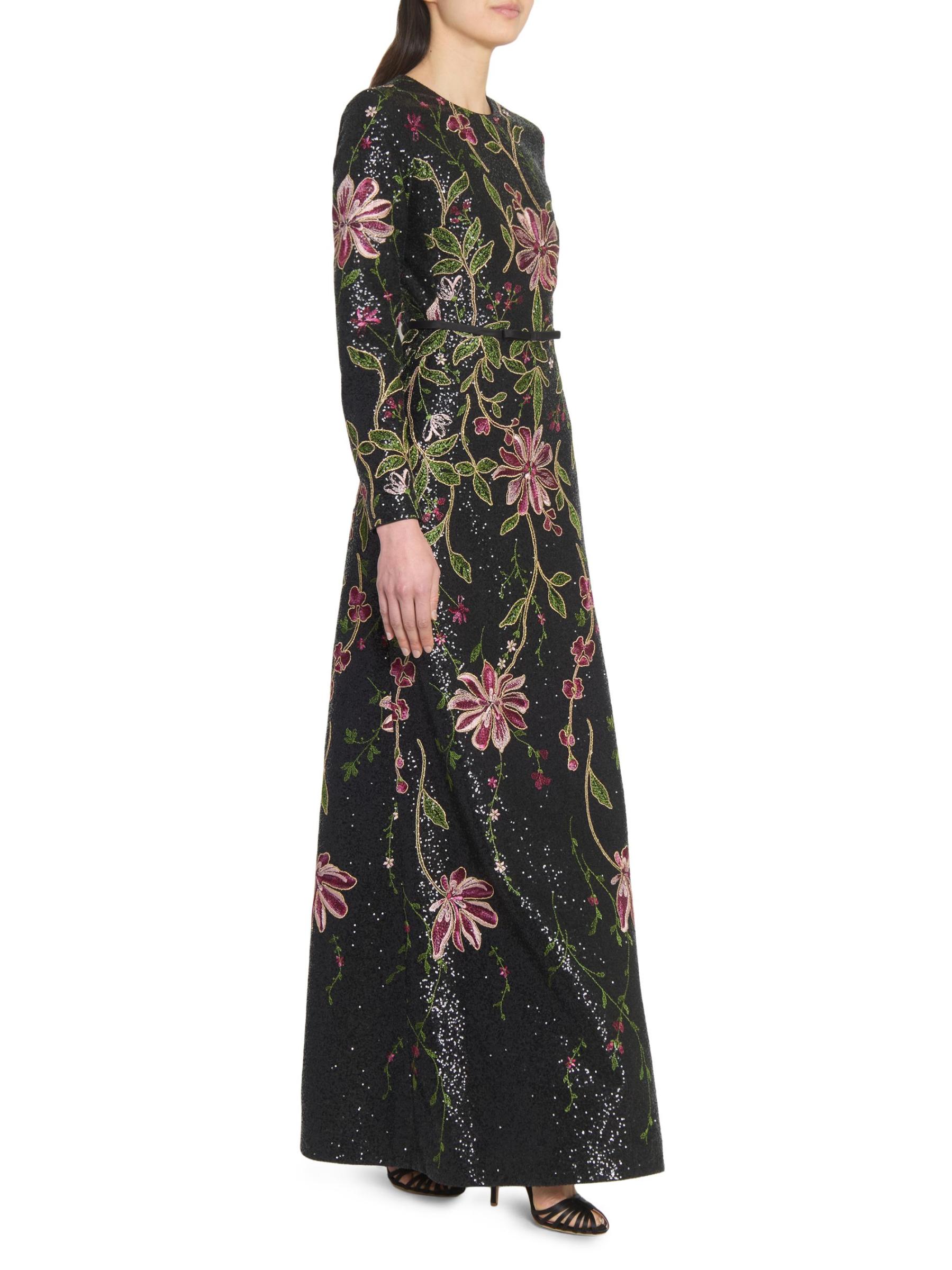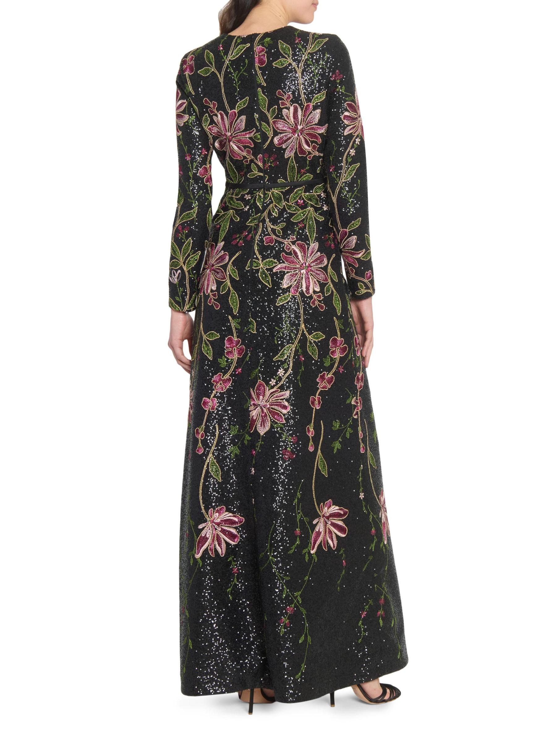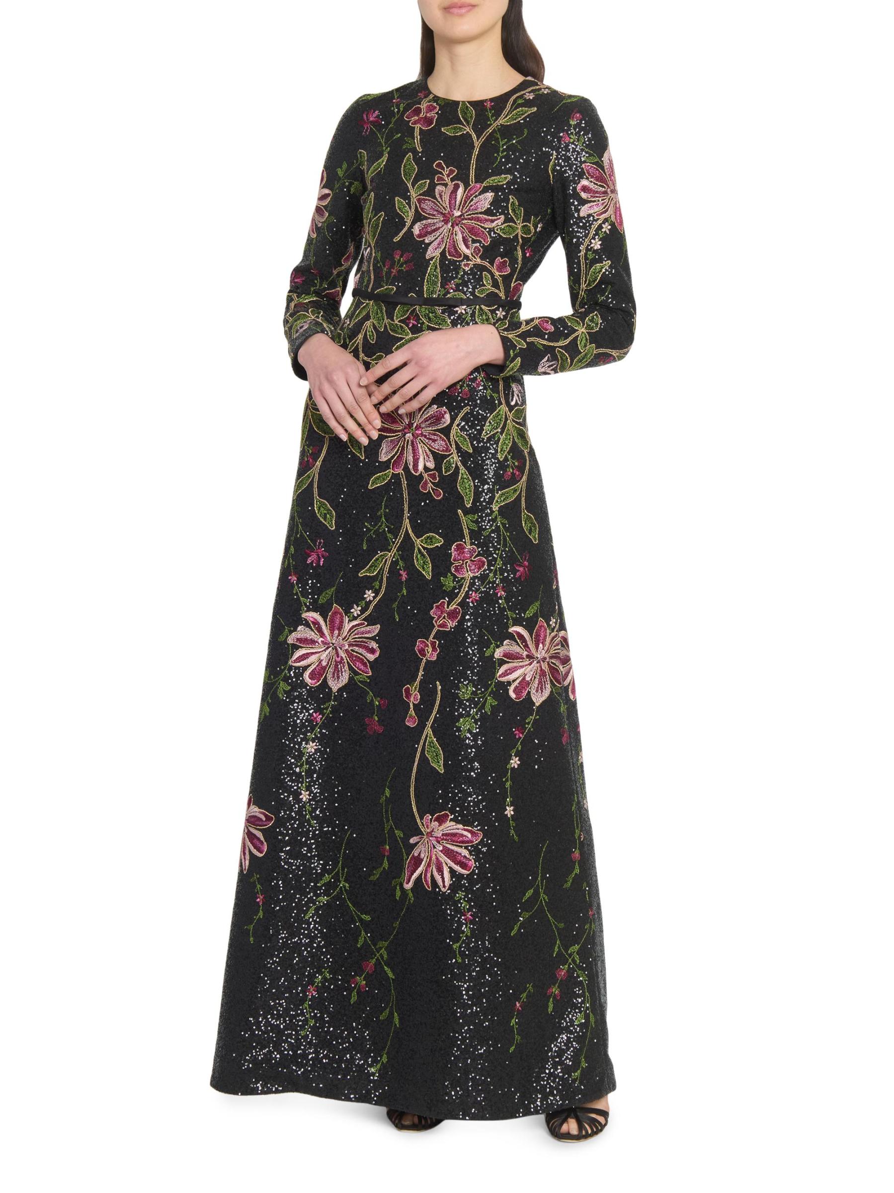 يتميز هذا الفستان الطويل من Giambattista Valli بتصميم على شكل حرف A وأكمام طويلة وتطريز الأزهار النابض بالحياة والمزين بالترتر اللامع.