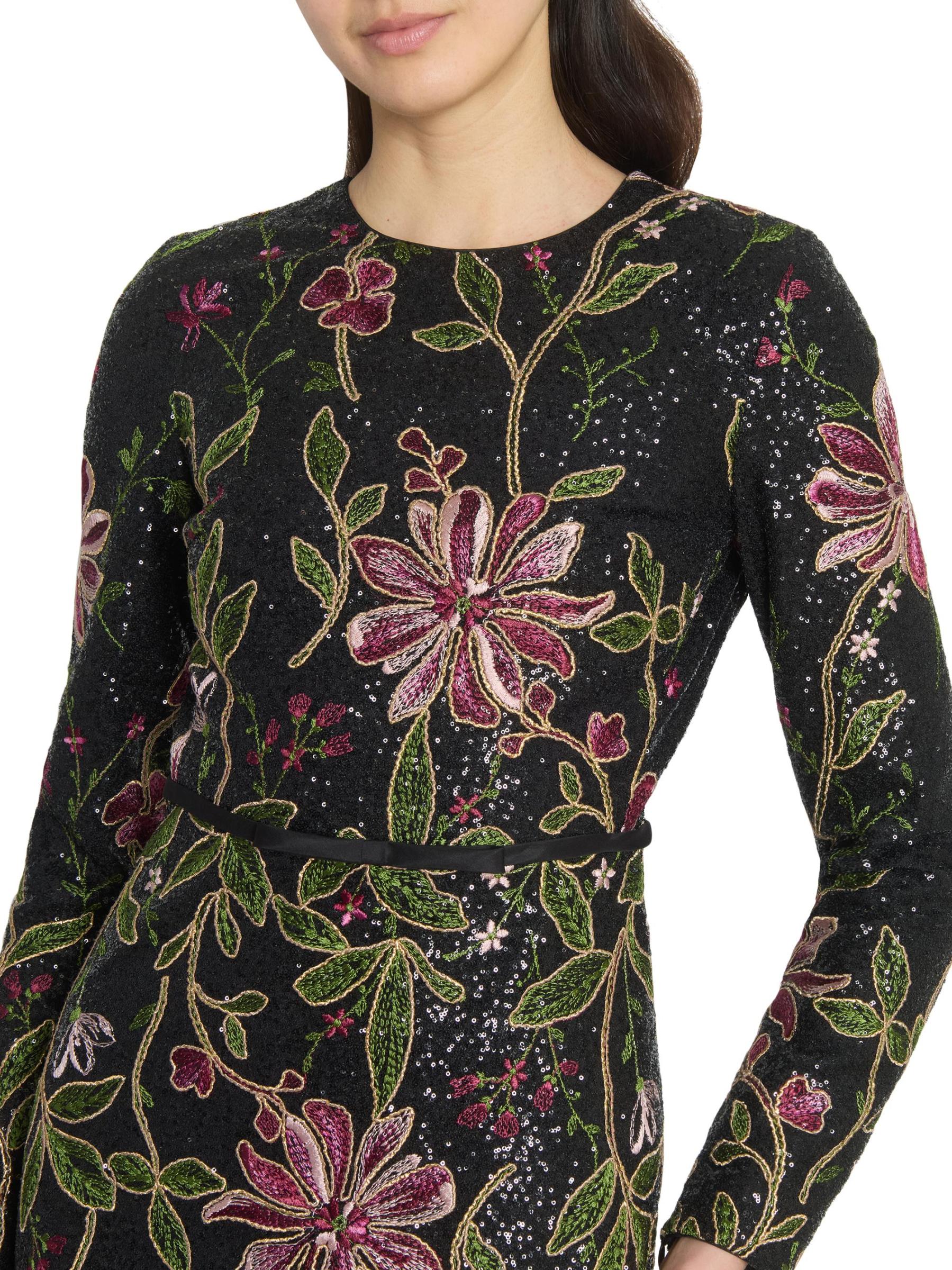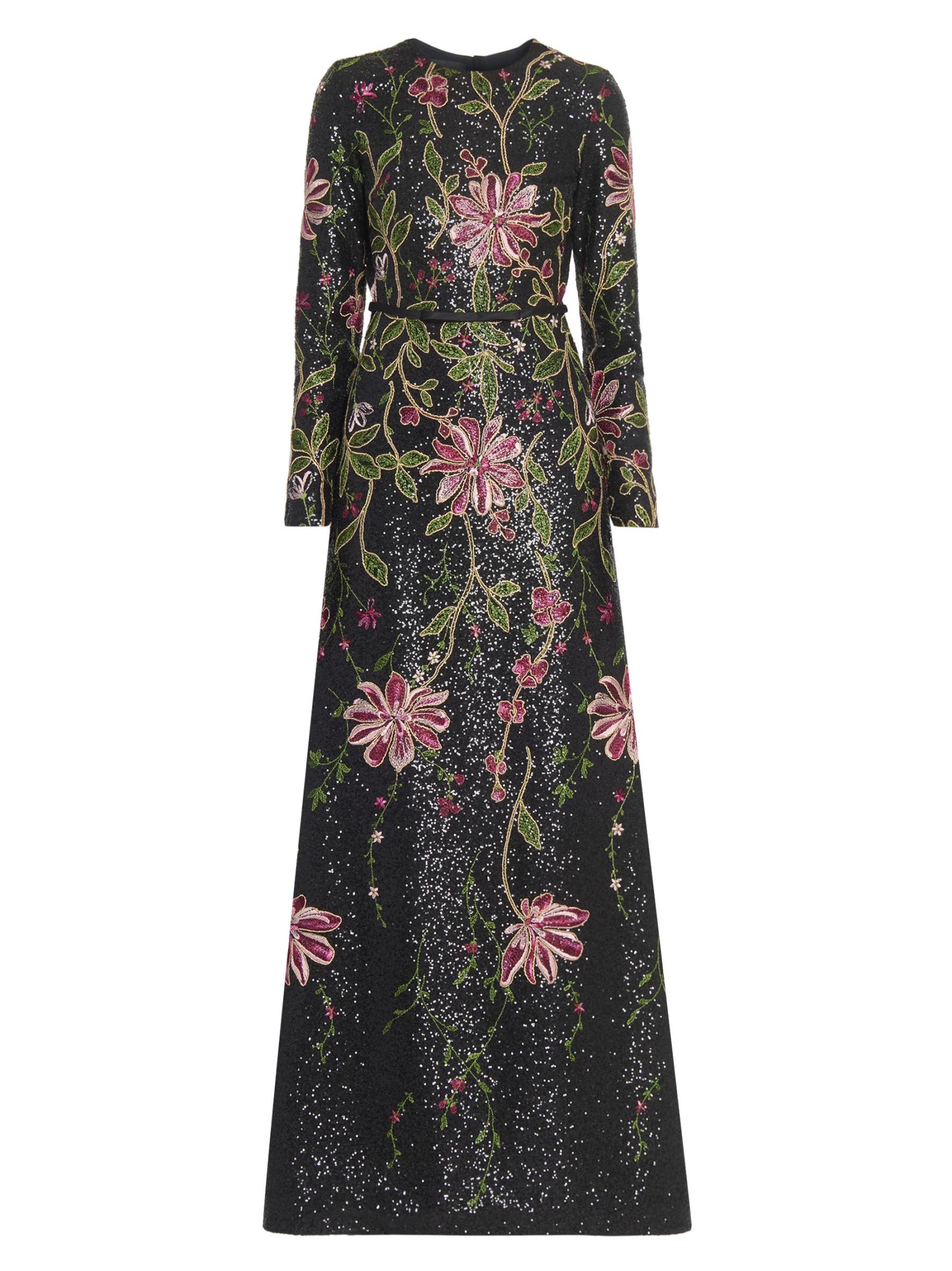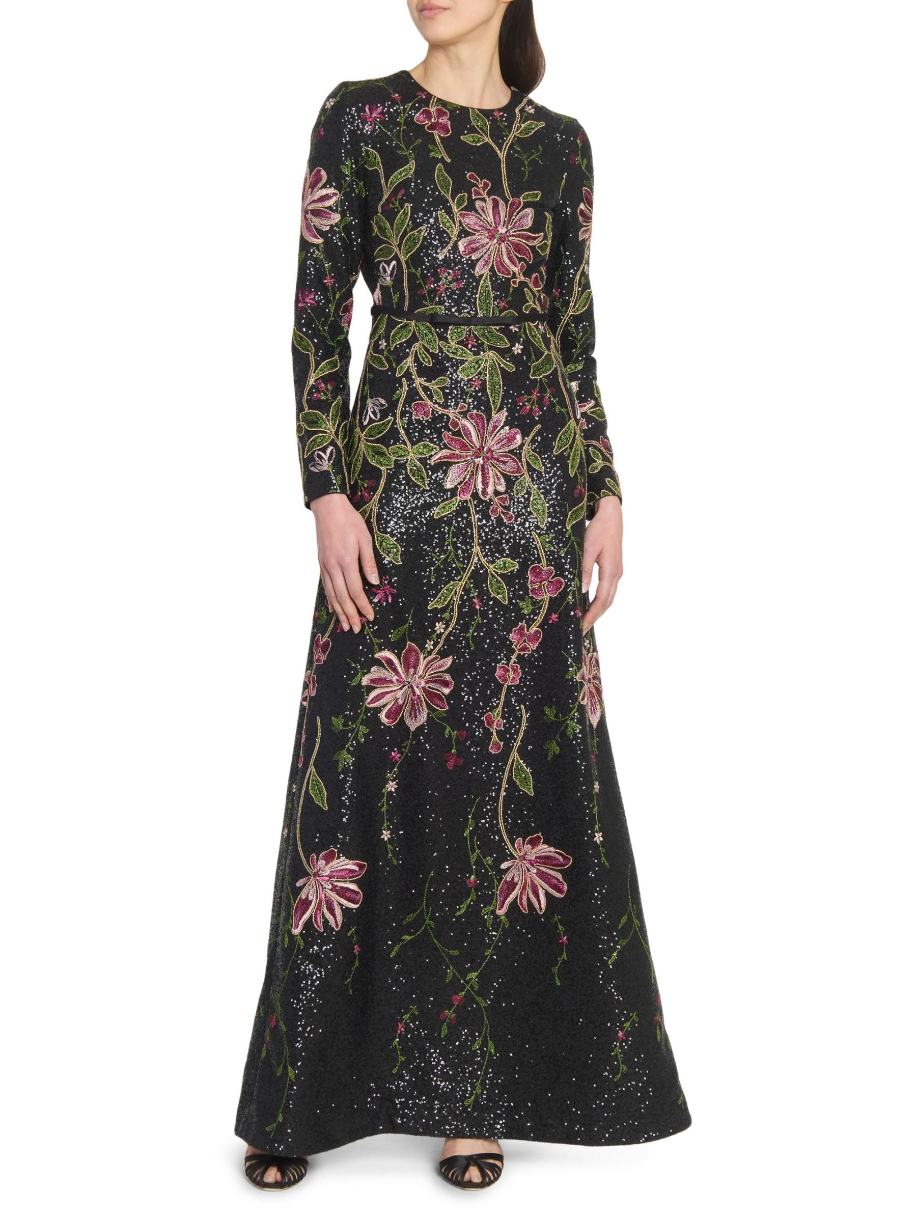 يتميز هذا الفستان الطويل من Giambattista Valli بتصميم على شكل حرف A وأكمام طويلة وتطريز الأزهار النابض بالحياة والمزين بالترتر اللامع.