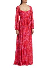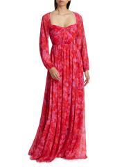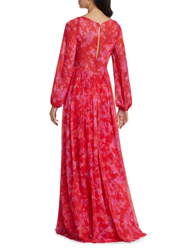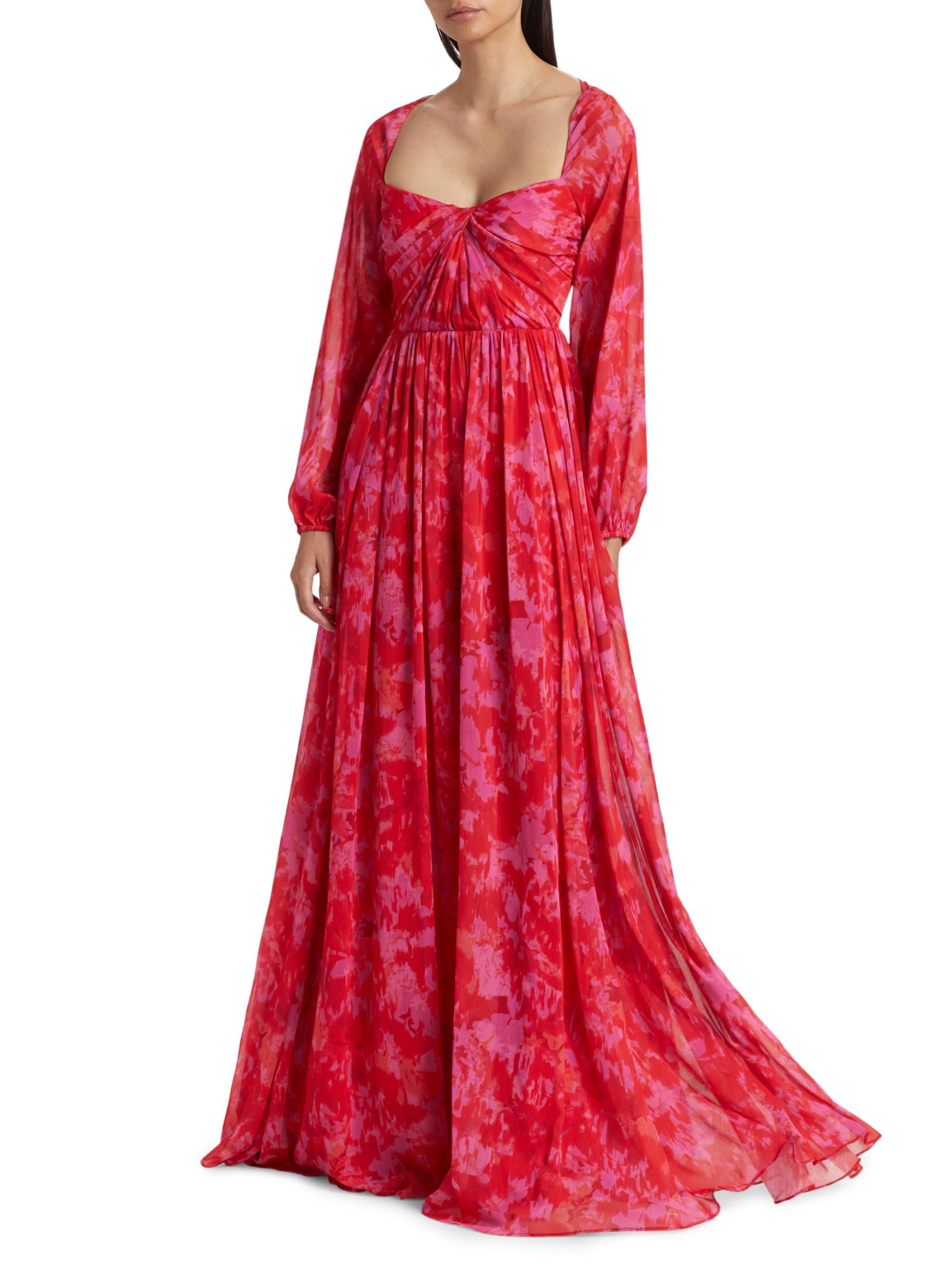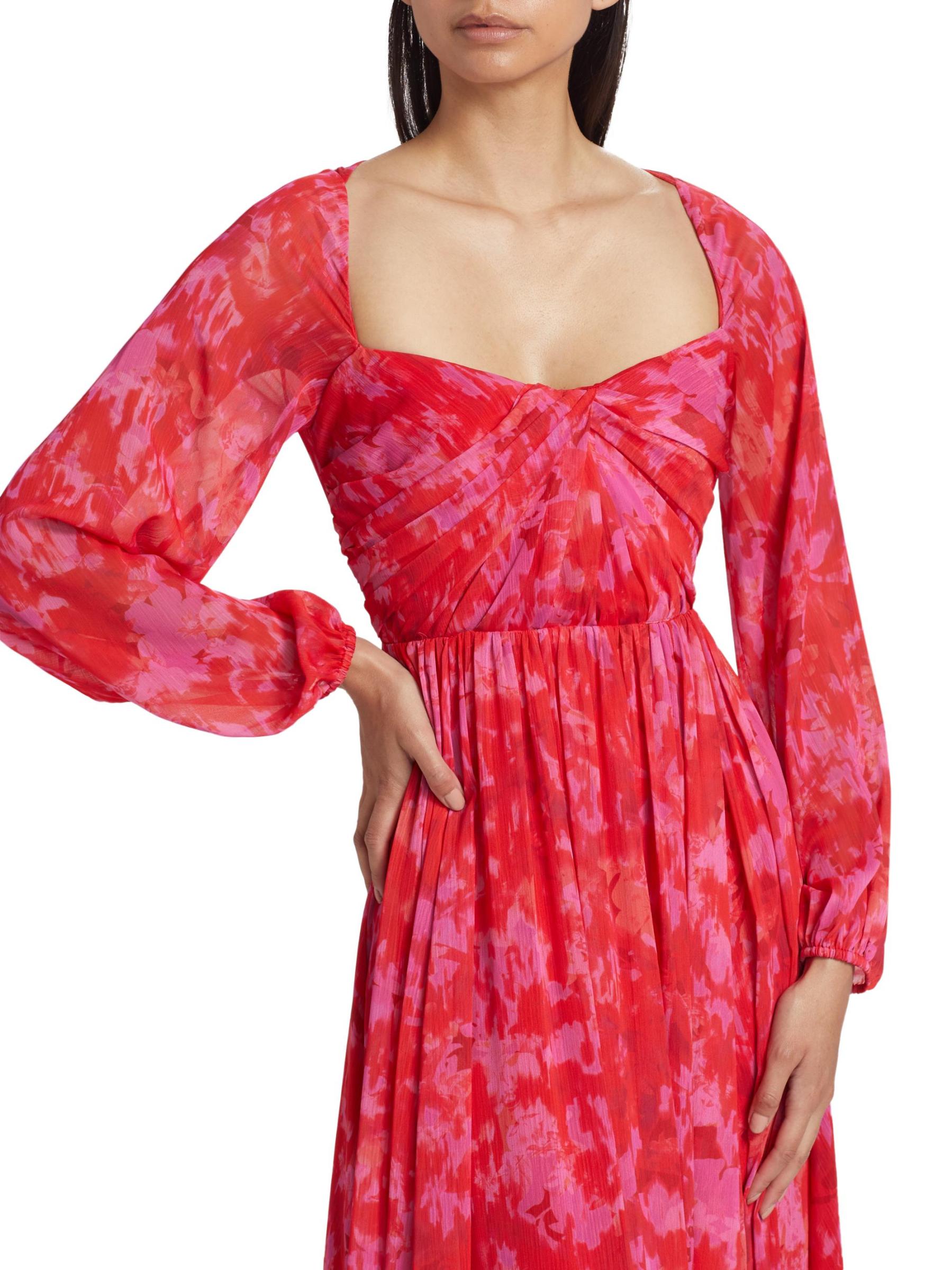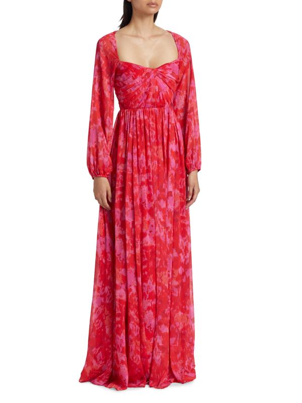 صُمم فستان Emery maxi من ML Monique Lhuillier من الشيفون المجعد المطبوع بأسلوب تجريدي، ويتميز برقبة رومنسية وصدّار مدمج.