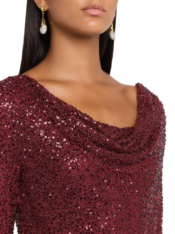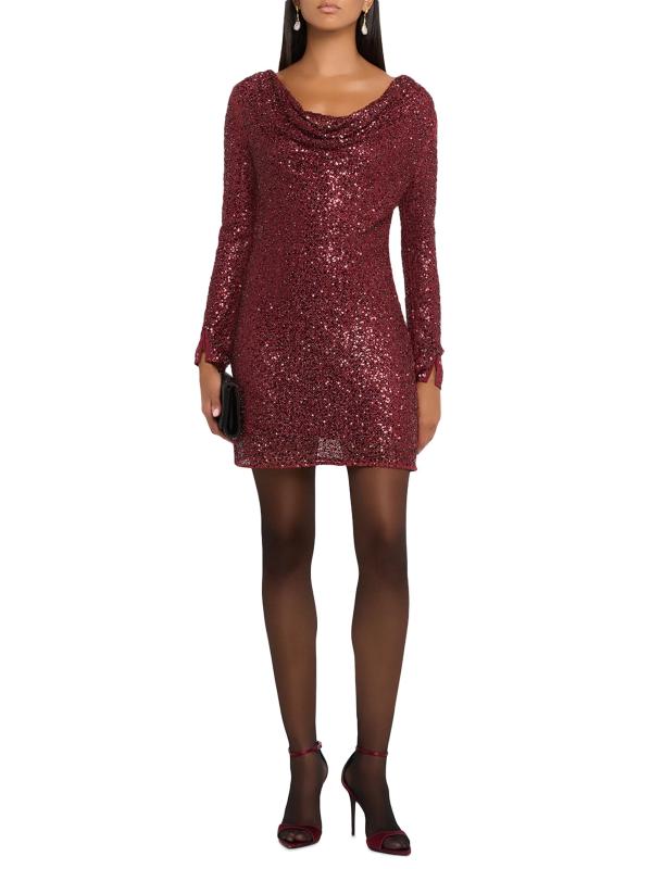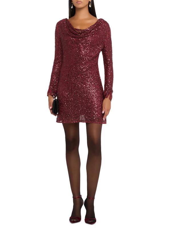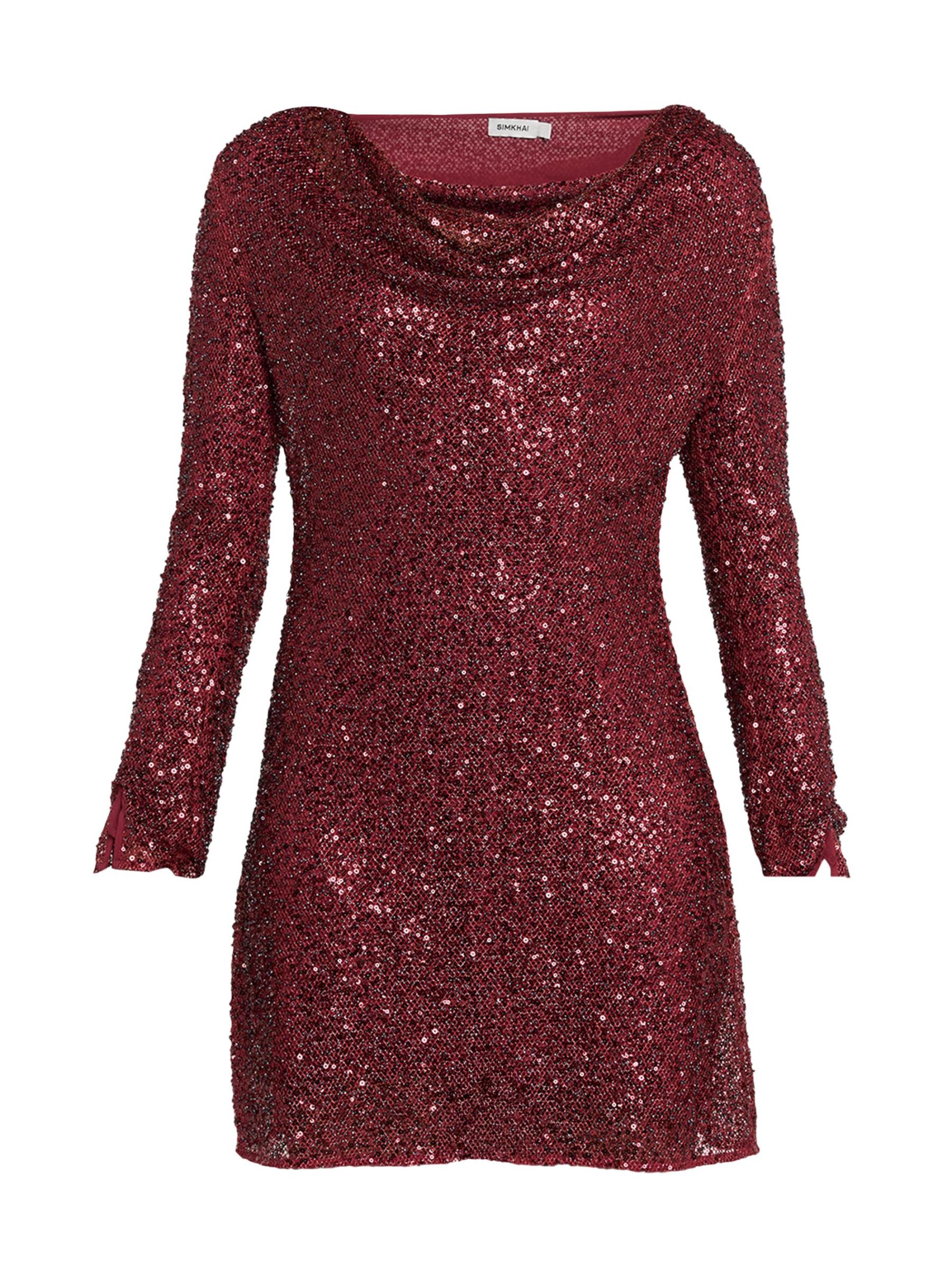يتميز فستان إيمي اللامع هذا من SIMKHAI بالترتر اللامع والخرز المعقد. تتميّز هذه القطعة ذات الطول القصير برقبة على شكل قوس وأكمام طويلة وتصميم ضيّق على شكل حرف A.