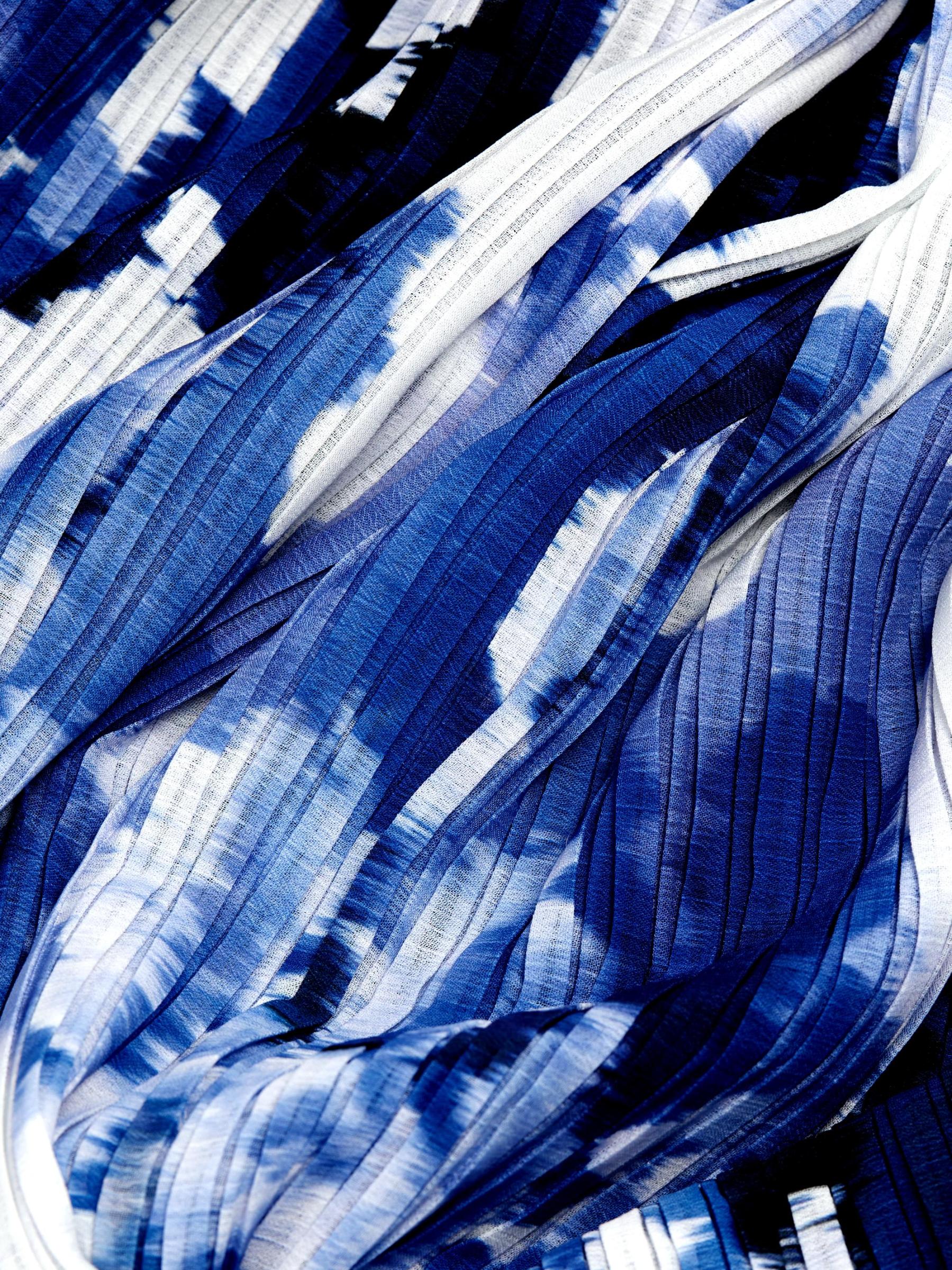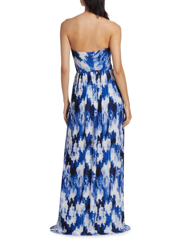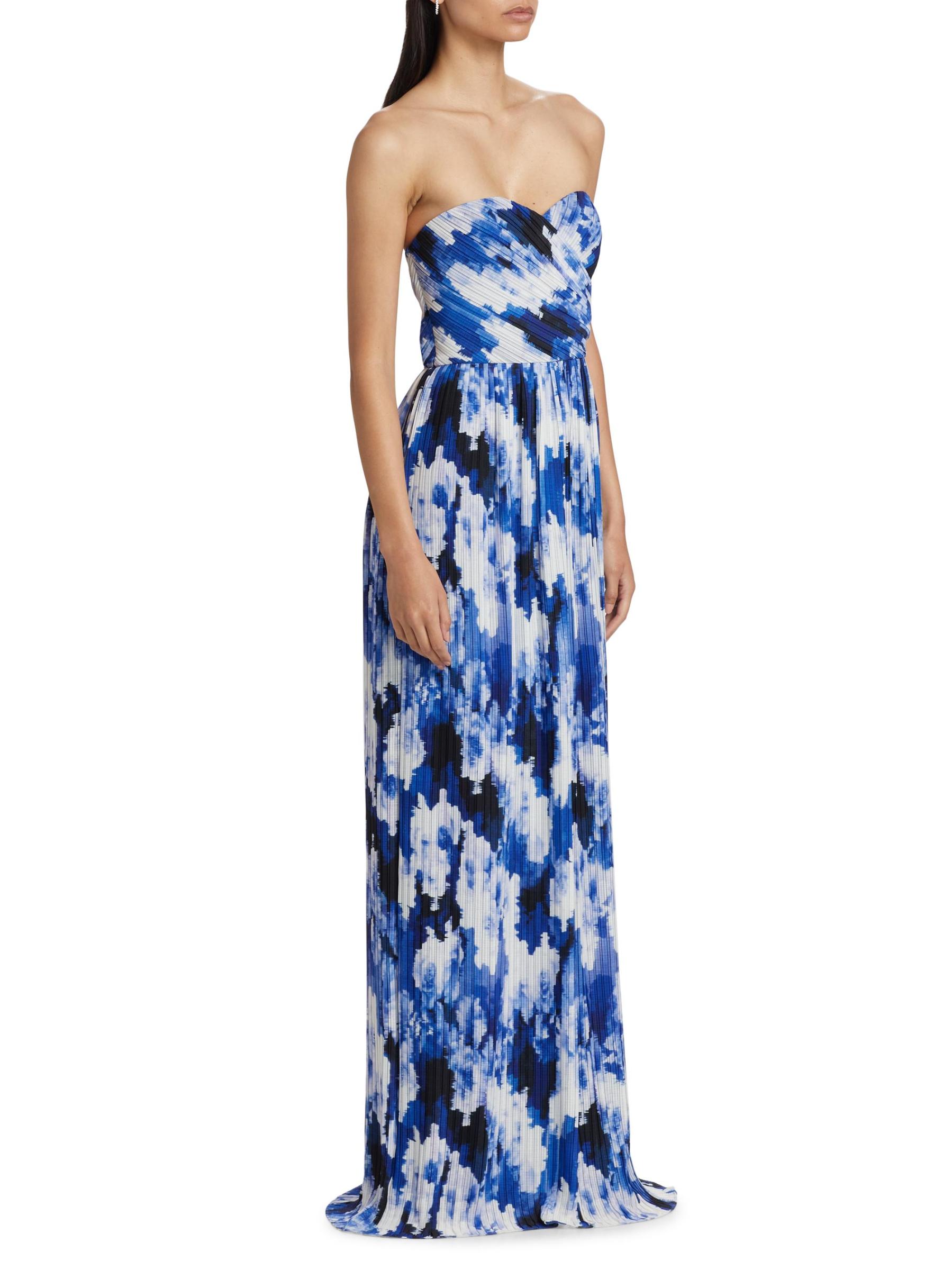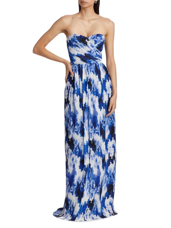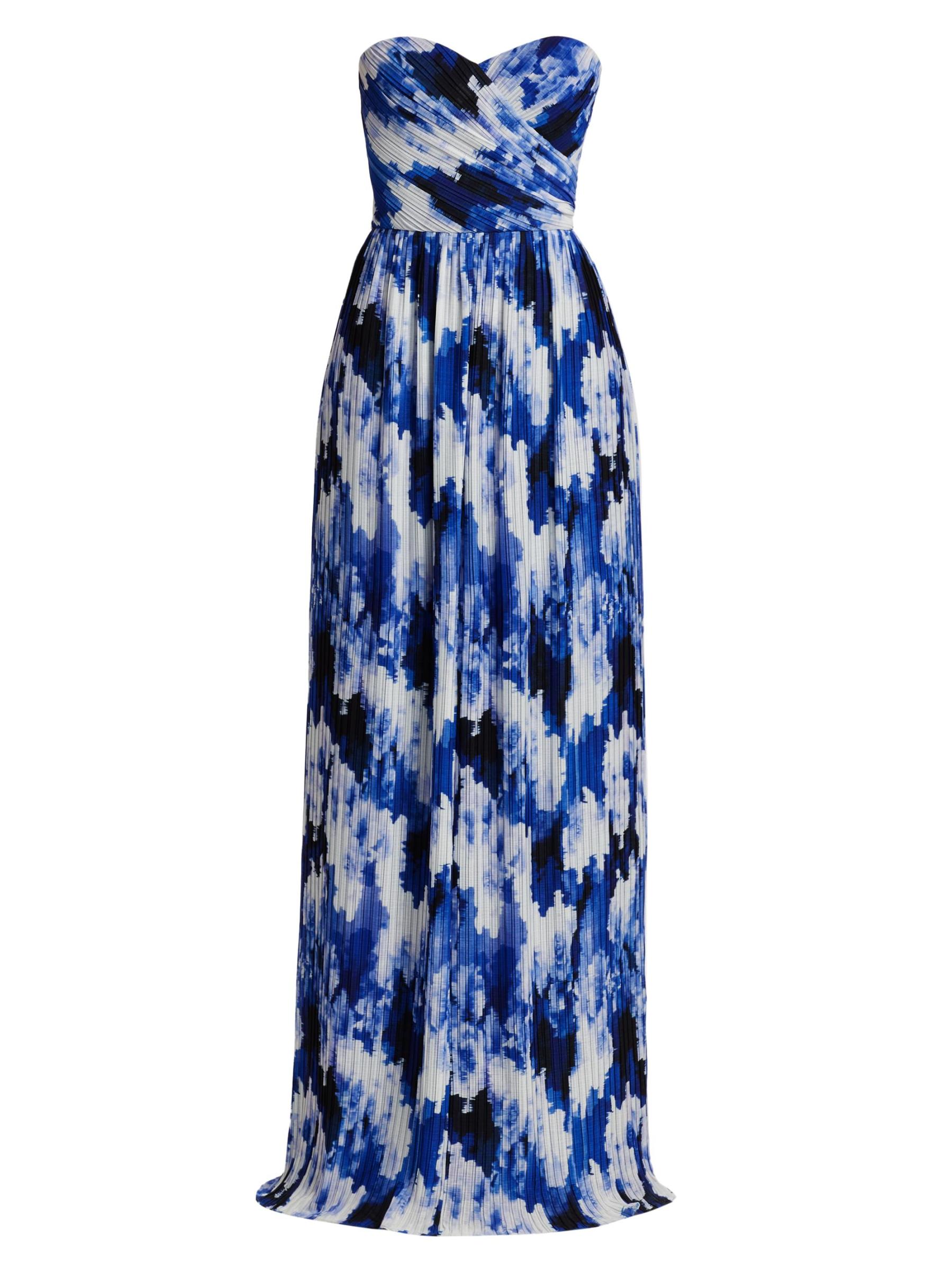 يتميّز فستان السهرة من ML Monique Lhuillier، المصنوع من الشيفون المجعد، بطبعة ساحرة مستوحاة من الألوان المائية ورقبة على شكل قلب بدون حمالات.