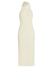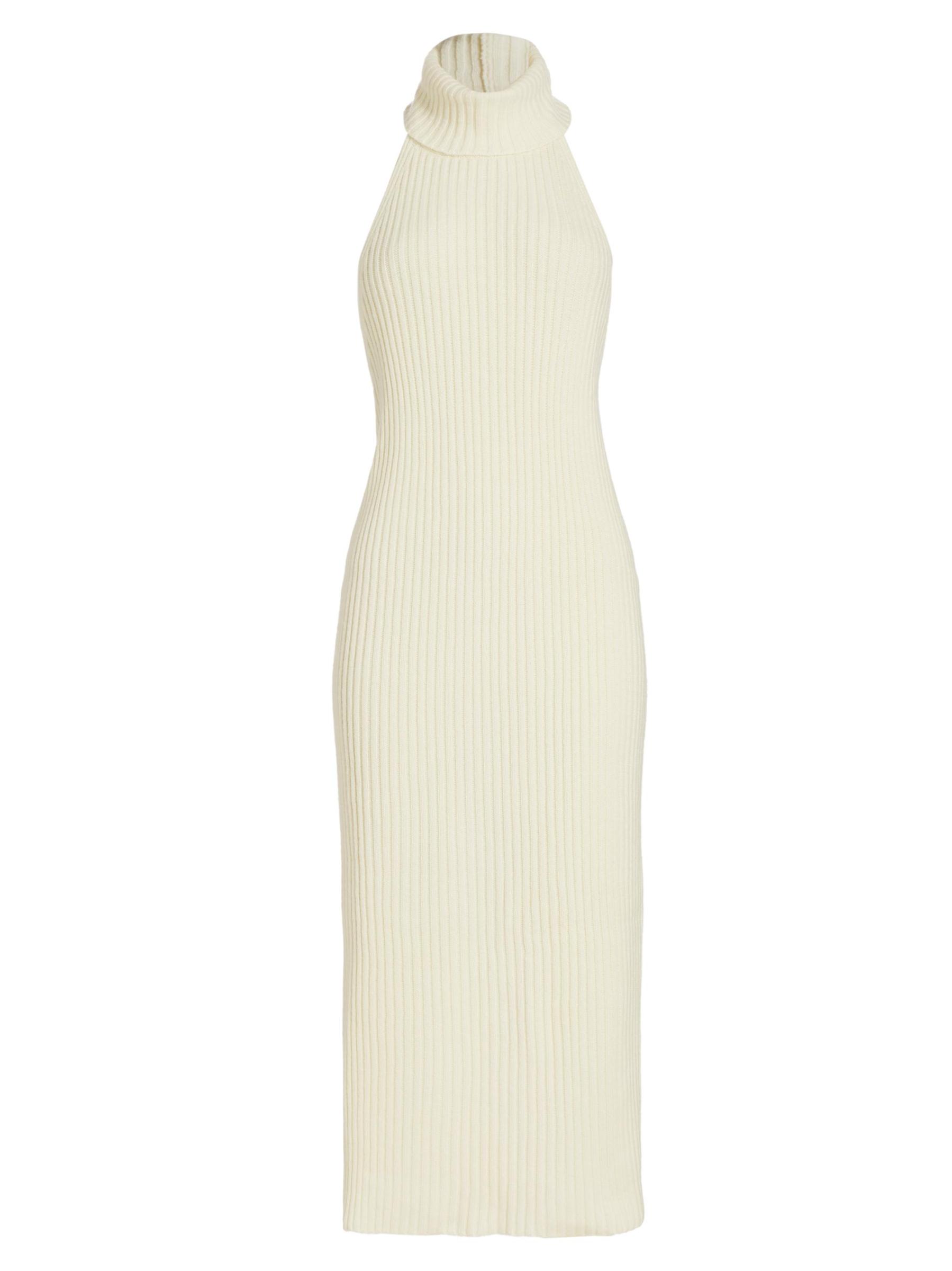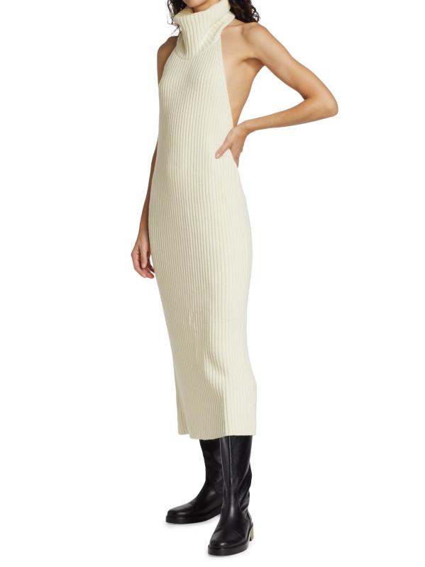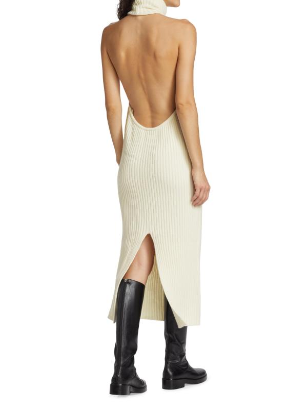 يتميّز فستان Estelle المصنوع من صوف الميرينو الفاخر والكشمير من Piece of White بياقة عالية مع فتحة ظهر مفتوحة. تم الانتهاء من هذه القطعة بشق خلفي.