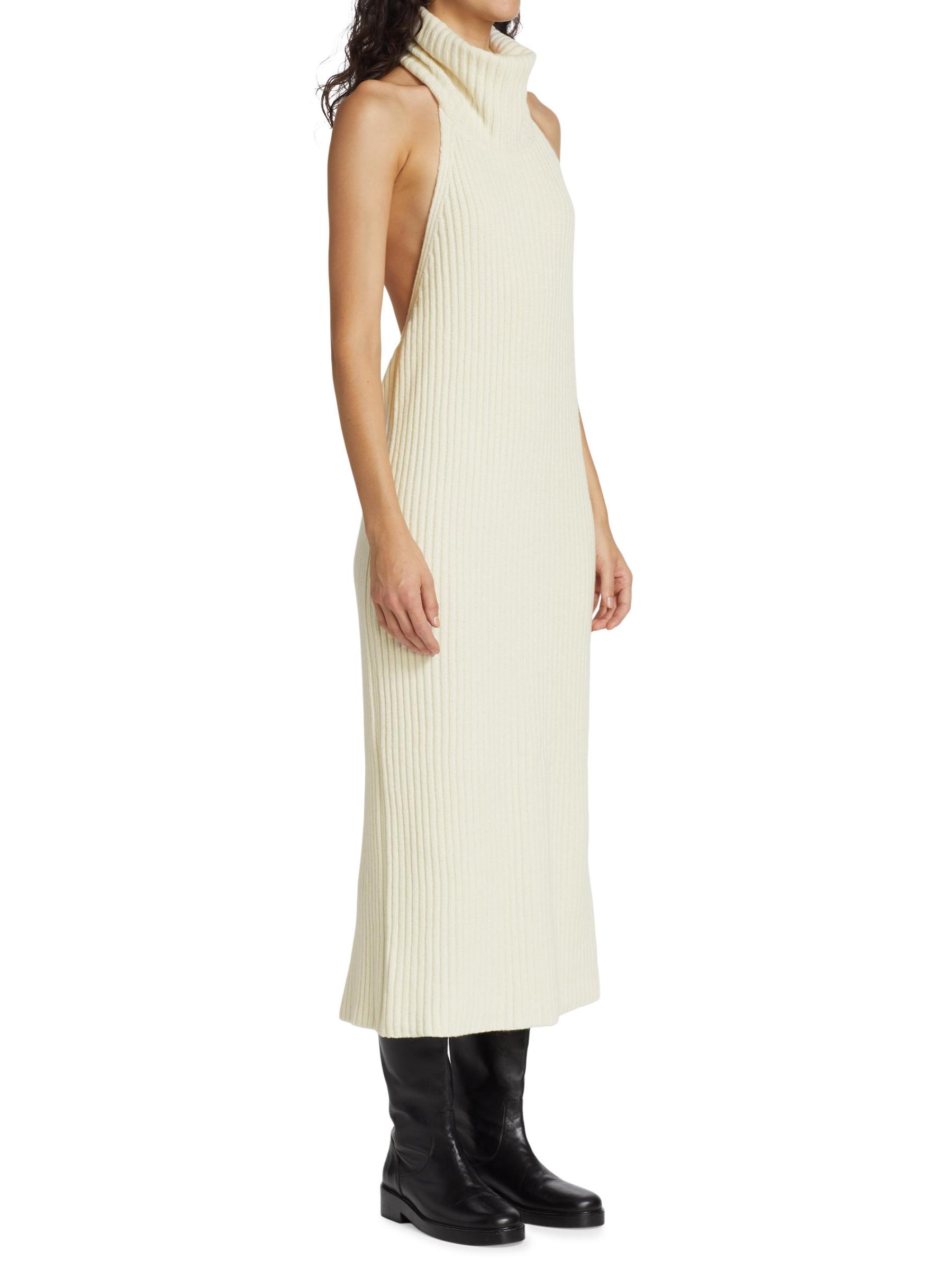 يتميّز فستان Estelle المصنوع من صوف الميرينو الفاخر والكشمير من Piece of White بياقة عالية مع فتحة ظهر مفتوحة. تم الانتهاء من هذه القطعة بشق خلفي.ياقة مدورة على شكل هالتر بدون أكمام نمط بلوفر 70% من صوف المارينو فائق النعم/ 30% من الكشمير غسيل يدوي مستوردة