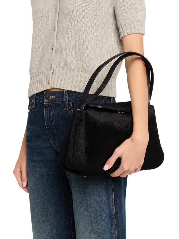 حقيبة الكتف Eudora من Themoirè مصنوعة من شعر المهر الصناعي. يتميز التصميم بتصميم ناعم مع أجزاء معدنية ذهبية اللون وغلق بغطاء.