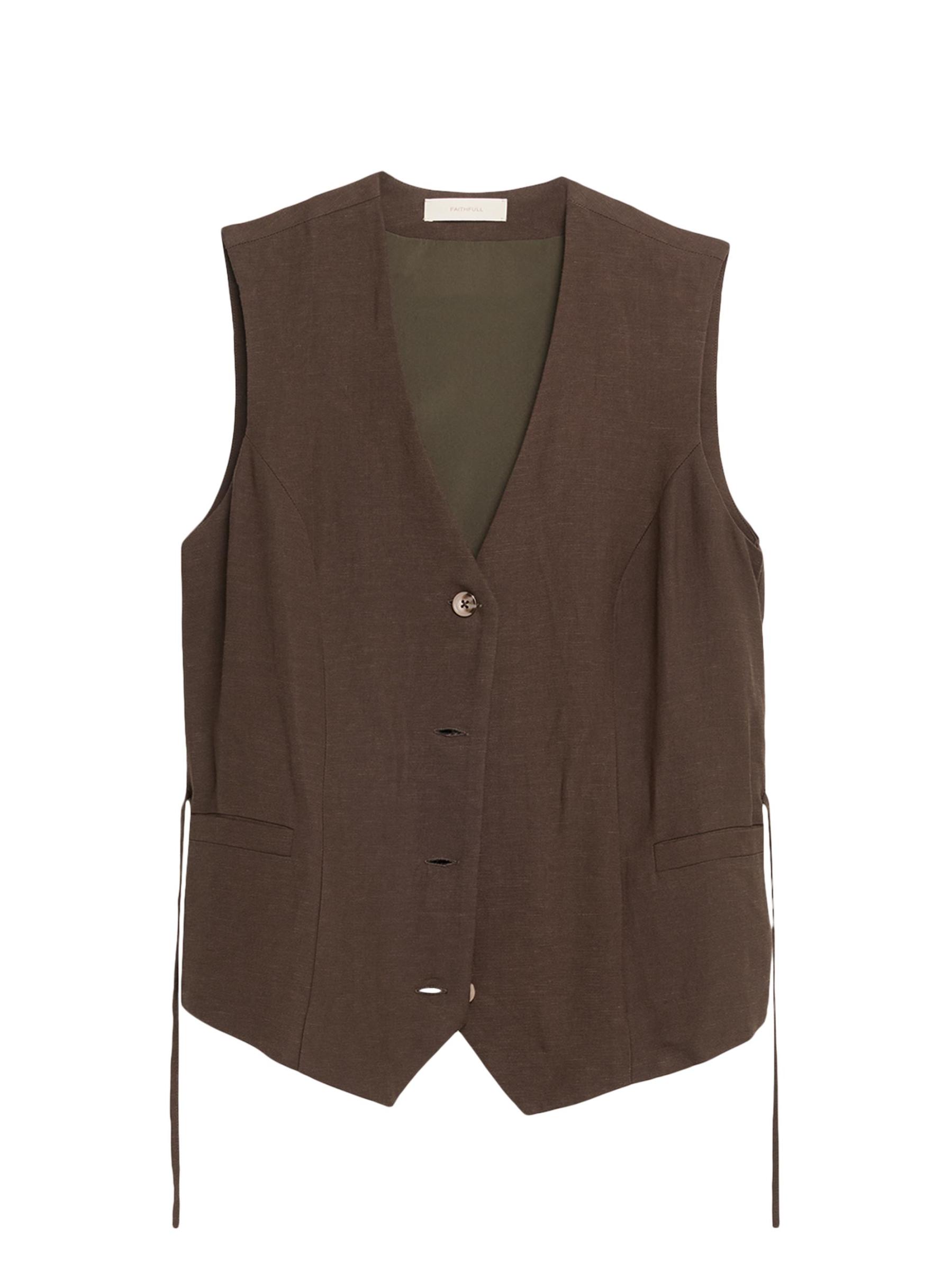 تم تصميم سترة Eva المصنوعة من مزيج الكتان من Faithfull the Brand بتصميم رقبة على شكل حرف V مستوحى من الملابس الرجالية وأربطة قابلة للتعديل حول الخصر.