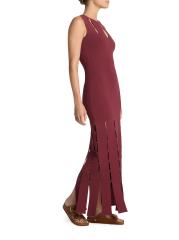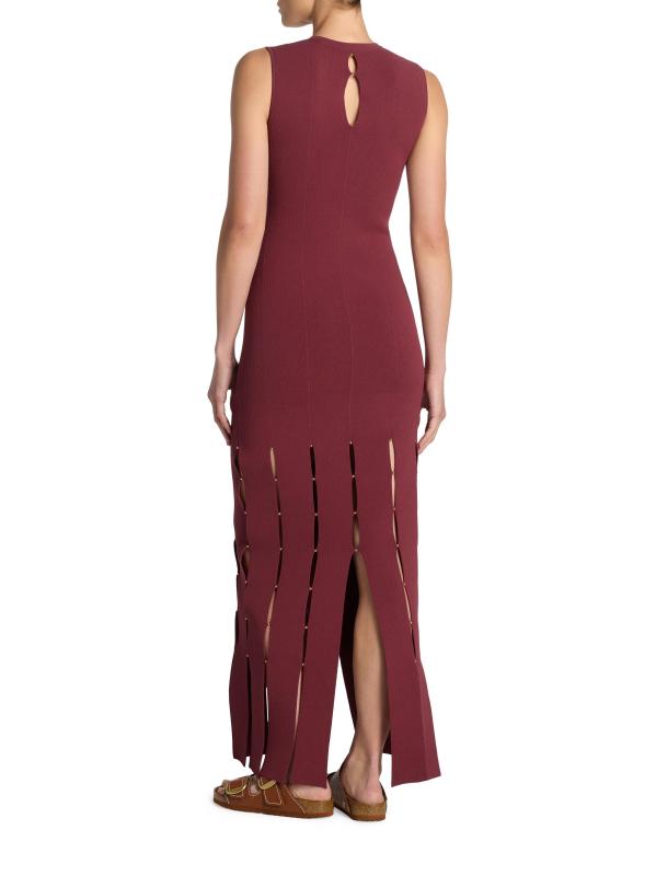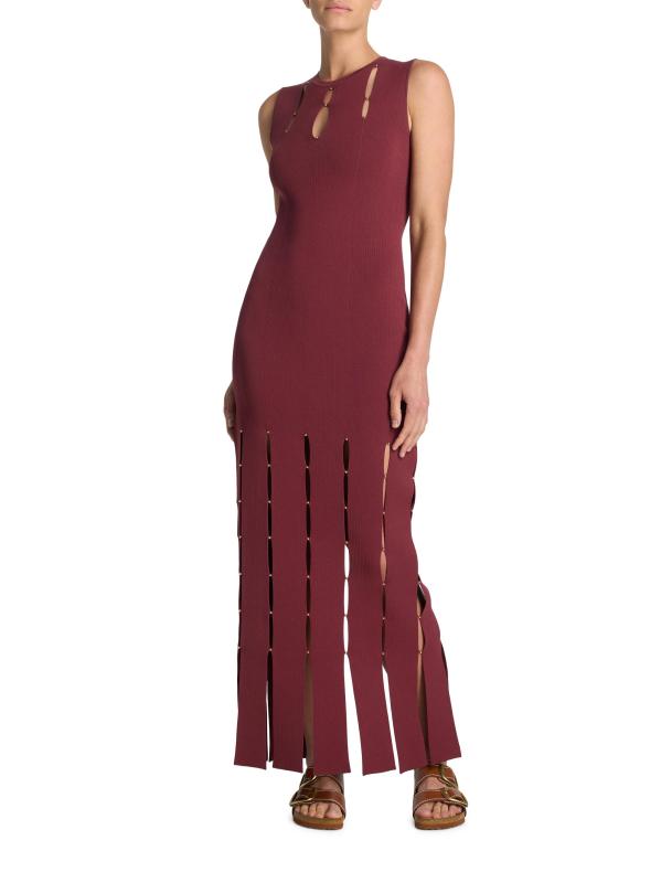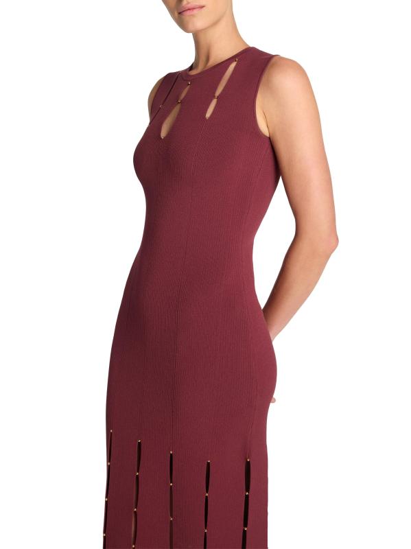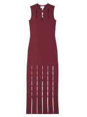 من مجموعة المساء. صُمم هذا الفستان المحبوك المزيّن بالخرز من سانت جون بفتحات عند الصدّار، ويتميز برقبة دائرية كلاسيكية وتصميم بلا أكمام.
