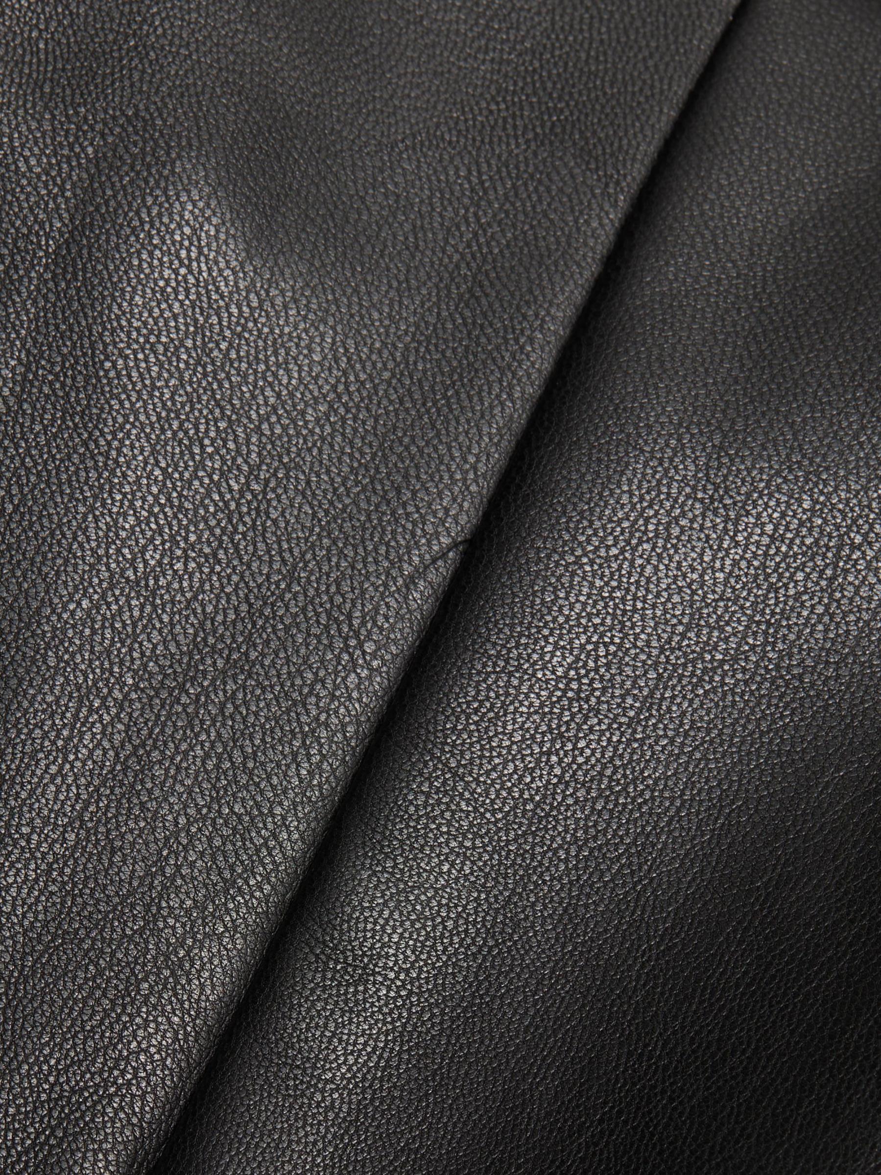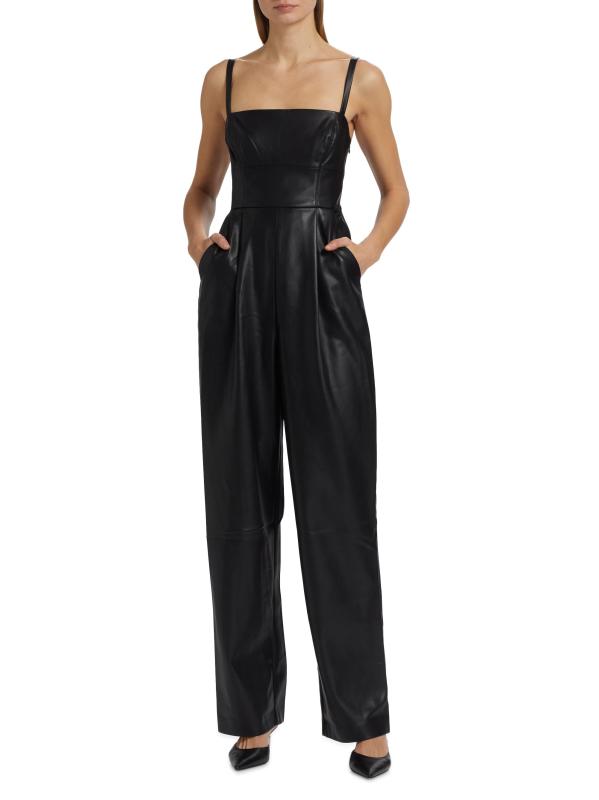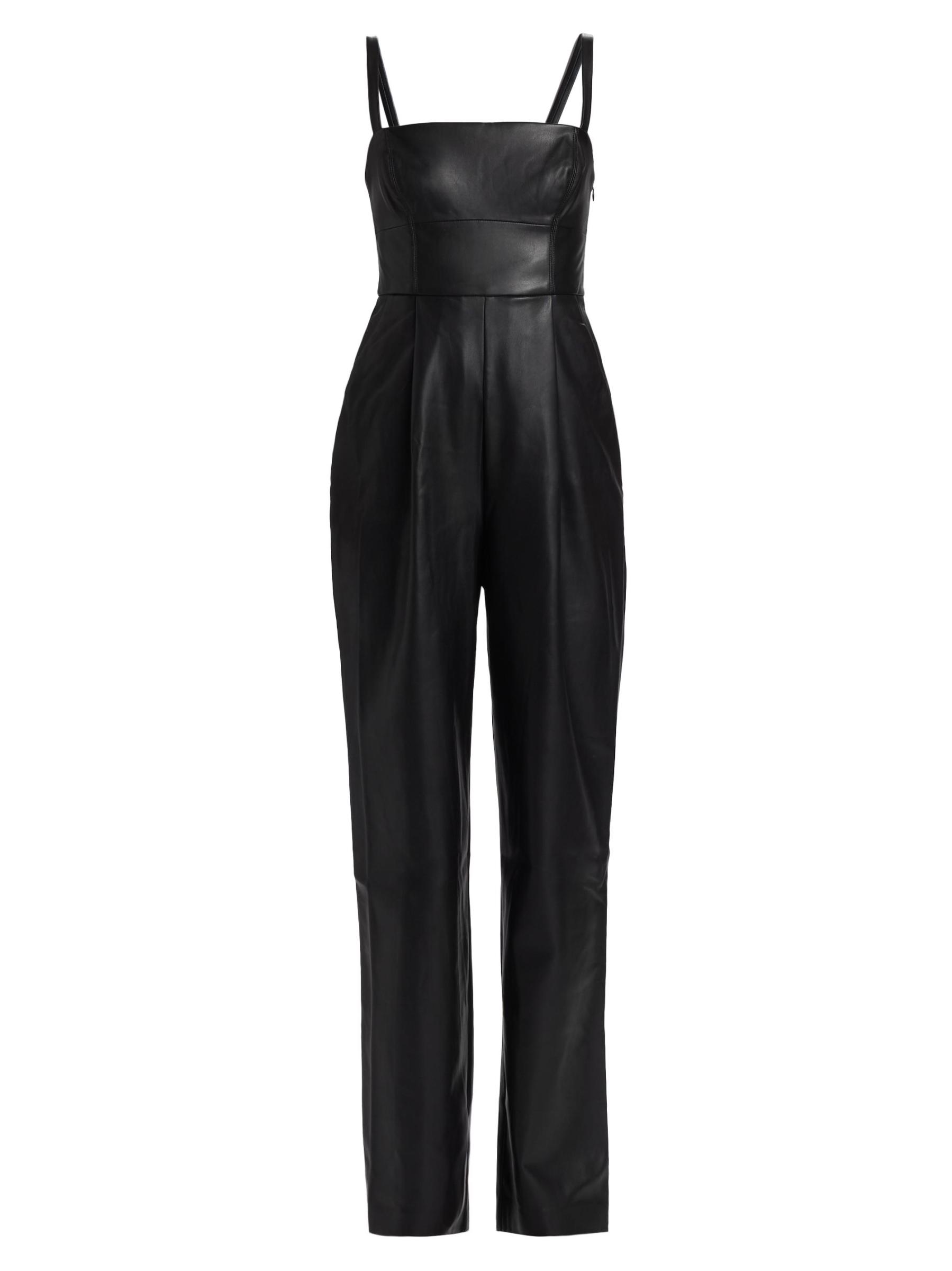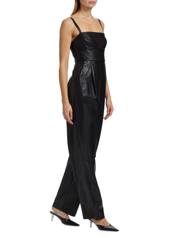 تم تصميم بذلة سوزانا موناكو بدون أكمام ذات رقبة مربعة مصنوعة من الجلد الصناعي في شكل مرتفع بأرجل مستقيمة.