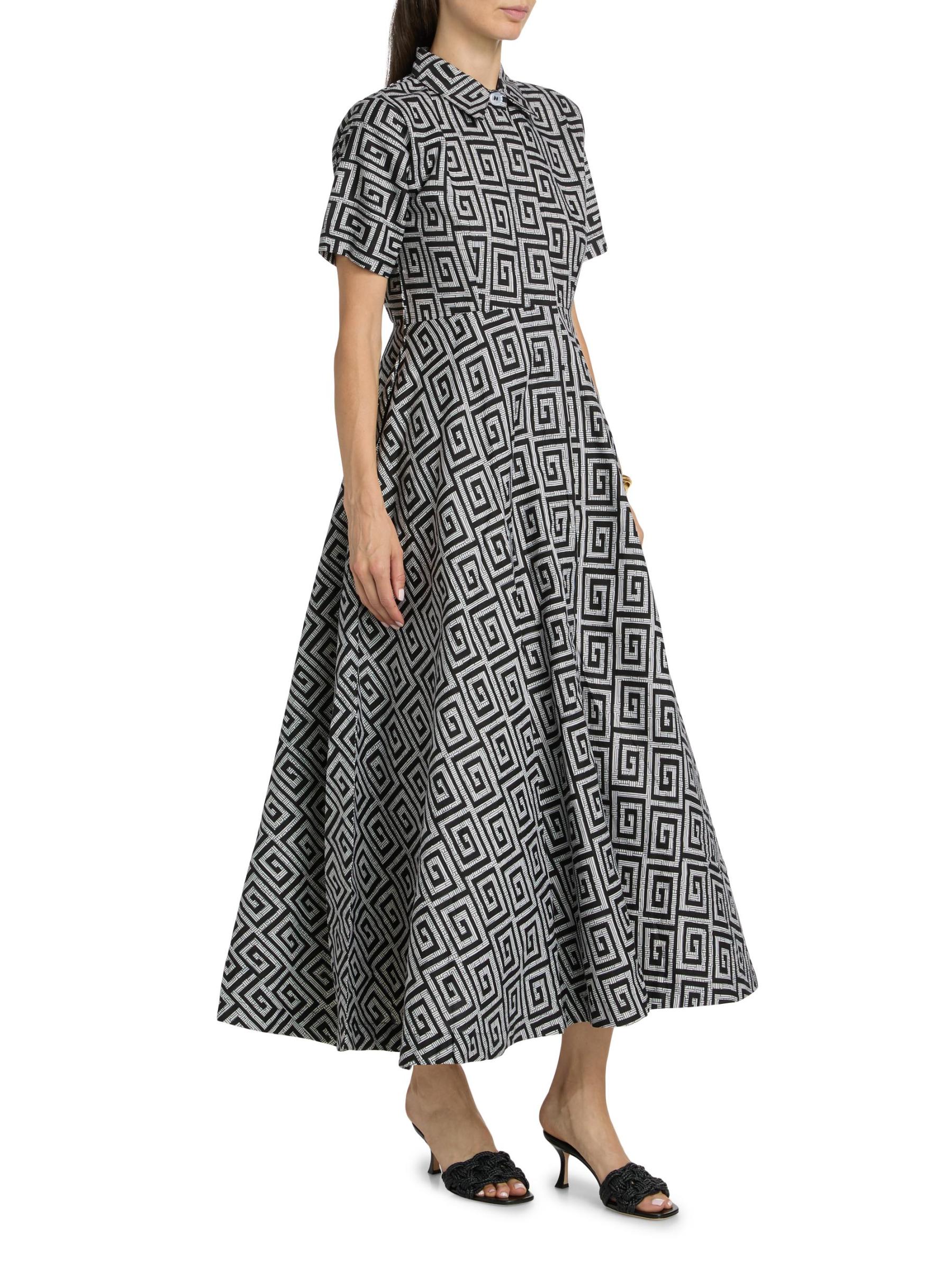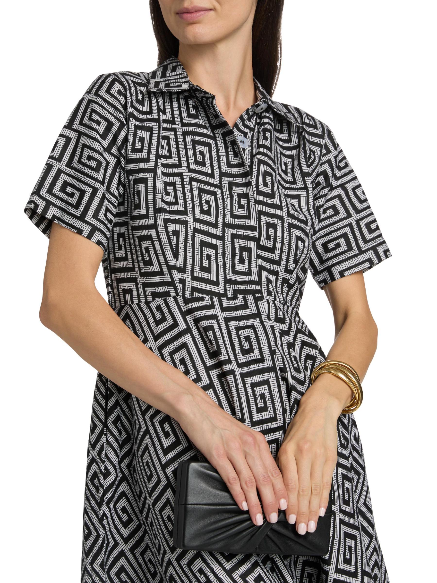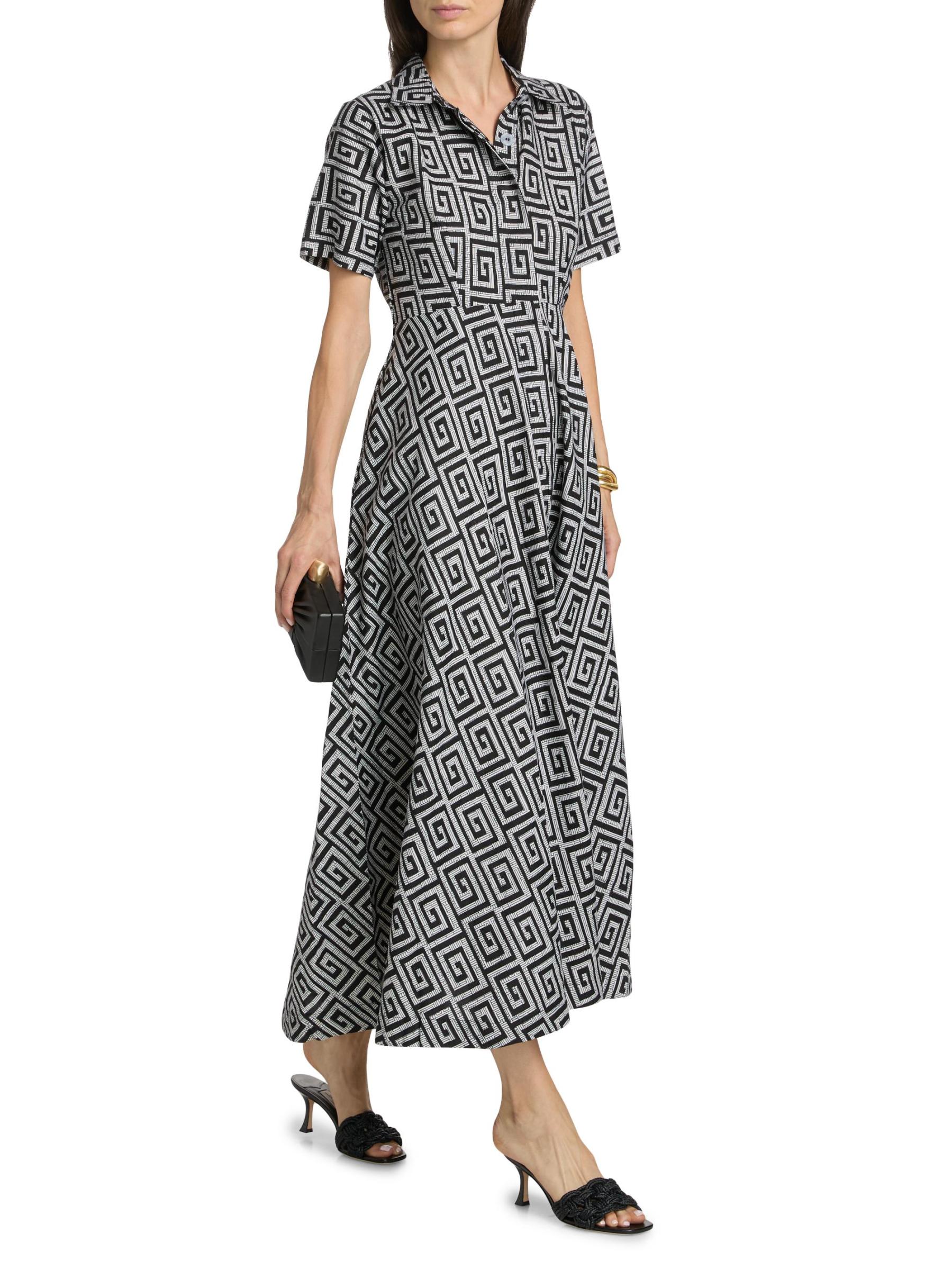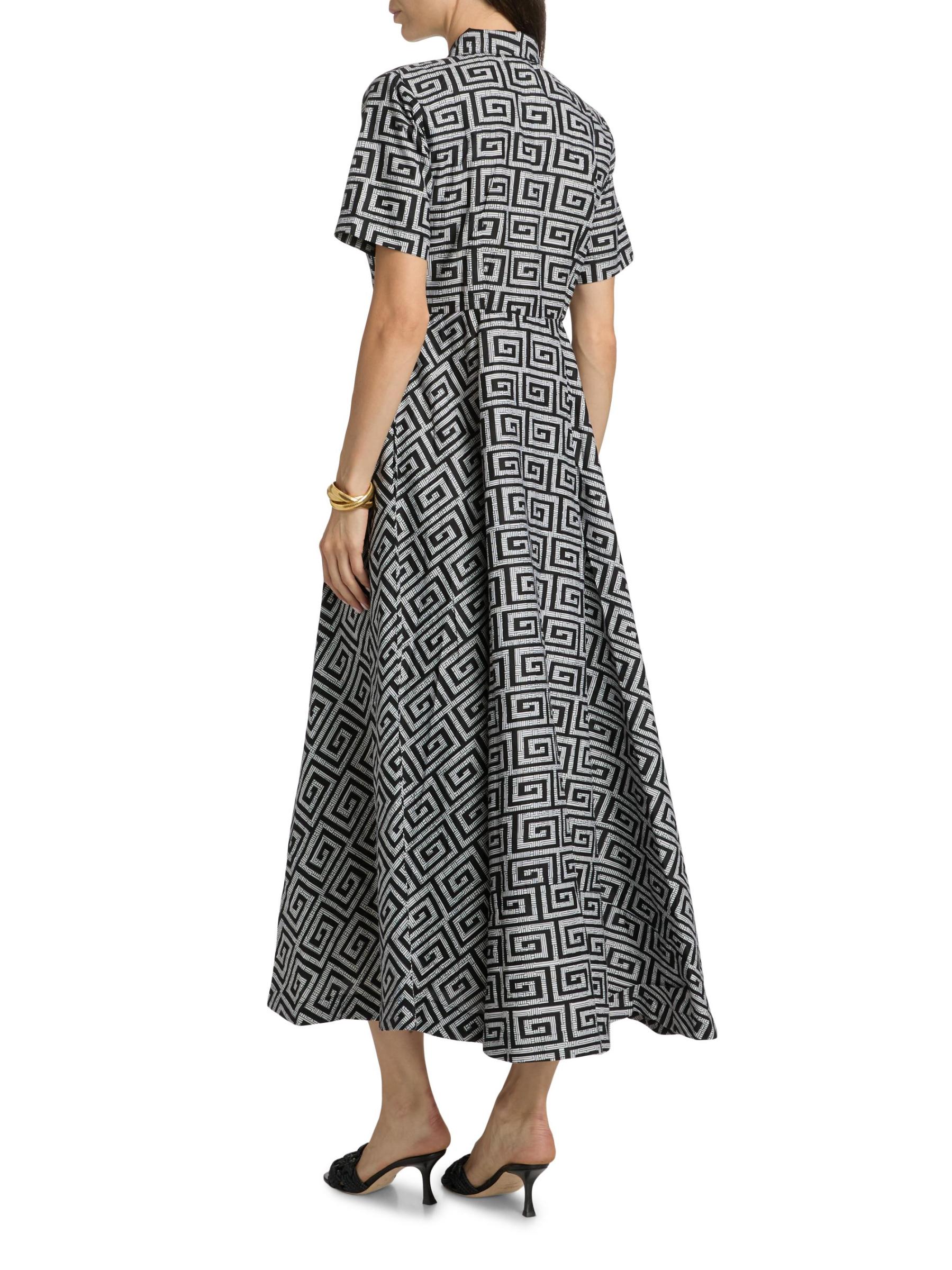 يتميز هذا الفستان الطويل ذو الشكل الهرمي من Feyi بأكمام قصيرة من Elisamama، والمصنوع من القطن، بطبعة هندسية وجيوب جانبية منزلقة وياقة واسعة.