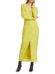 تضفي الأكمام الطويلة المكشكشة لمسة من الأناقة على فستان الكوكتيل هذا من تصميم أليخاندرا ألونسو روخاس. يتميز الثوب برقبة واسعة على شكل حرف V وخصر مبطّن وشق أمامي.