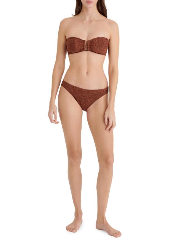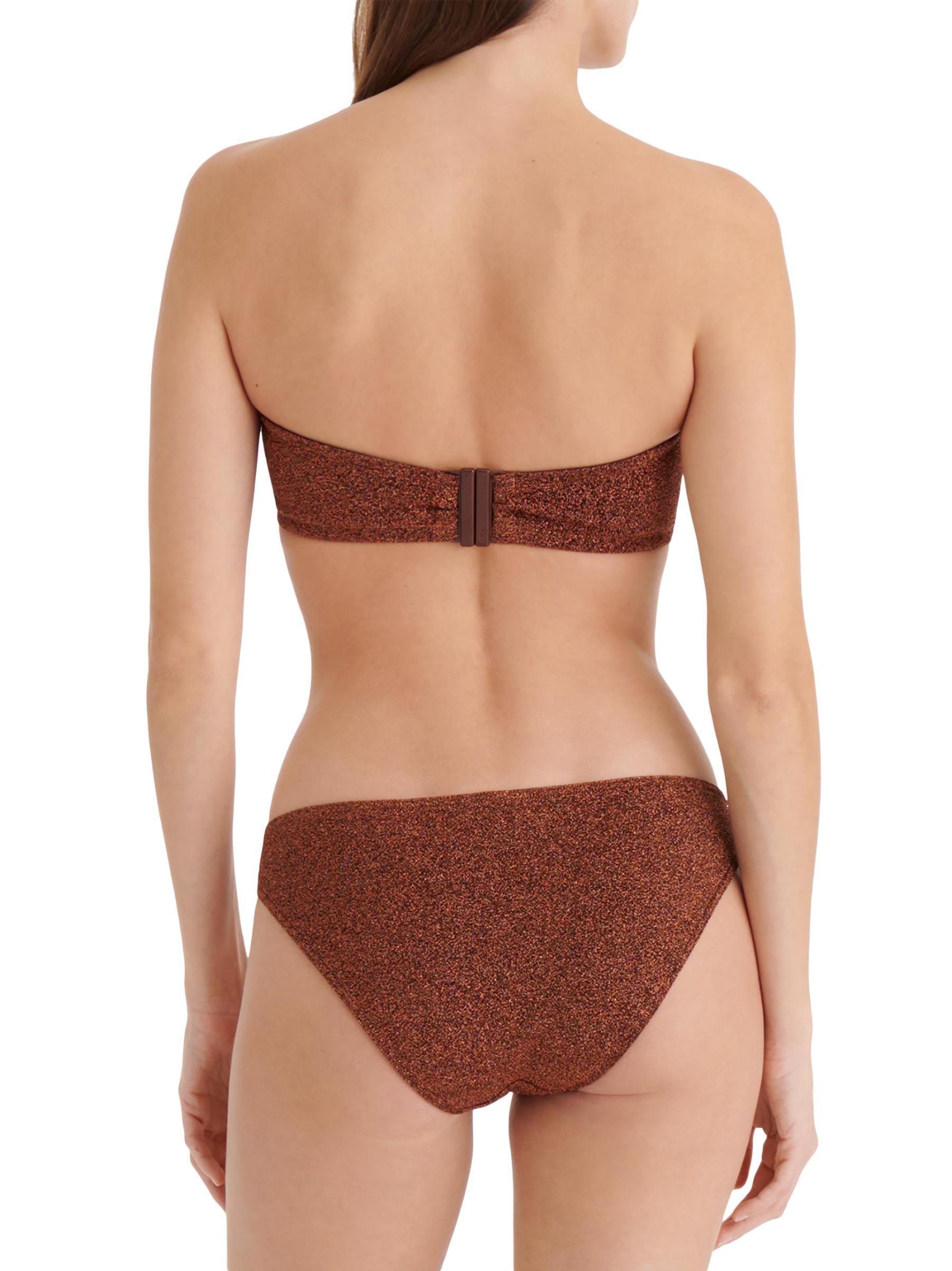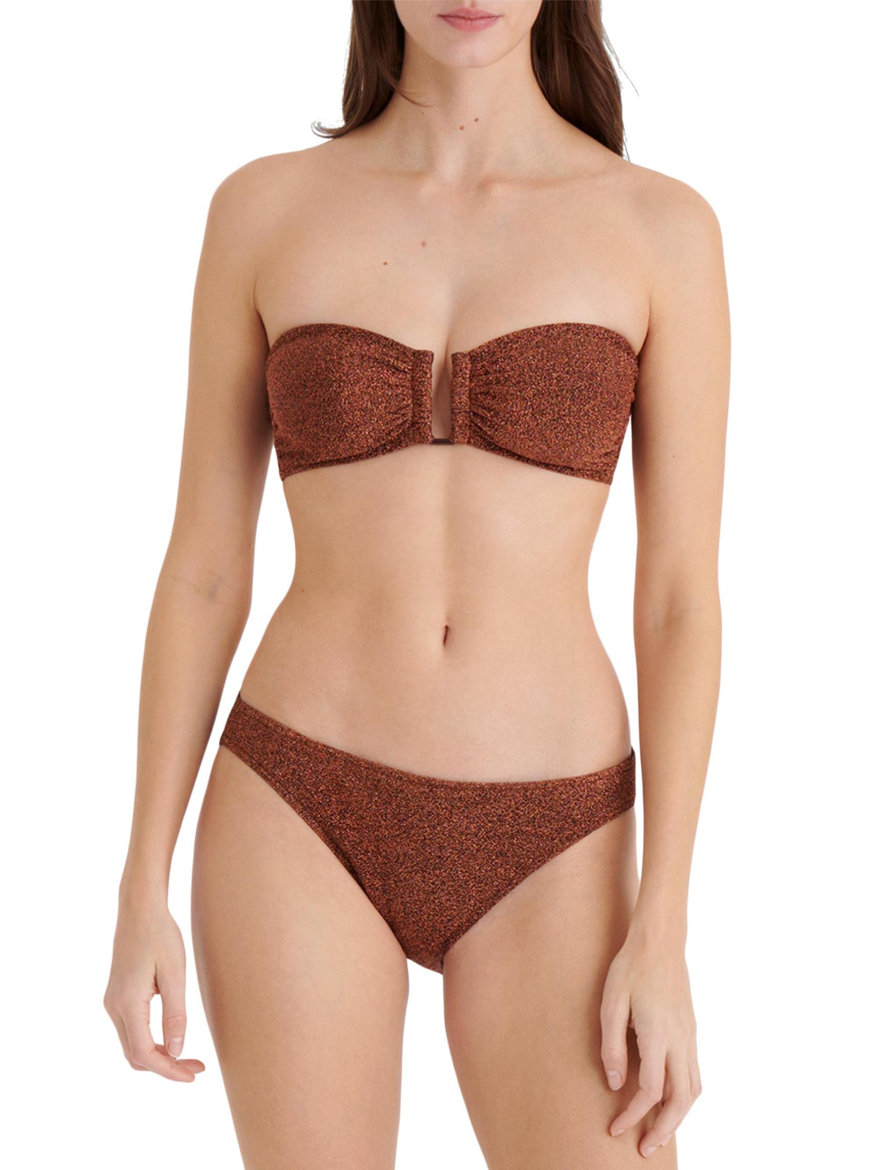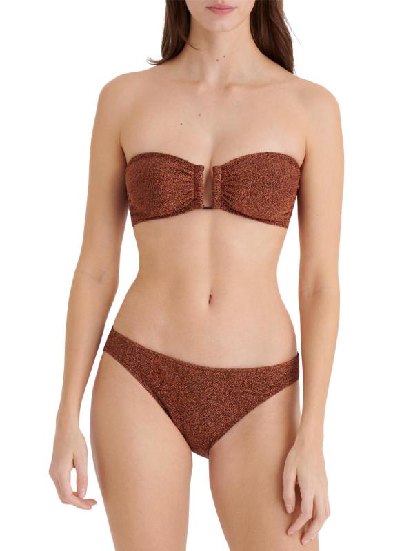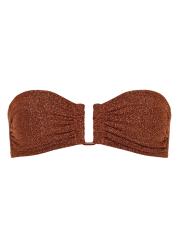 بلوزة البكيني اللامعة بدون حمالات من ERES مصنوعة من قماش مطاطي لامع ومزينة بحلقة على شكل حرف U عند الرقبة على شكل قلب.