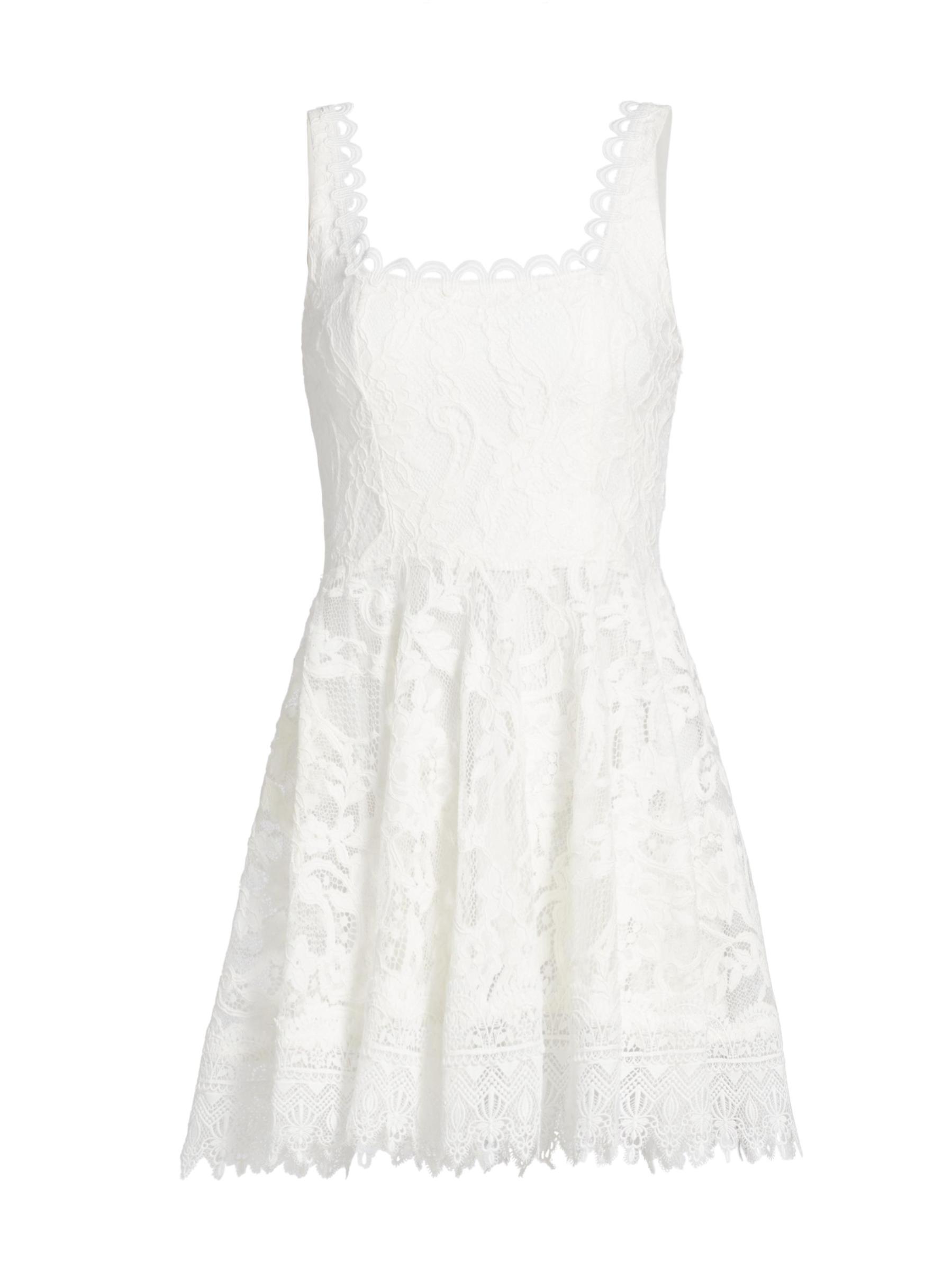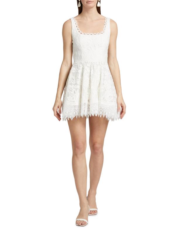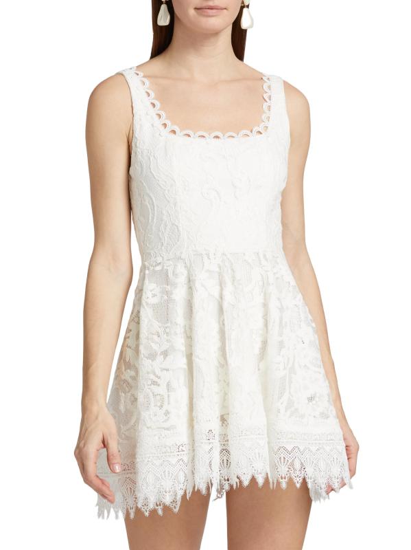 من مجموعة فلور ديل فينتو. تم تصميم هذا الفستان القصير من الدانتيل Havana بدون أكمام من Waimari بتصميم على شكل حرف A ورقبة مربعة صدفية.