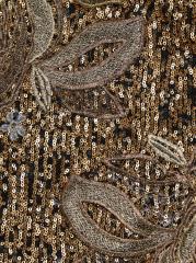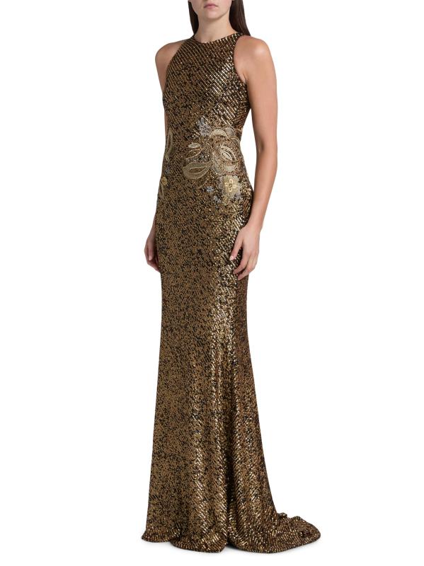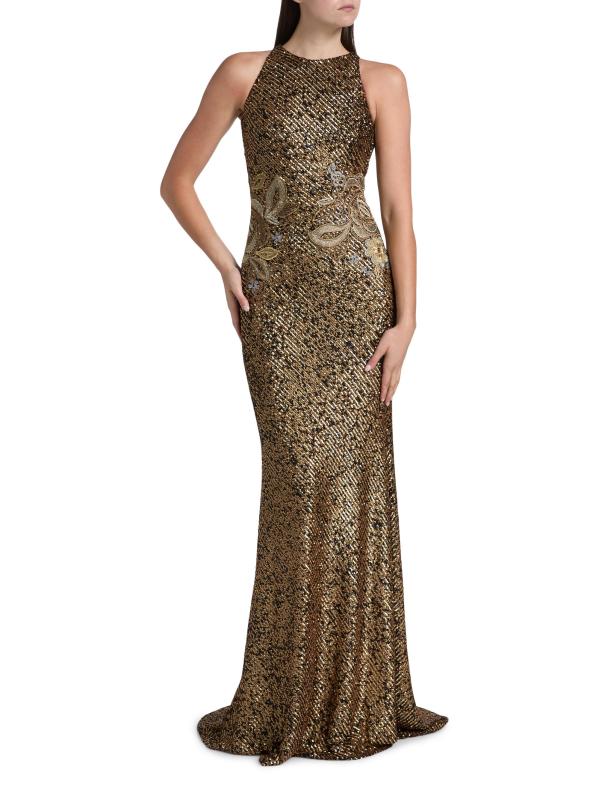 يتميّز هذا الفستان ذو الرقبة الرسن من نعيم خان، المصنوع من قماش الترتر القابل للتمدد، بتطريزات زهرية عند الخصر.