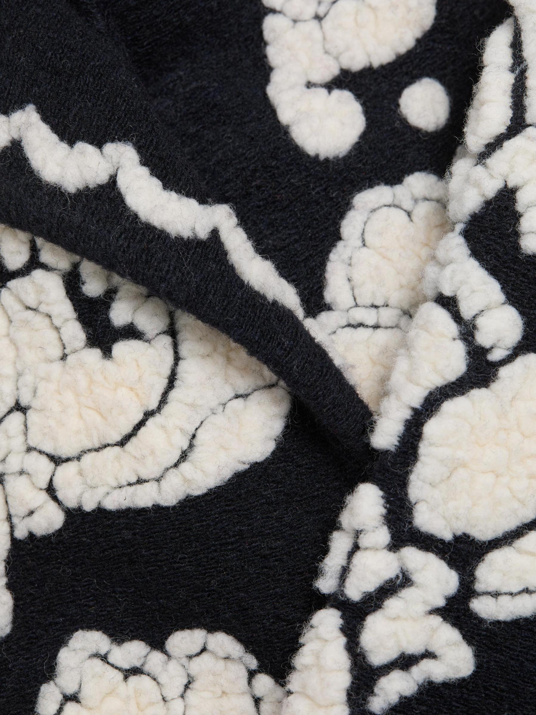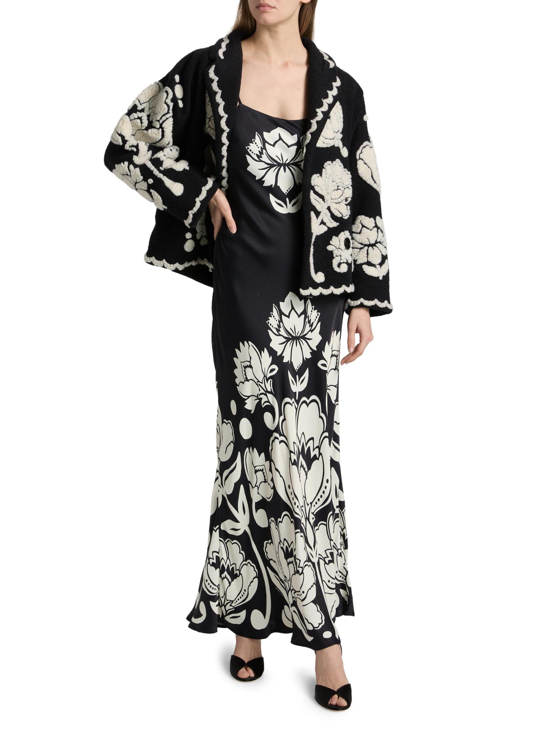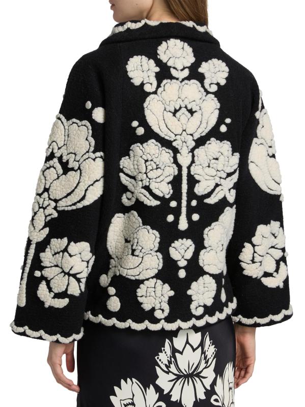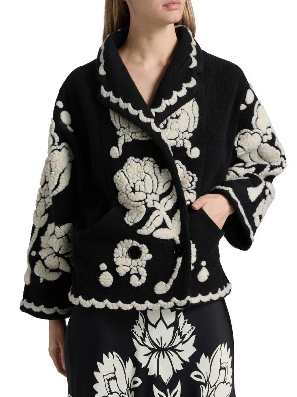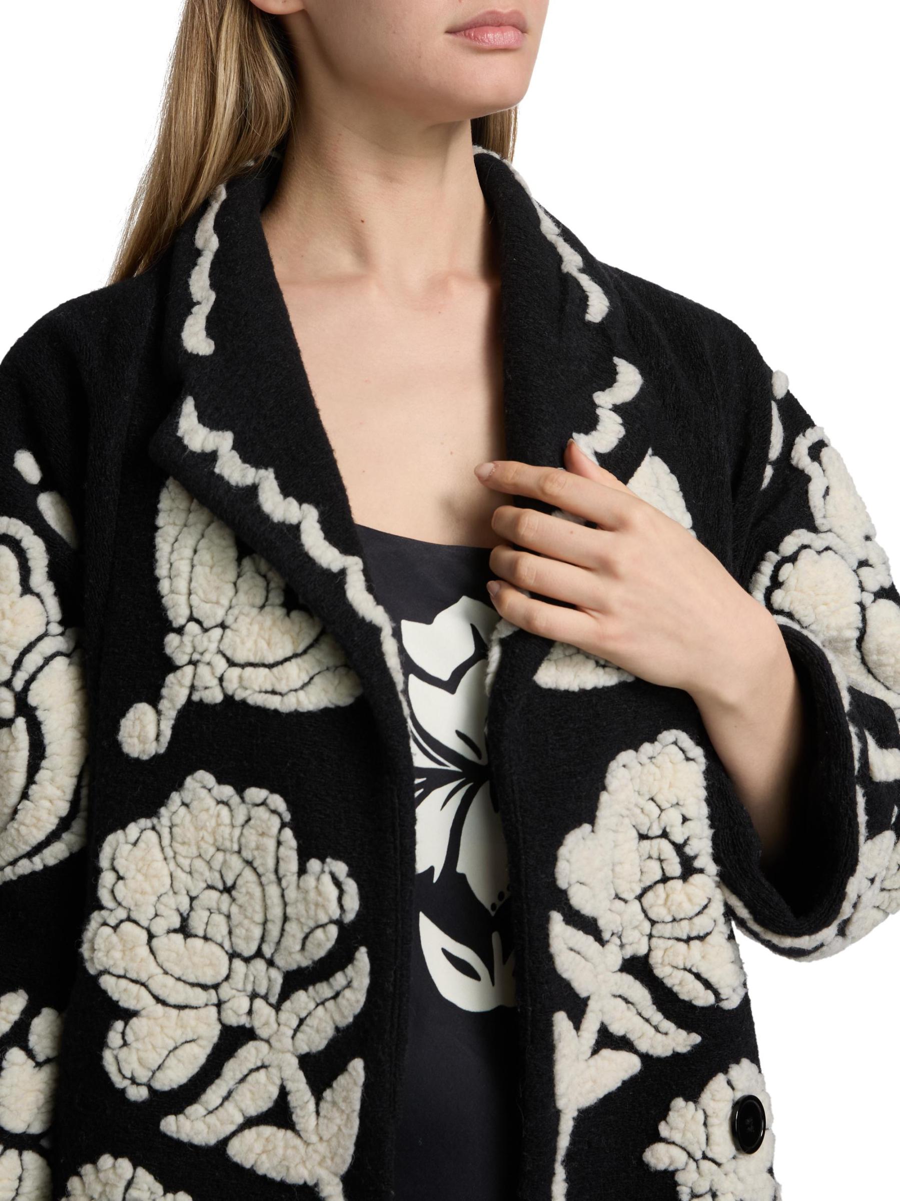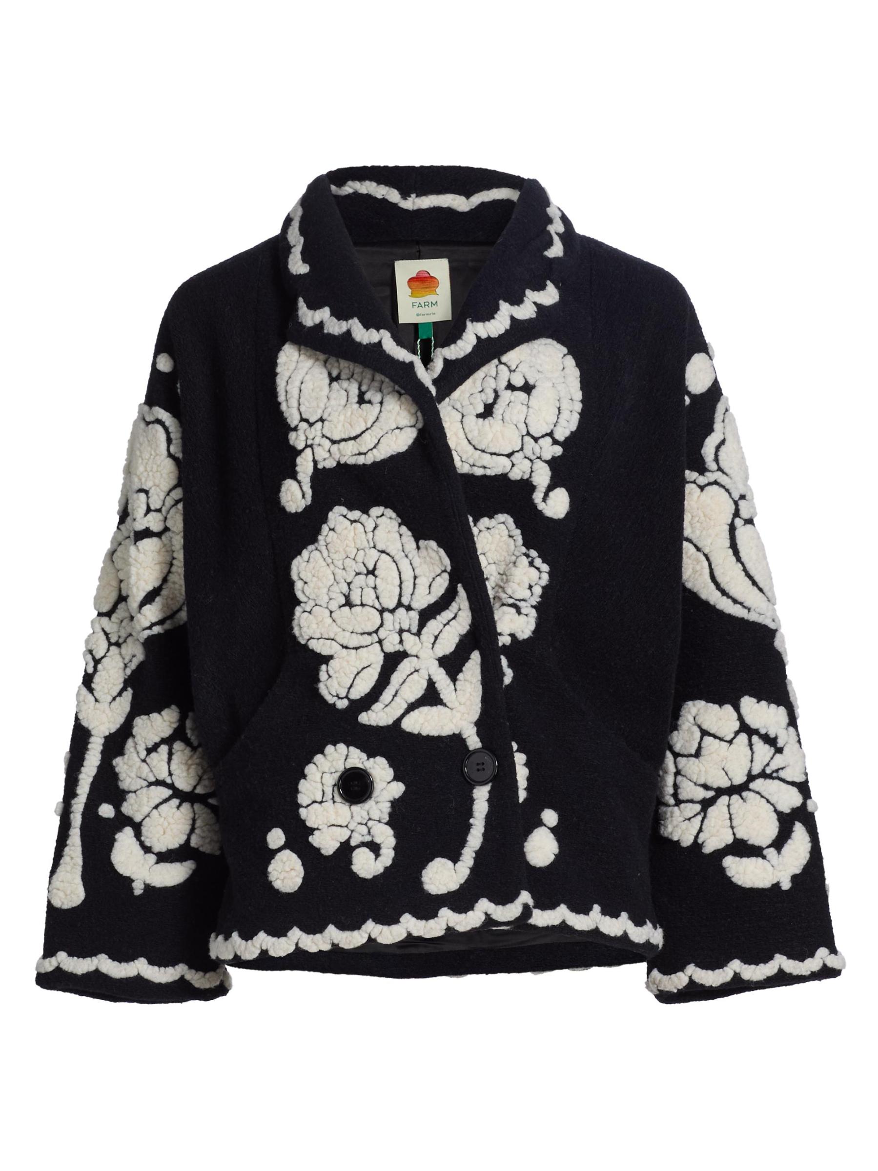يتميز معطف الأرابيسك الزهري هذا من فارم ريو، المصنوع من الصوف، بياقة مدببة وجيوب جانبية منزلقة وزر إغلاق واحد.
