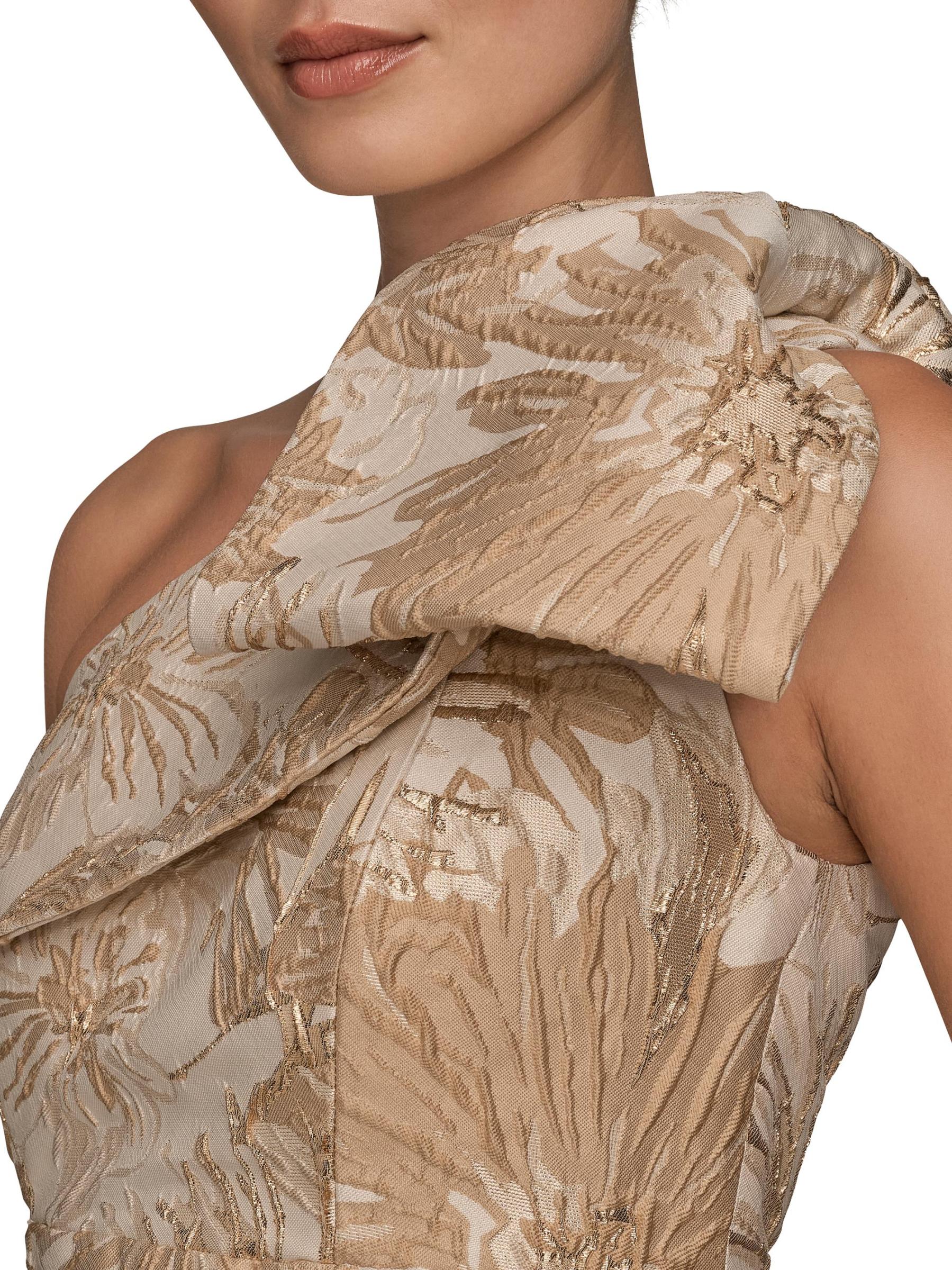 يتميز فستان DKNY هذا، المصمم بشكل بوق، بزخرفة زهرية معقدة. فيونكة كبيرة الحجم تزين خط العنق بكتف واحد للحصول على لمسة نهائية راقية.فتحة رقبة بكتف واحد بدون أكمام حافة على شكل بوق إغلاق بسحّاب جانبي 85% بوليستر/ 15% ميتاليك تنظيف جاف مستوردة