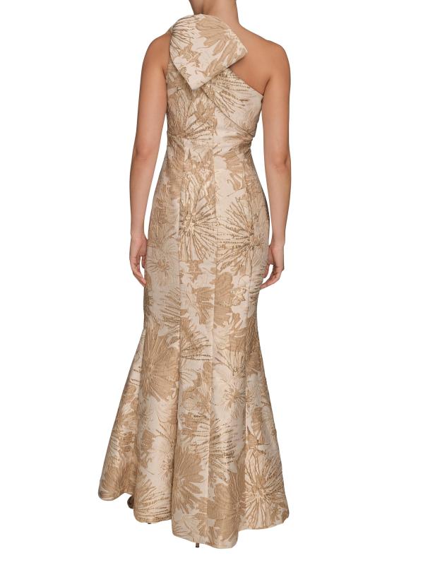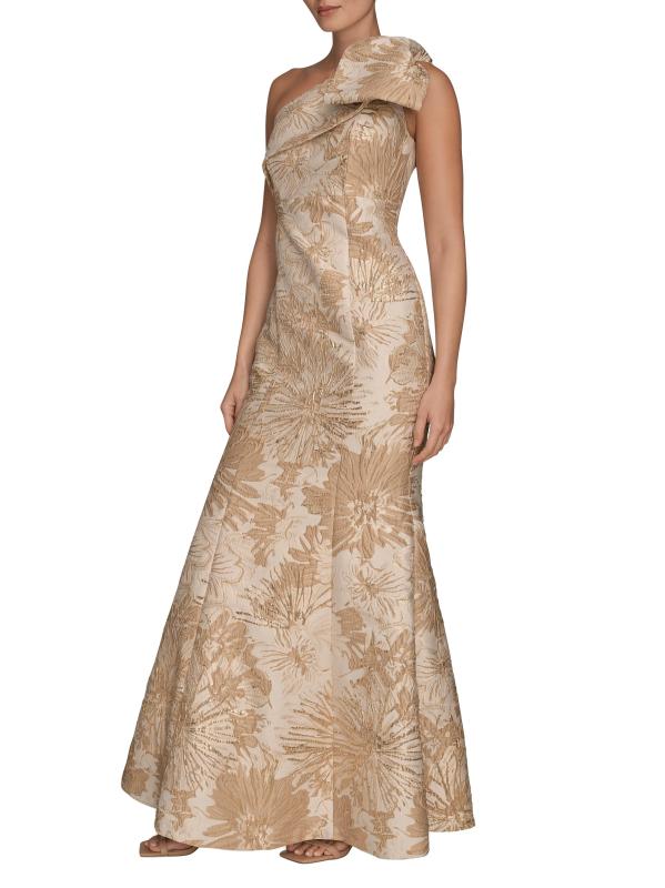 يتميز فستان DKNY هذا، المصمم بشكل بوق، بزخرفة زهرية معقدة. فيونكة كبيرة الحجم تزين خط العنق بكتف واحد للحصول على لمسة نهائية راقية.