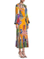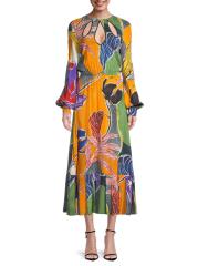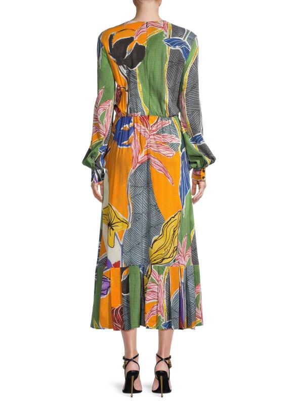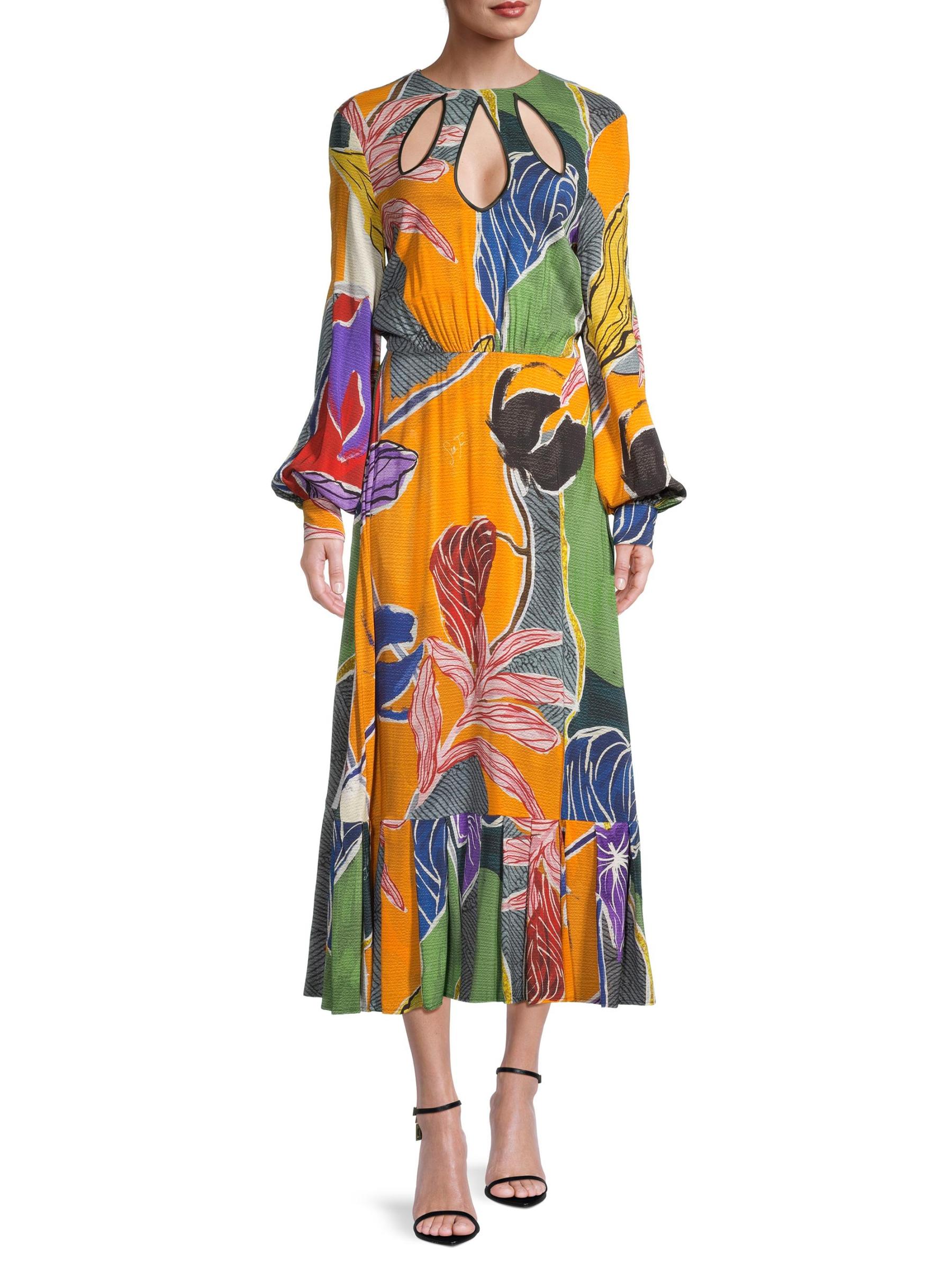 يتميز هذا الفستان الطويل ذو الأكمام البالونية من Stella Jean بطبعات زهرية كبيرة وفتحات مطرزة على الصدر.