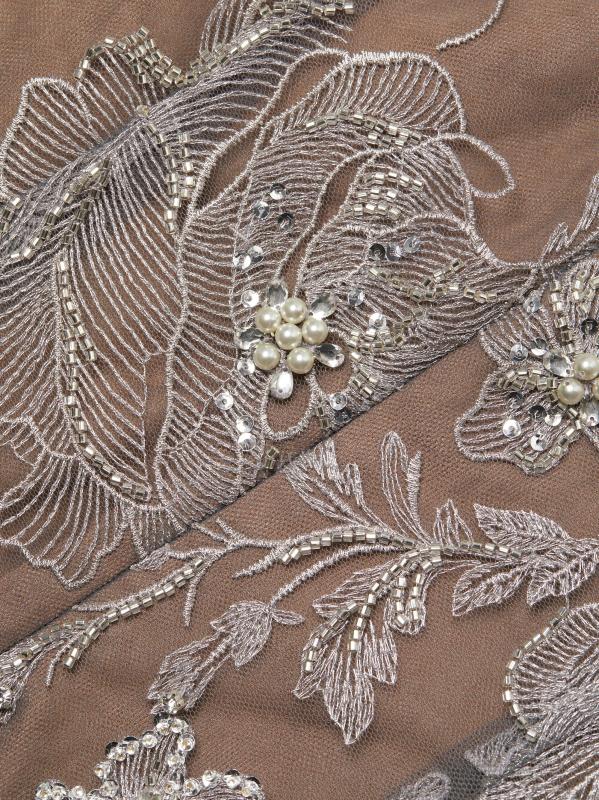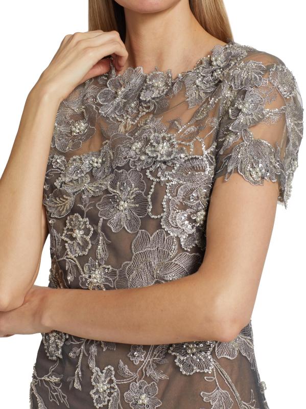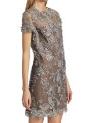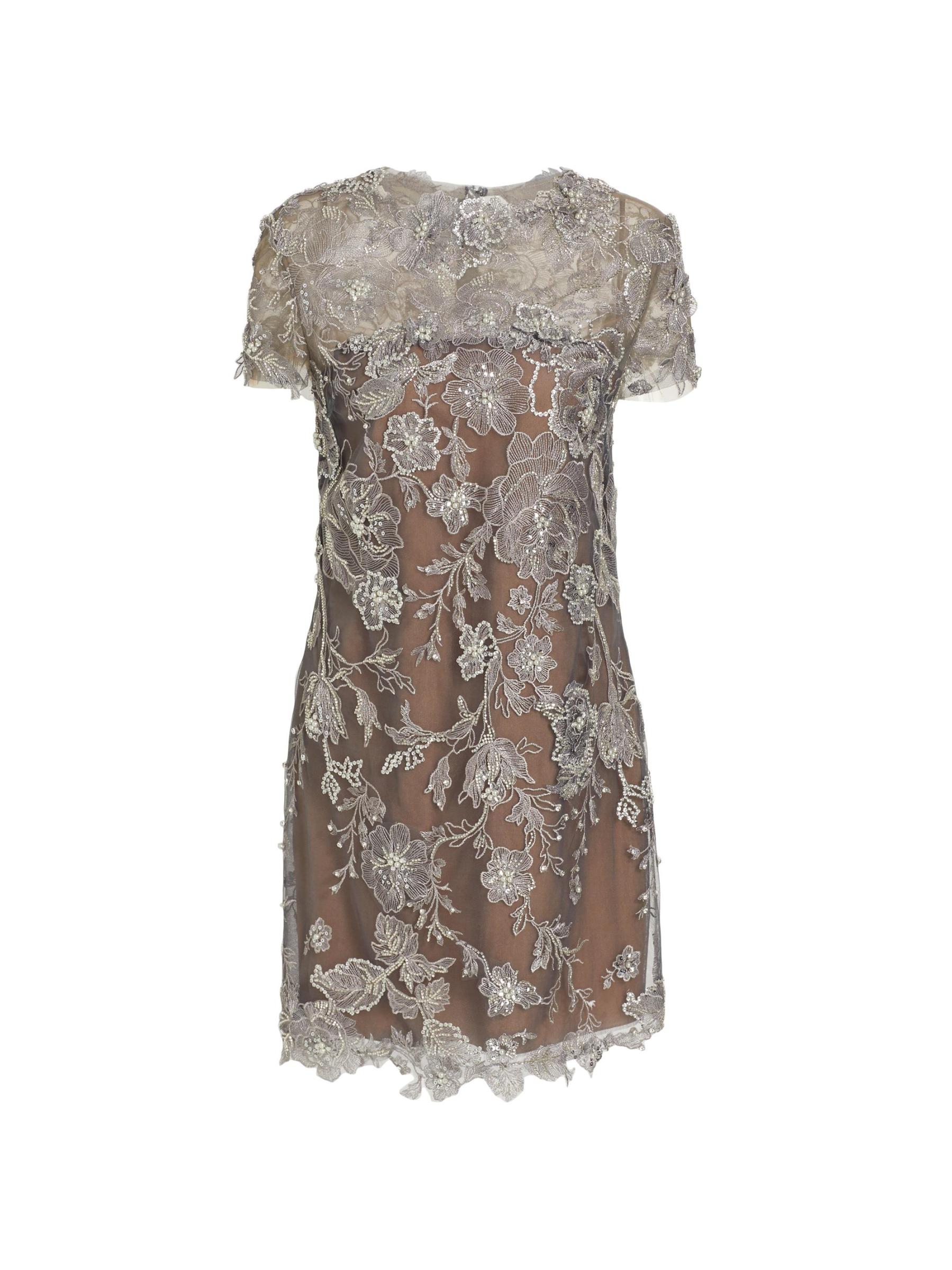 يتميز هذا الفستان الكلاسيكي ذو التصميم البسيط بتقويرة دائرية وأكمام قصيرة معززة بزخارف رومانسية من الزهور المطرزة.