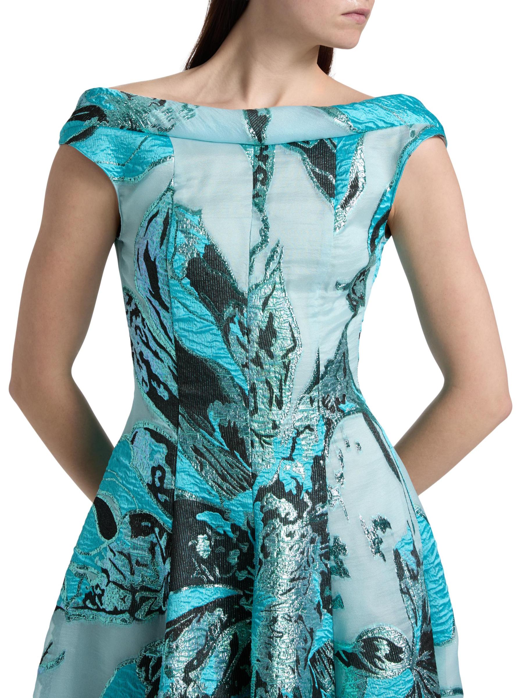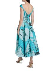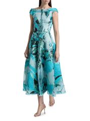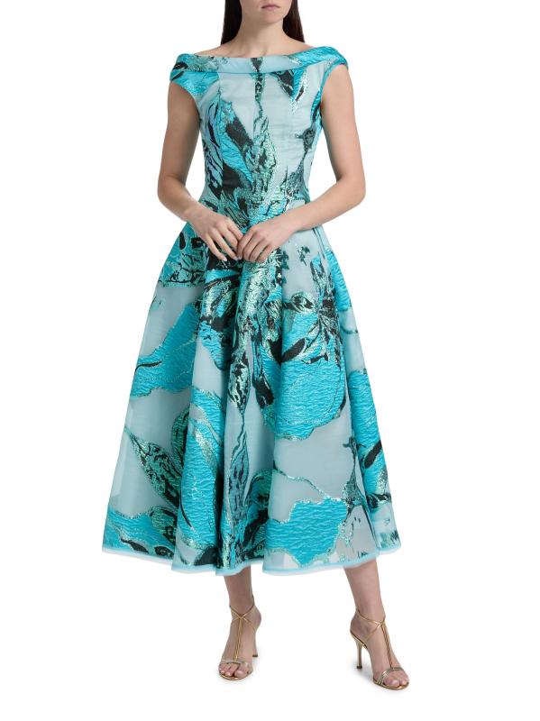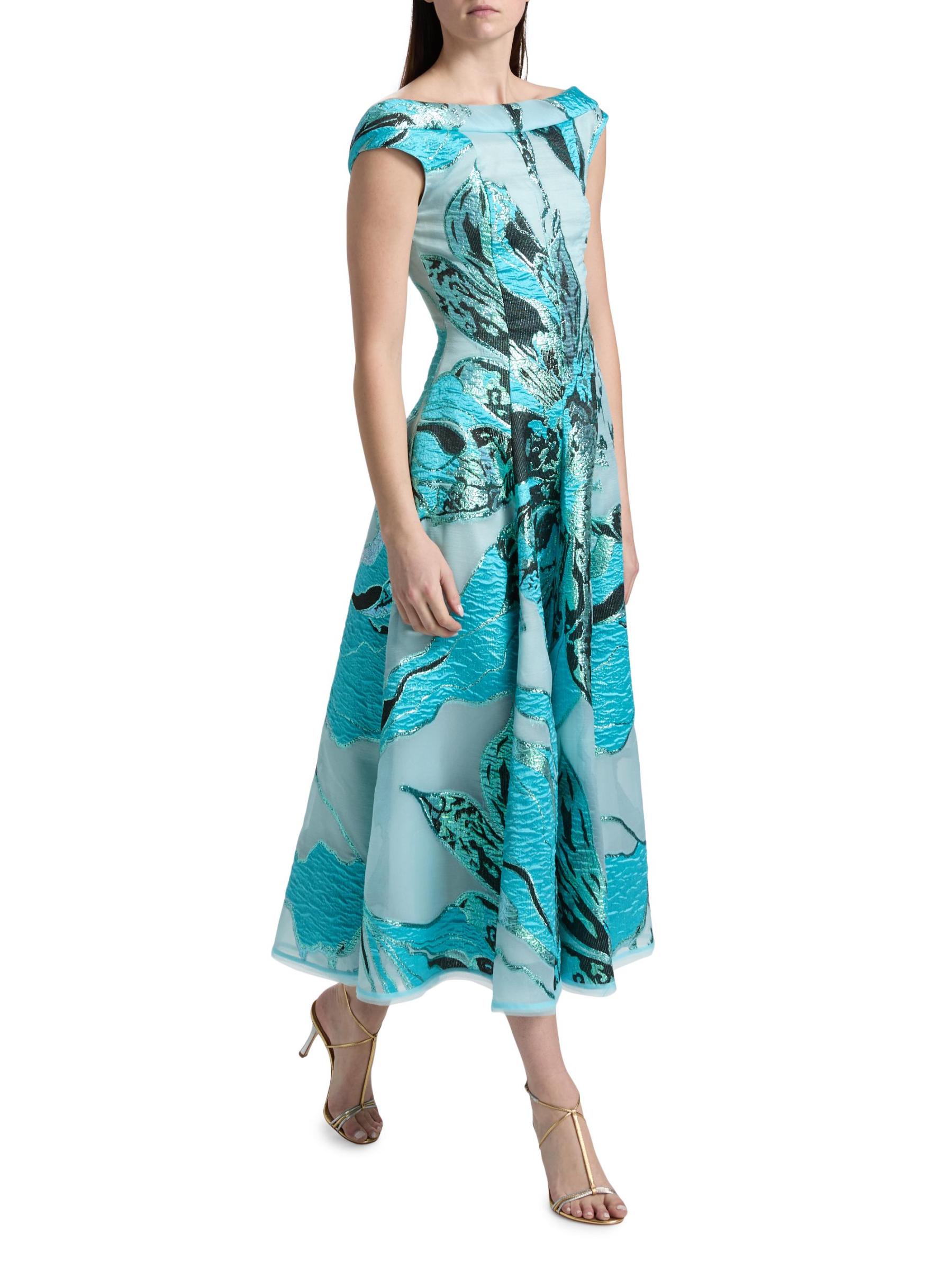 صُنع هذا الفستان بطول الشاي من Talbot Runhof من الجاكار الزهري مع تفاصيل الخيوط المعدنية، ويتميز برقبة قارب أنيقة وأكمام على شكل قبعة.