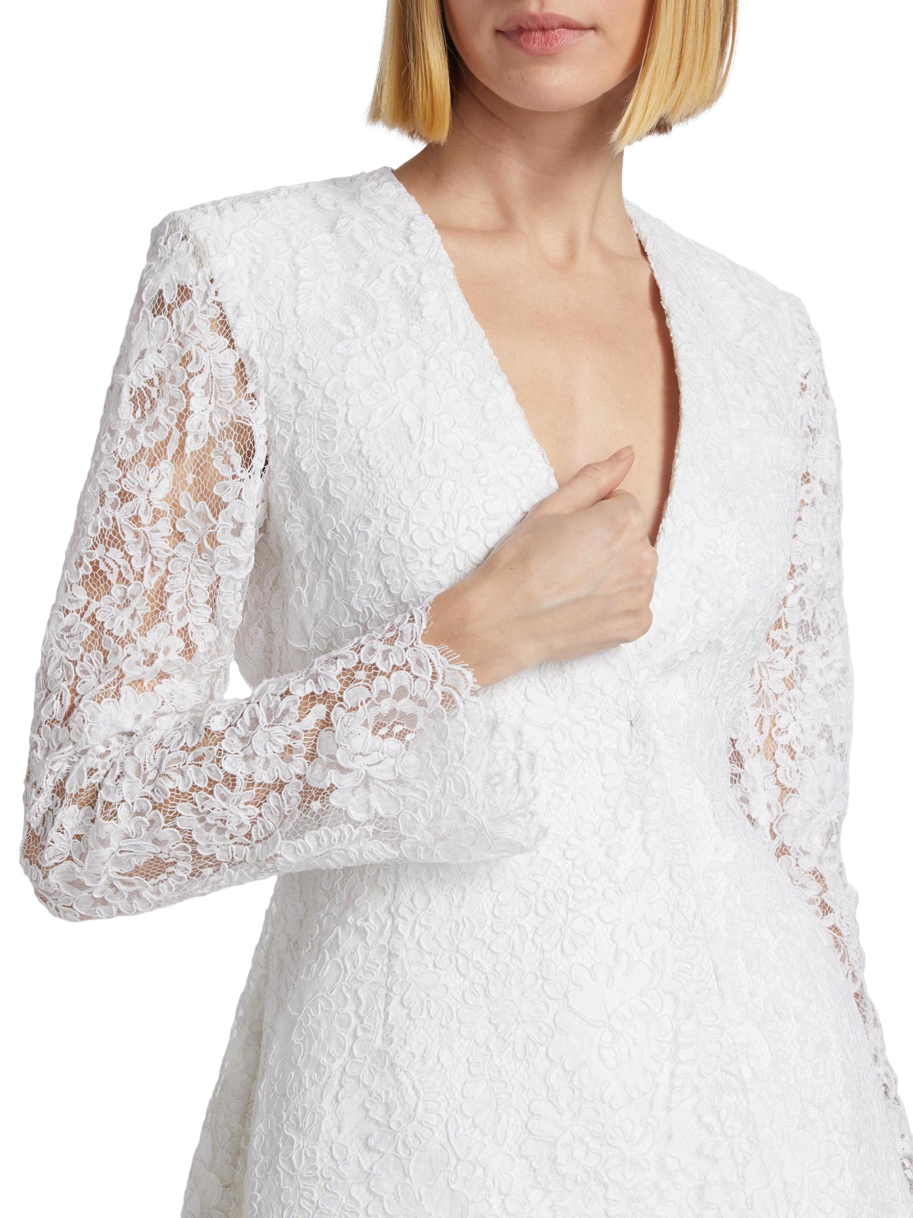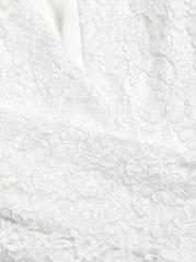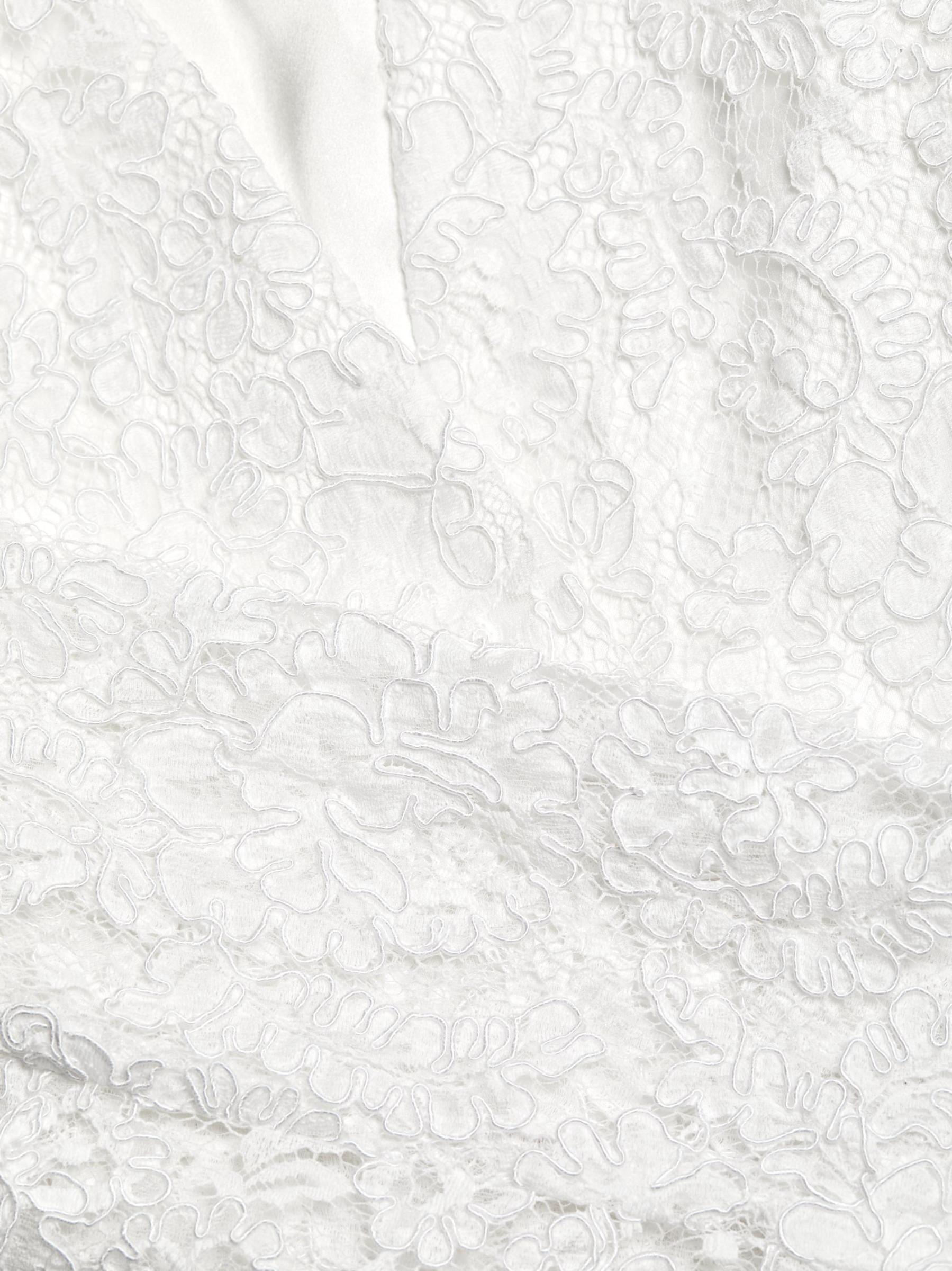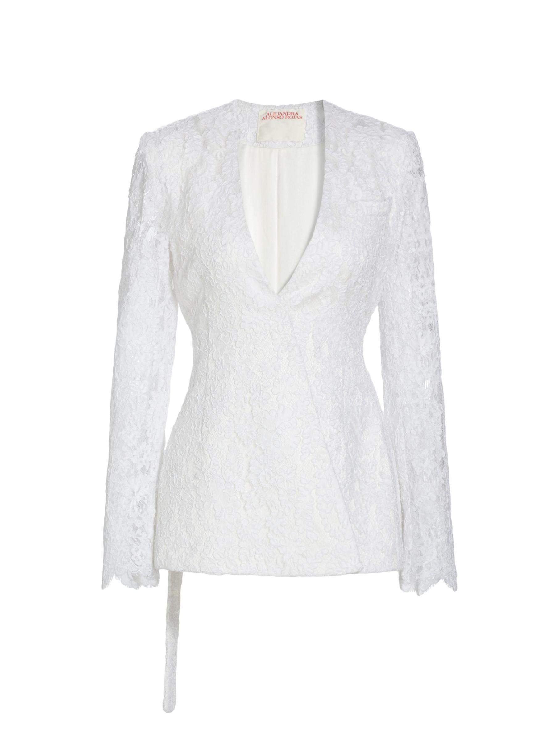 تتميّز هذه السترة بدون ياقة من أليخاندرا ألونسو روخاس المصنوعة من الدانتيل الفرنسي المزهّر بتصميم مُصمّم خصيصًا ومضيّق وياقة عميقة على شكل حرف V.