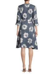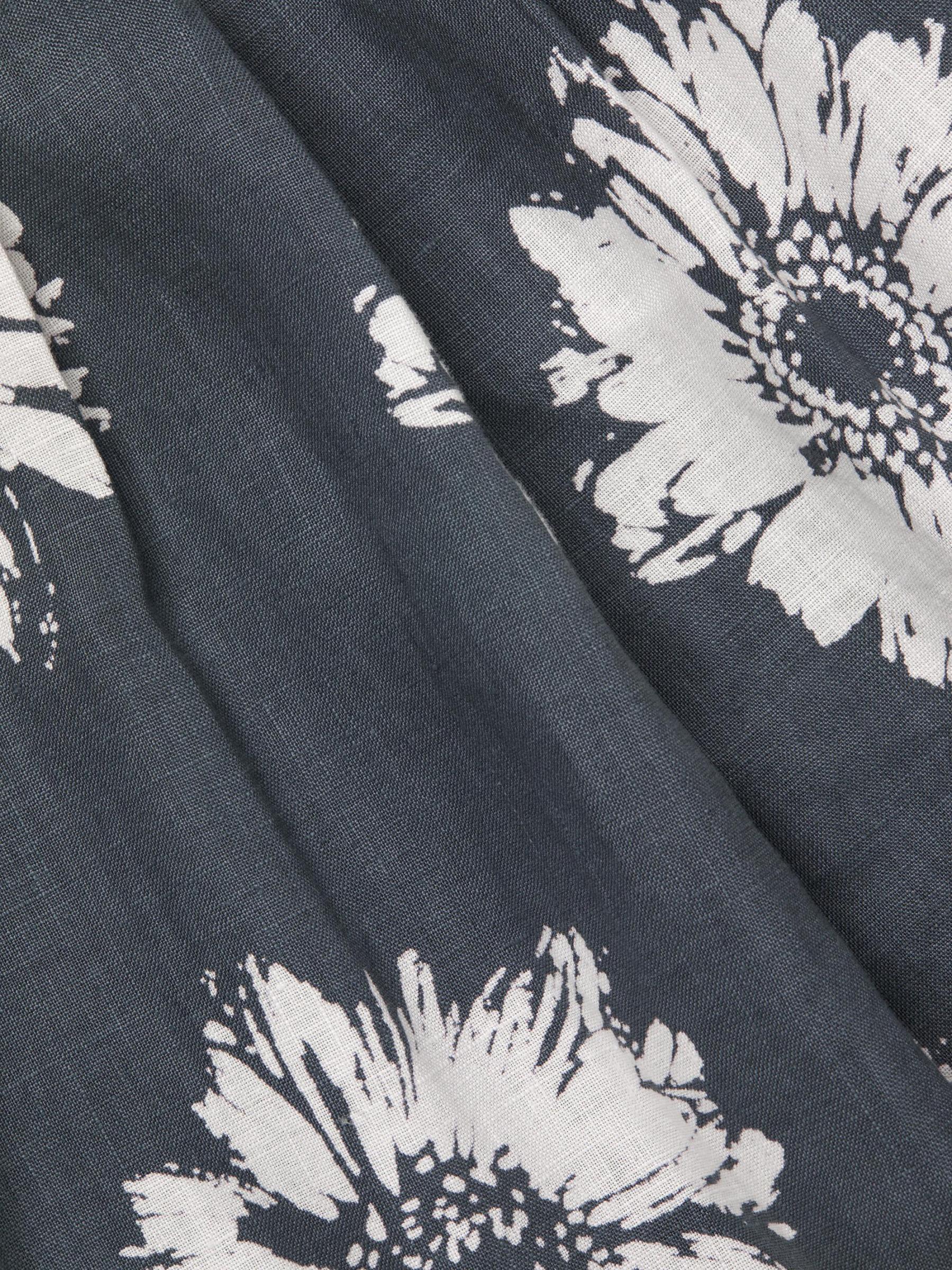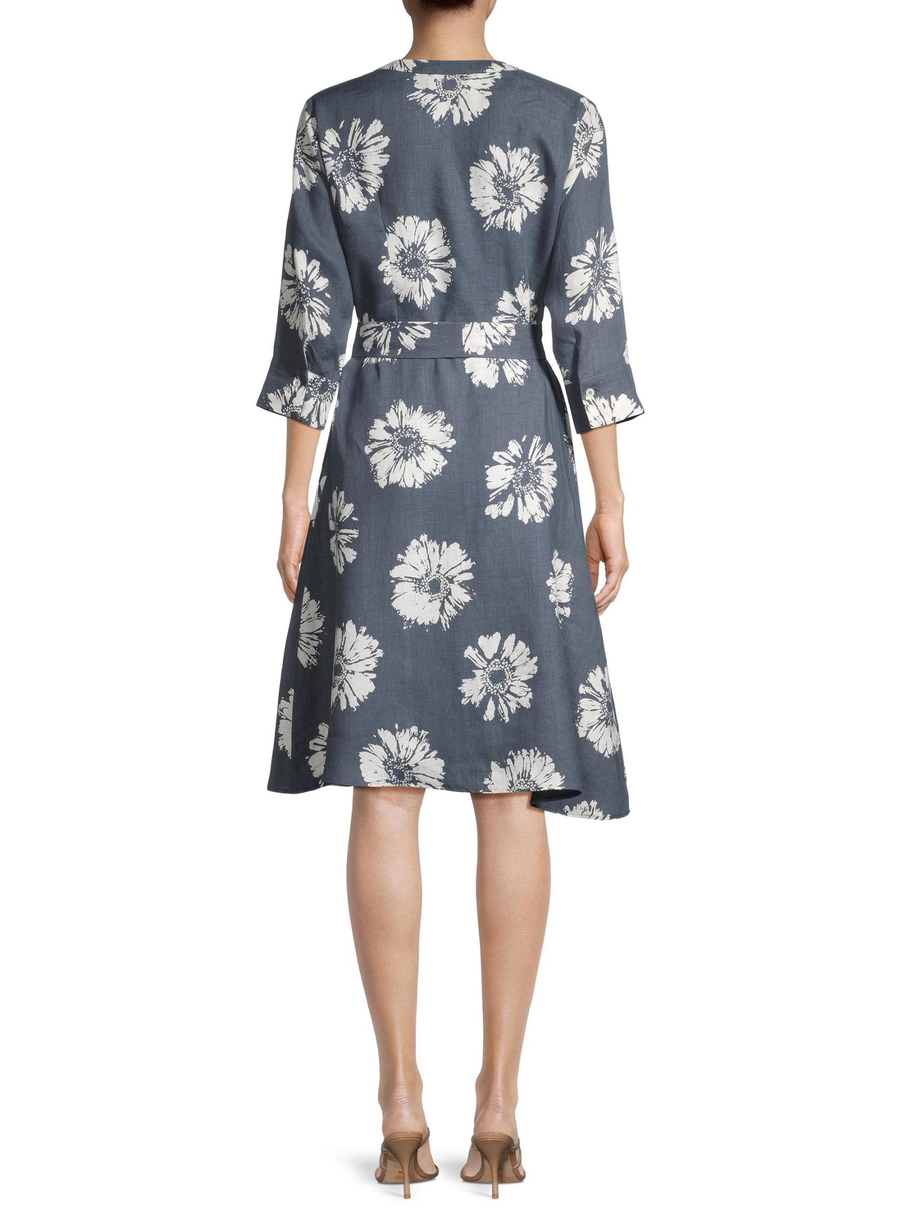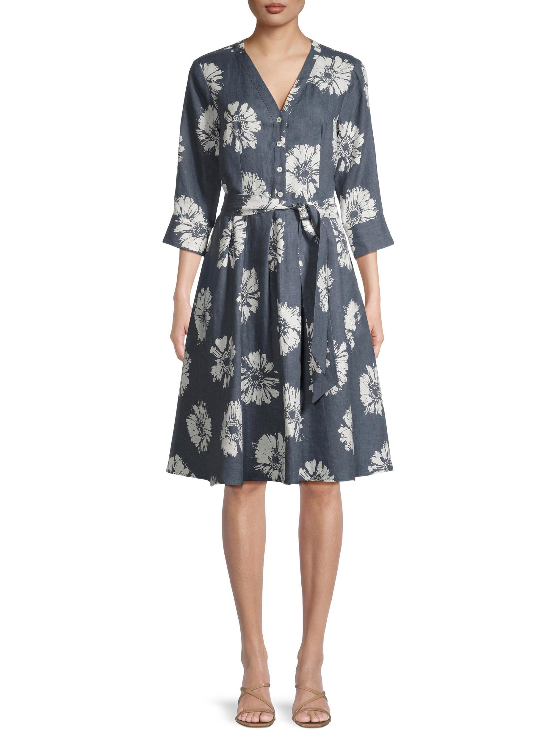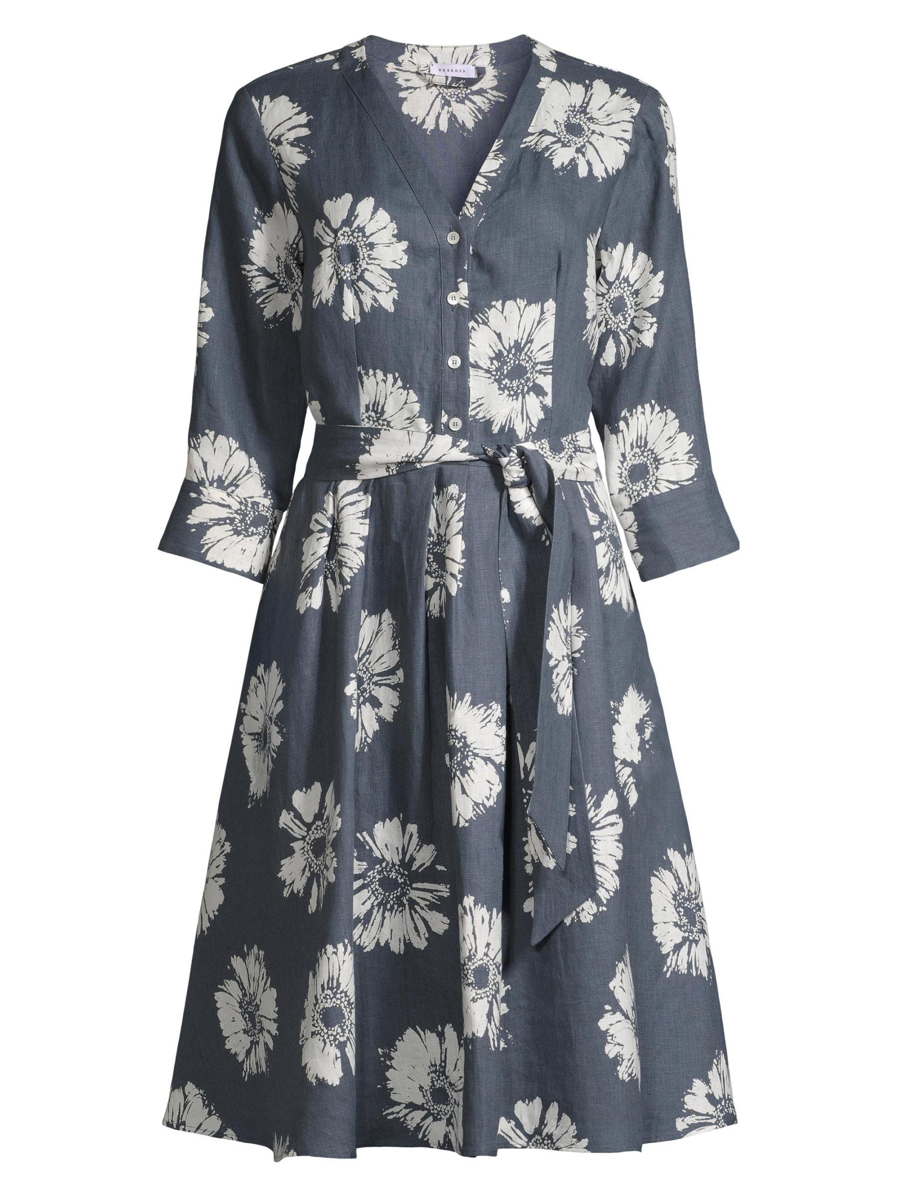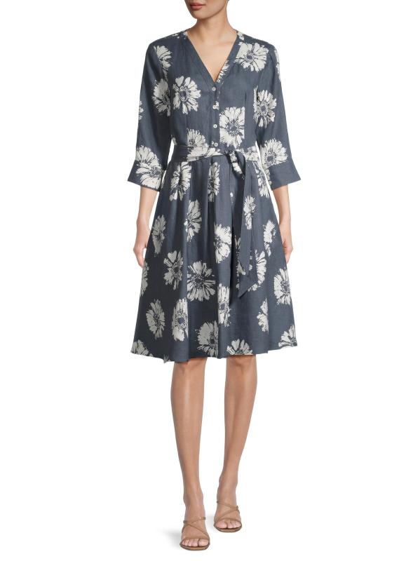 فستان متوسط الطول بحزام من الكتان بنقشة الزهور