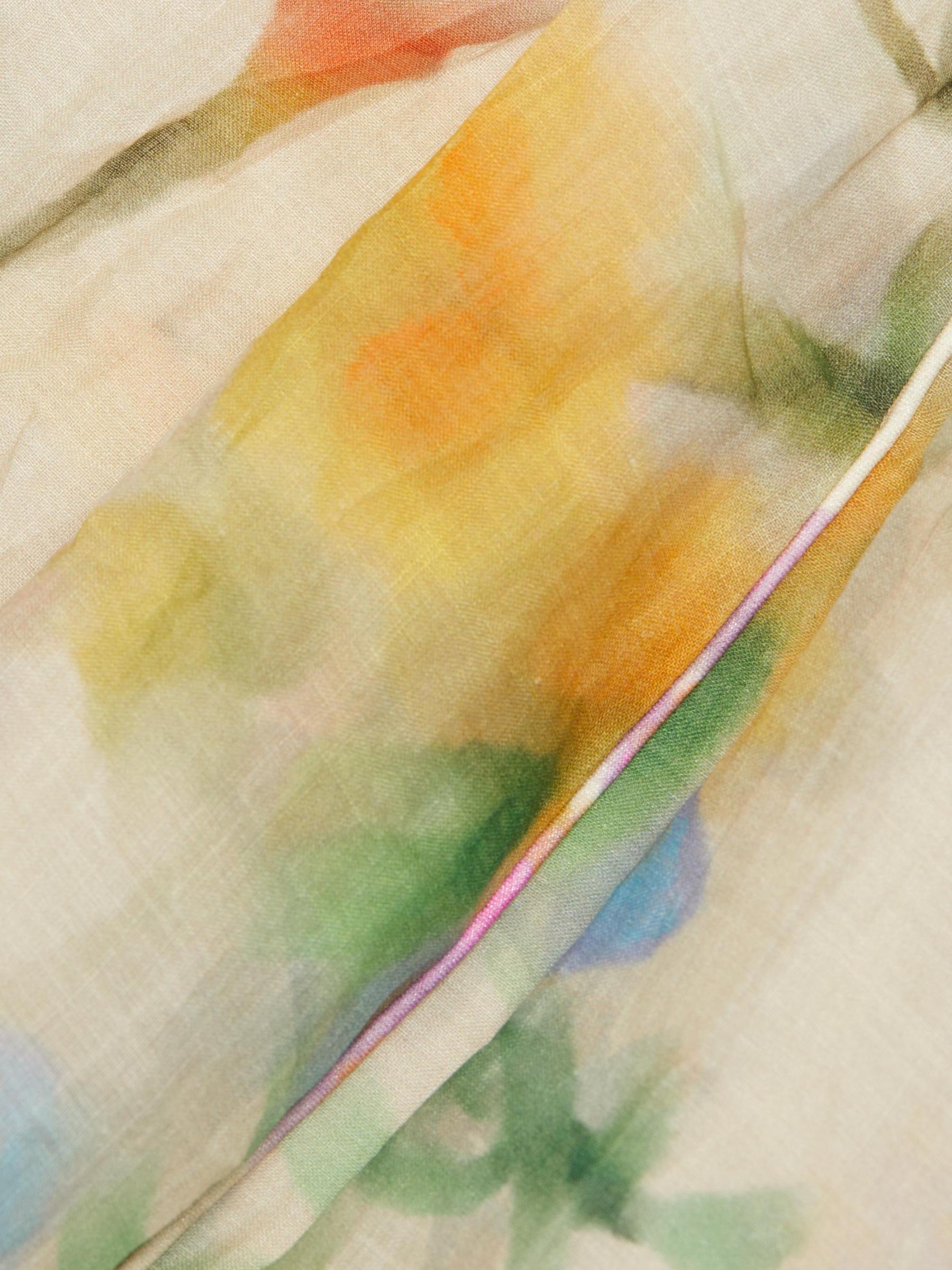 صُمم هذا الفستان الطويل المُناسب والمشرق بنقشة الزهور من Marchesa Rosa بتصميم شبكي وظهر على شكل حرف V.