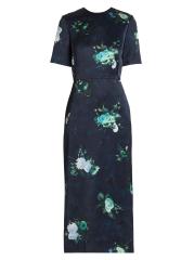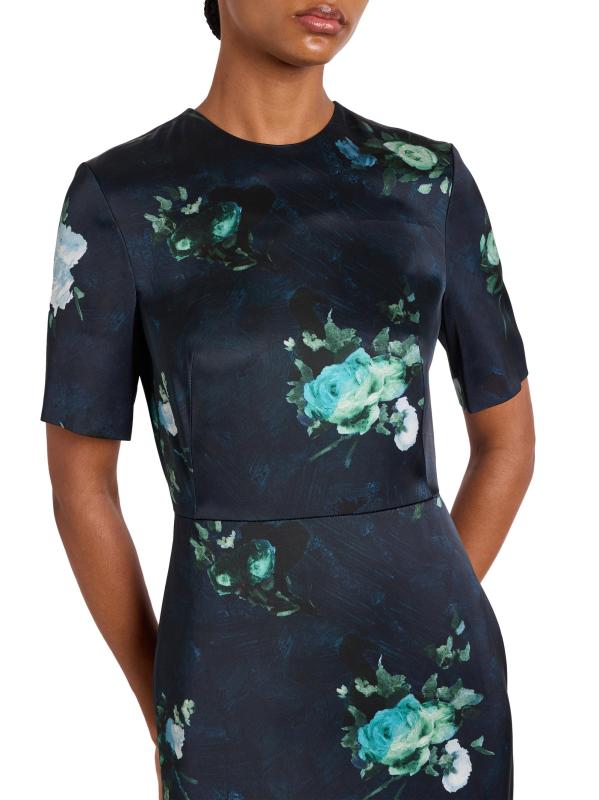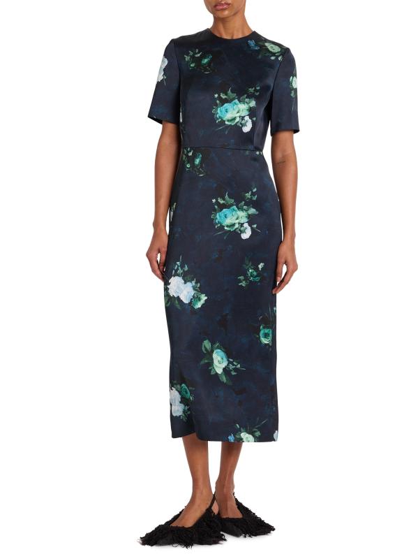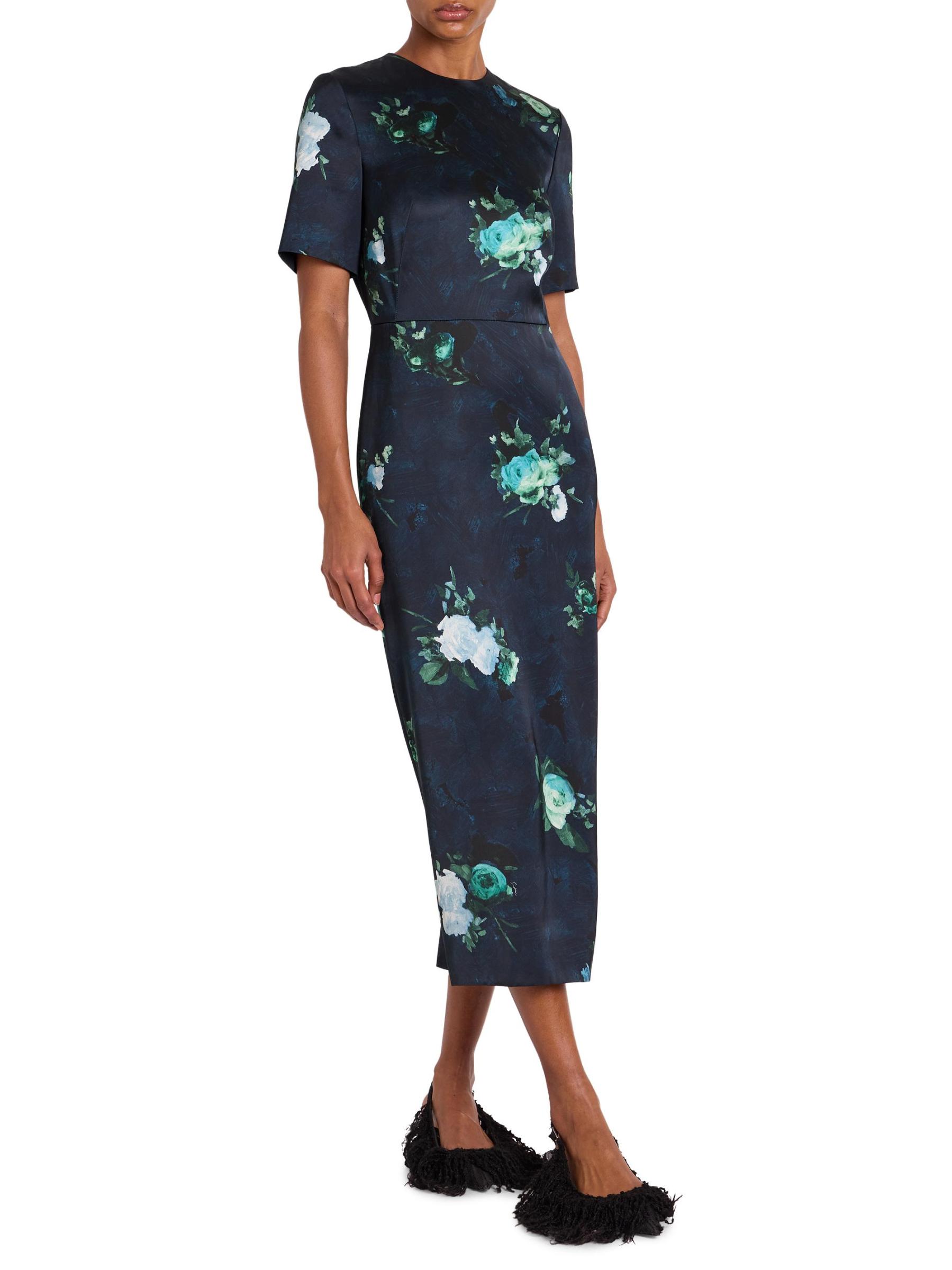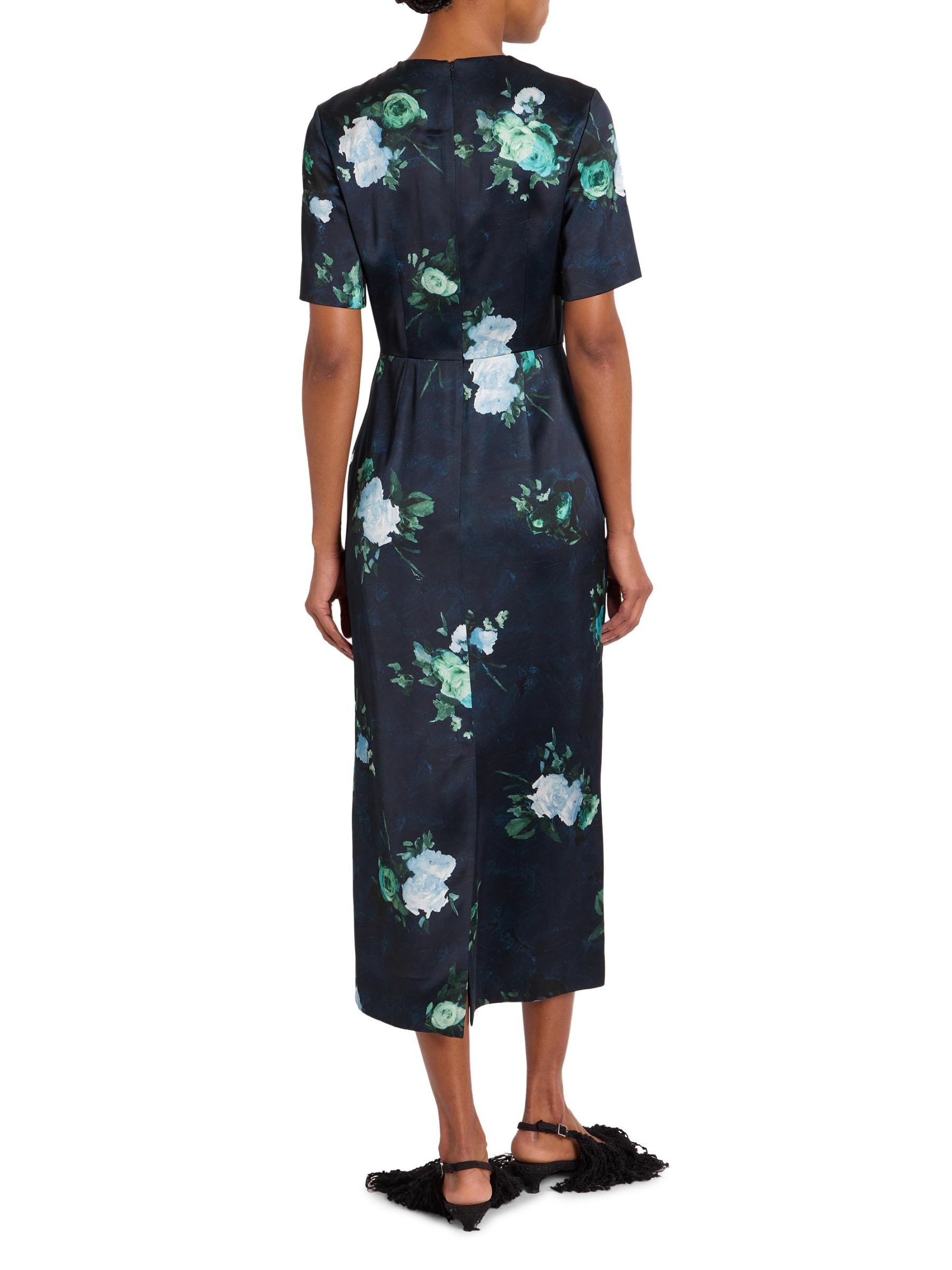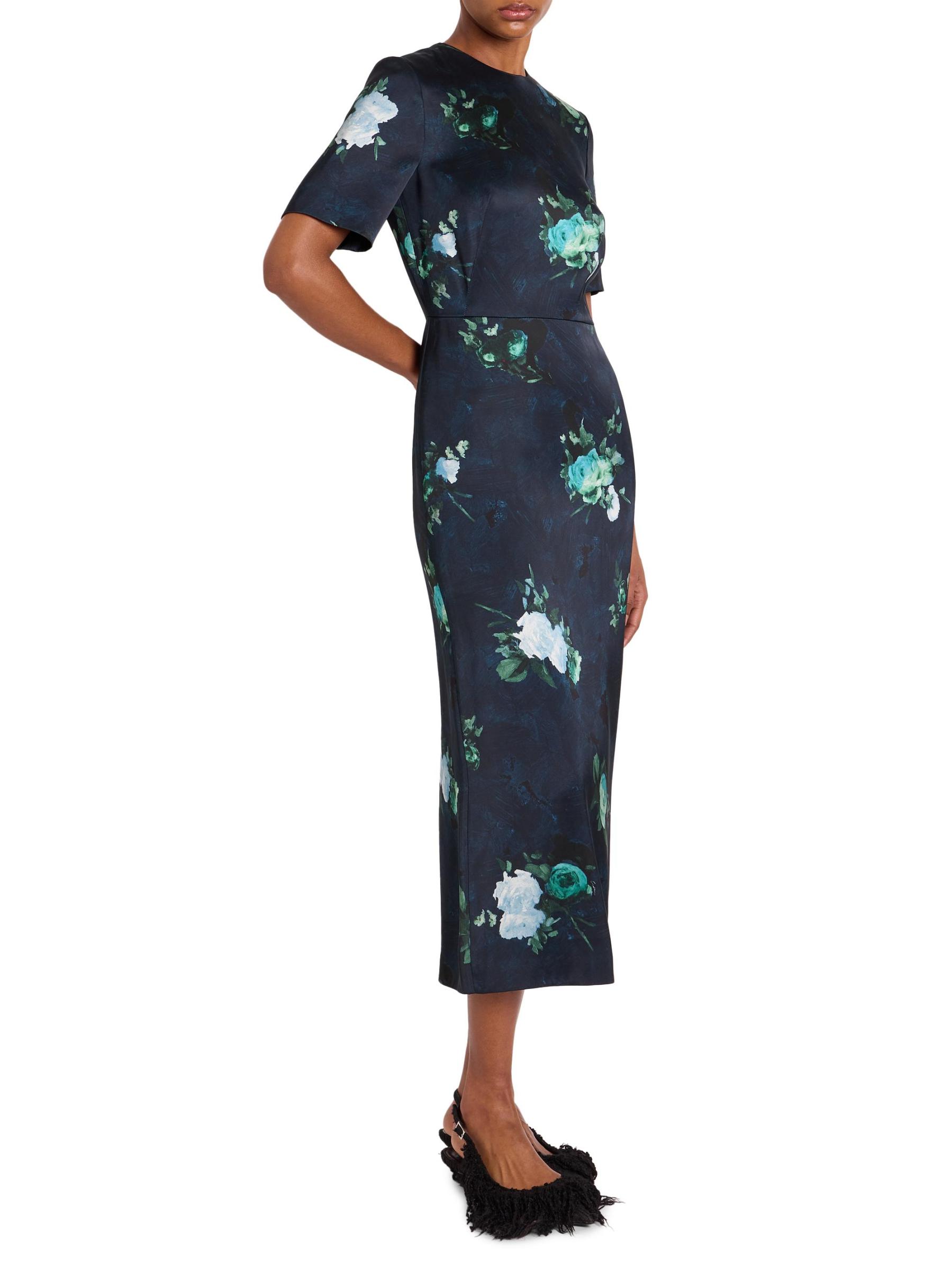 يتميز هذا الفستان المتوسط ذو الأكمام القصيرة من Erdem بطبعة زهرية نابضة بالحياة ورقبة على شكل جوهرة وصورة غمد.