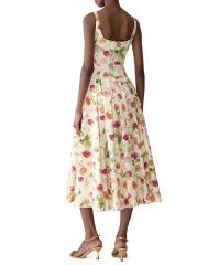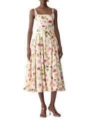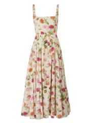 صُنع فستان كارولينا هيريرا المتوسط الخالد من القطن الإيطالي الناعم، وهو مصمم بتقويرة عميقة وخصر منسدل. يتميز هذا التصميم بطيات ناعمة عند التنورة وطبعات زهرية رومانسية في جميع الأنحاء.