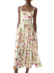 فستان متوسط الخصر من القطن القابل للتمدد بنقشة الزهور