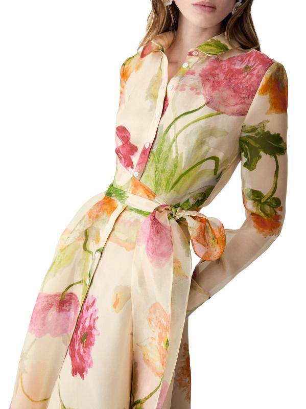 يتميز هذا الفستان الحريري الطويل من Carolina Herrera بتصميم مستوحى من الخندق مع ياقة واسعة وبطانة منزلقة وفتحة أمامية بأزرار. تتميز هذه القطعة بنقشة الأزهار وأربطة عند الخصر مع وشاح برباط ذاتي.