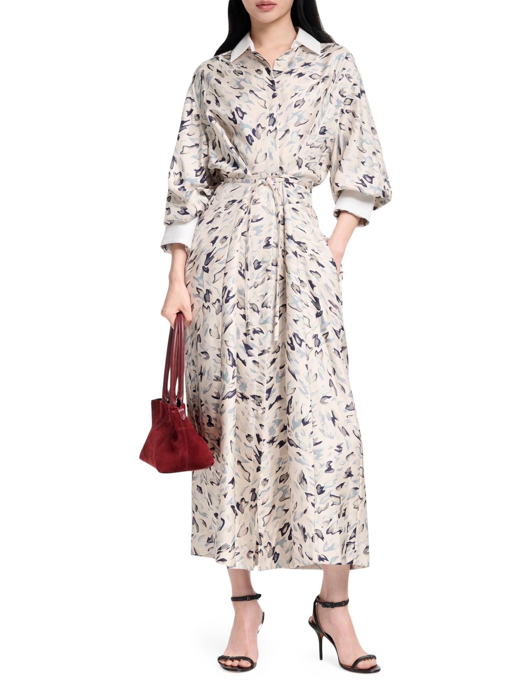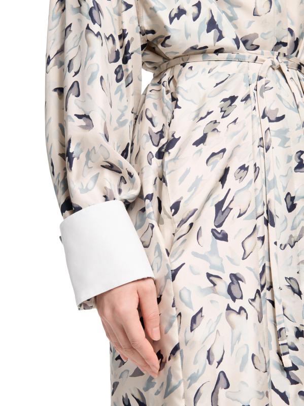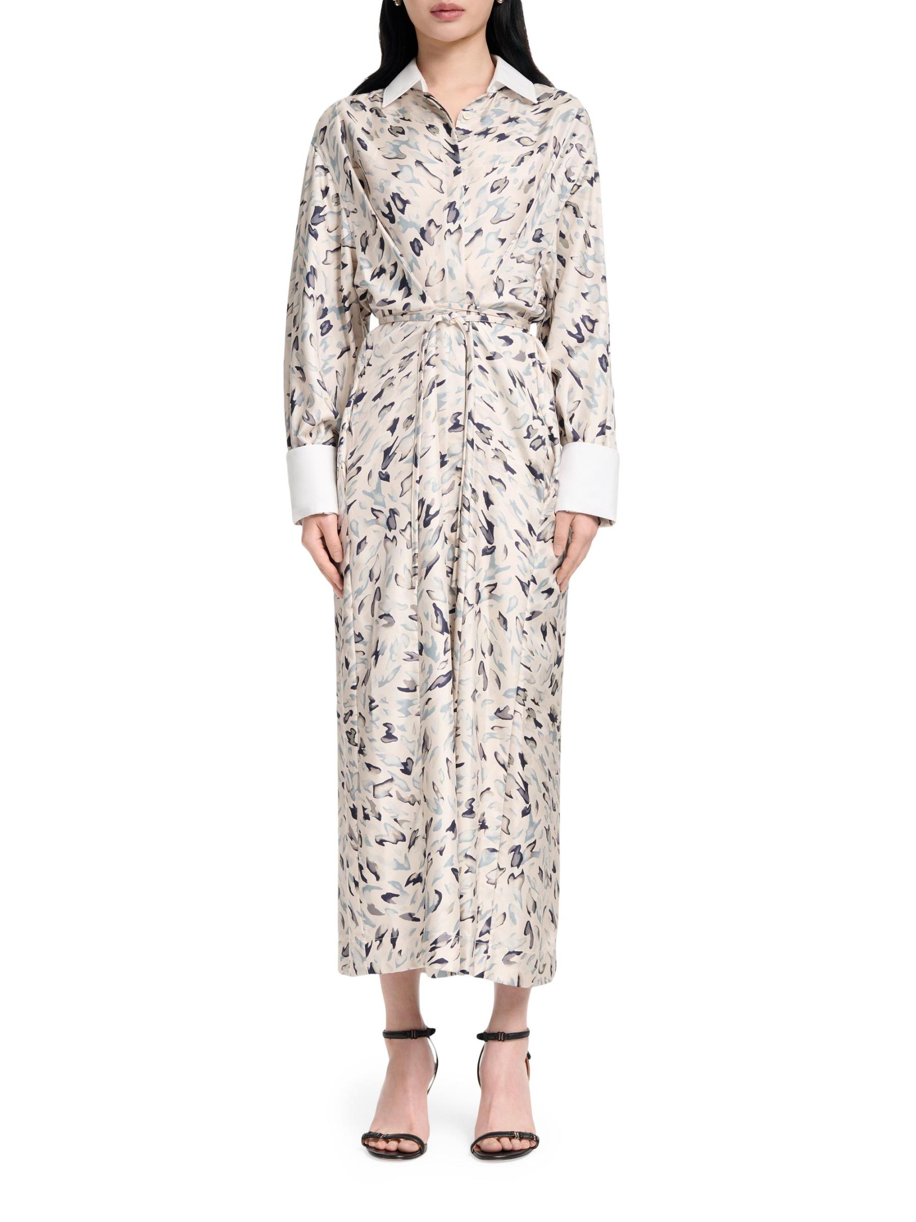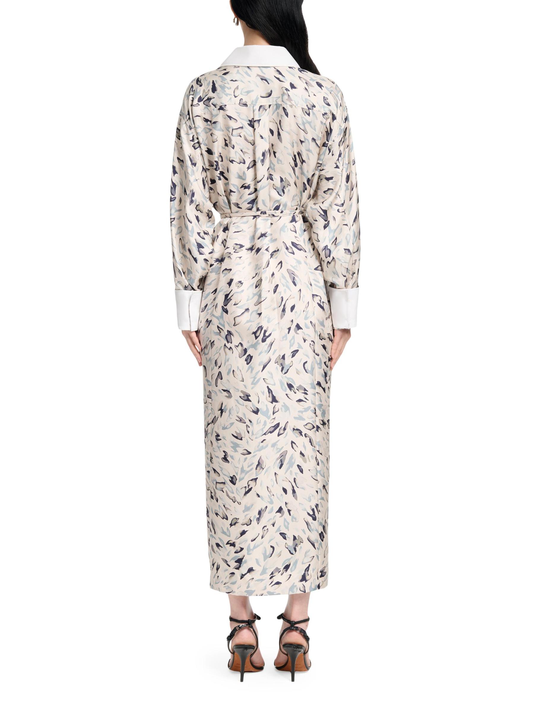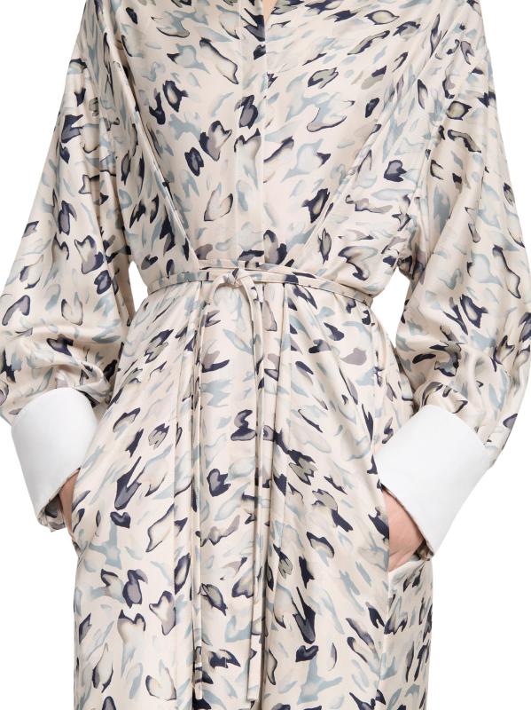 يتميز قميص فلويد من ألتوزارا، الذي تم تشطيبه بطبعة حيوانات تجريدية، بياقة وأساور مطلية بالنشويات. تتضمن هذه القطعة إغلاق بأزرار أمامية وحزام برباط جانبي وأكمام طويلة.