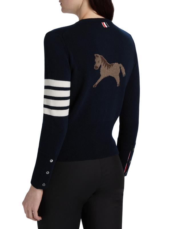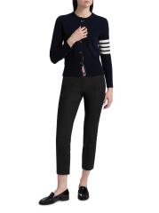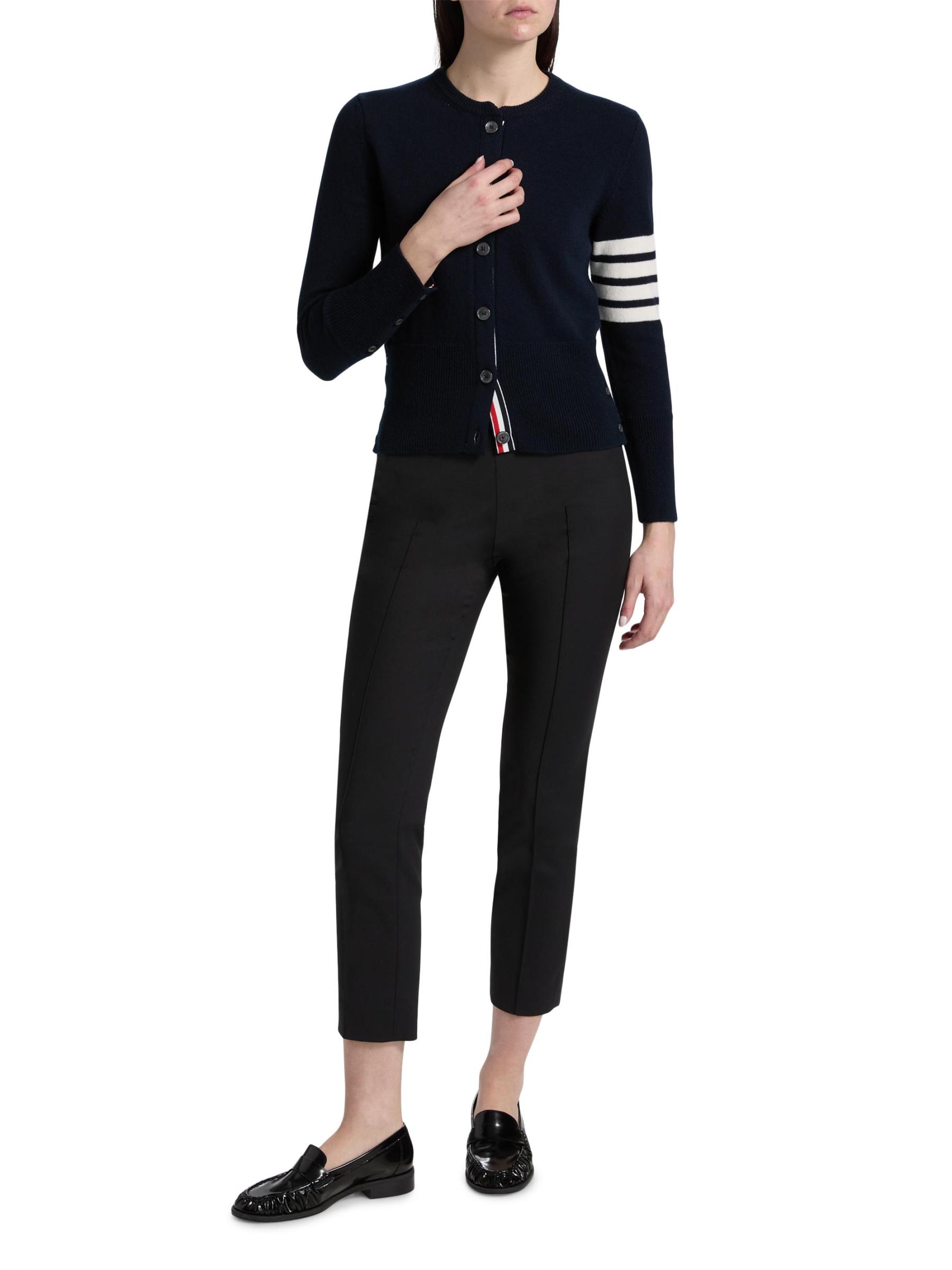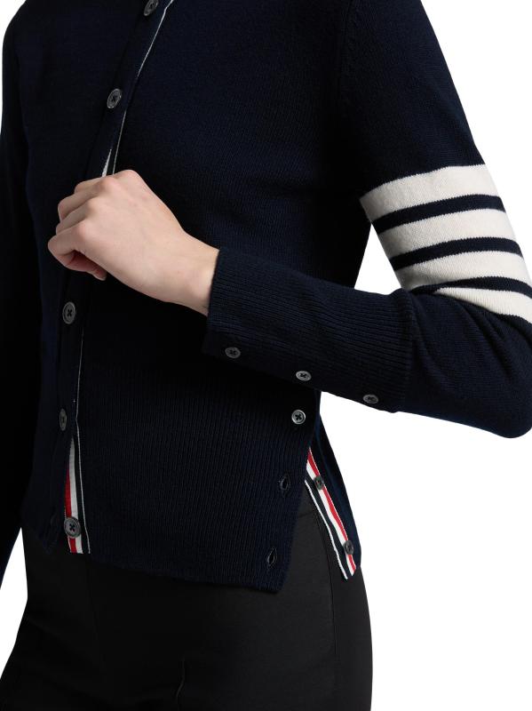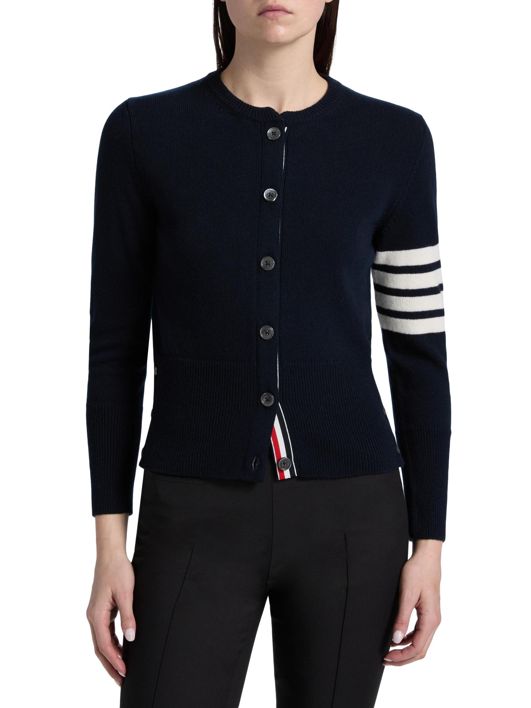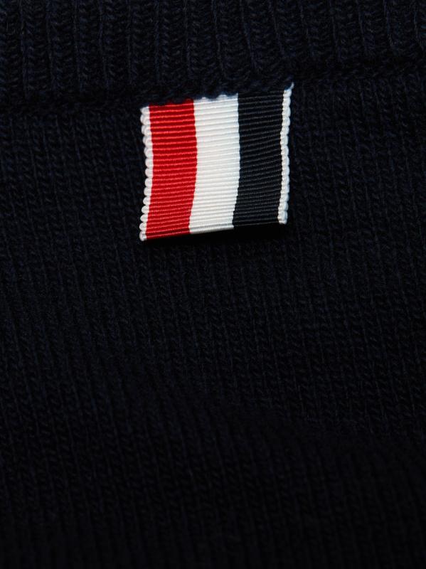 تتميّز سترة Thom Browne الضيقة المصنوعة من الصوف الإيطالي البكر بتفاصيل العلامة التجارية المميزة المكونة من أربعة أشرطة على الأكمام والزخارف المخططة على طول الفتحة الداخلية.