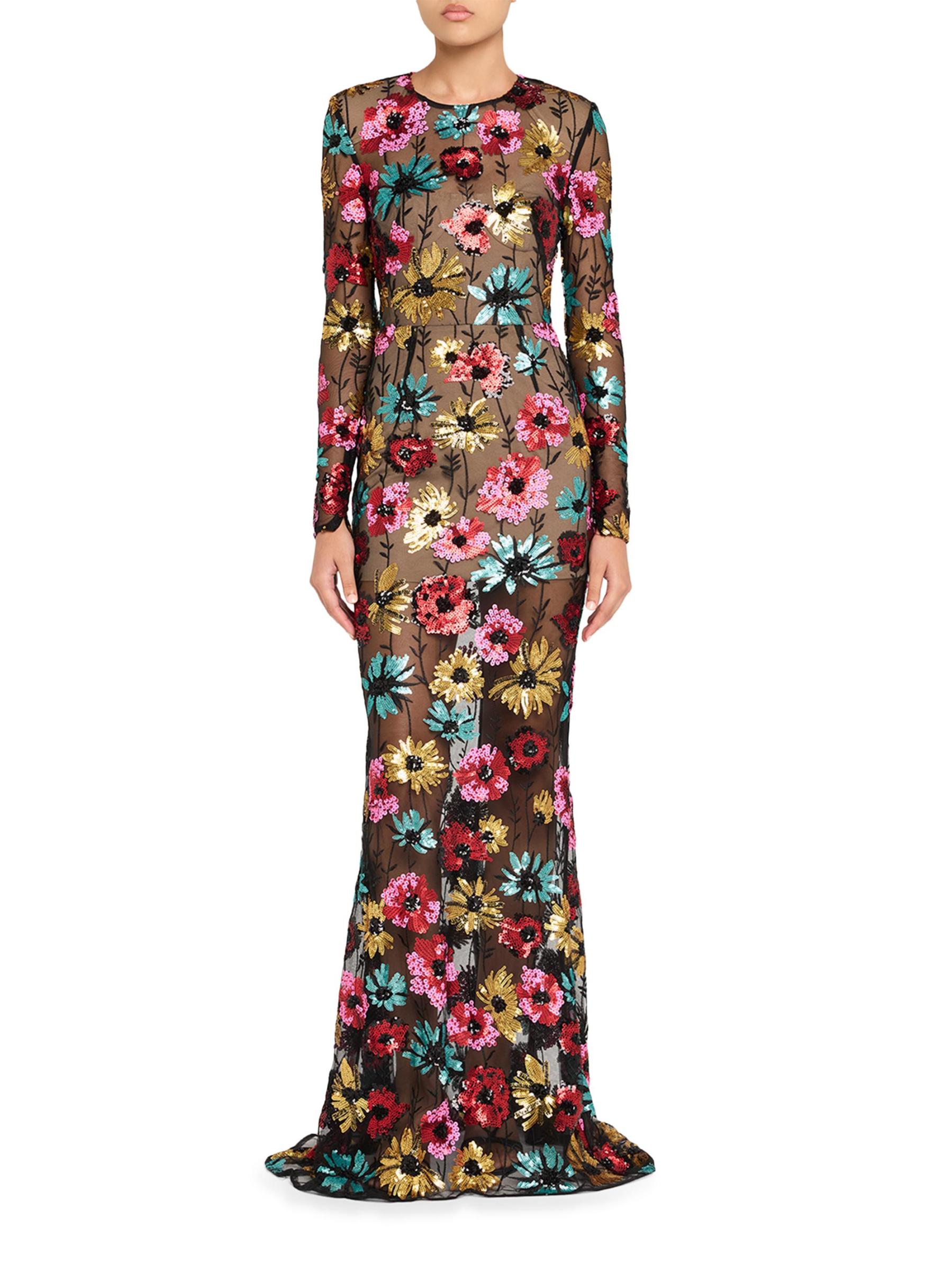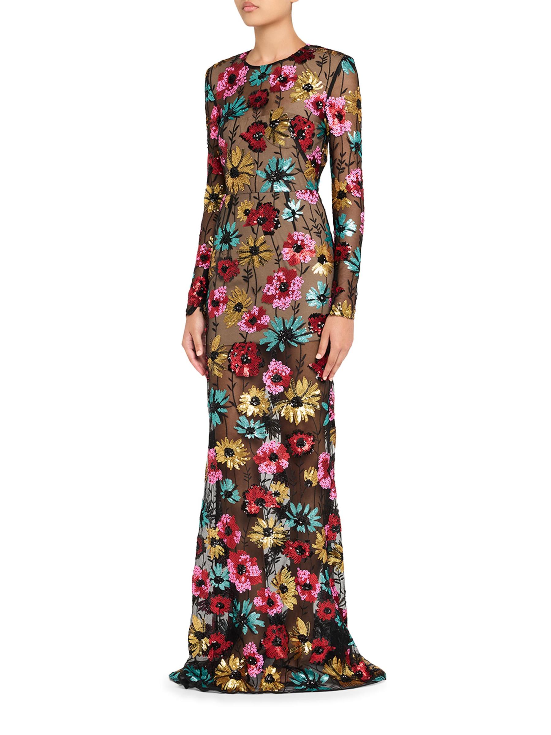 يتألق فستان Francesca Illusiontle من برونكس وبانكو بتطريز الأزهار المطرّز ورقبة على شكل جوهرة وأكمام طويلة ضيقة.