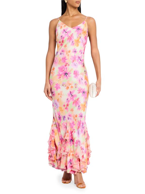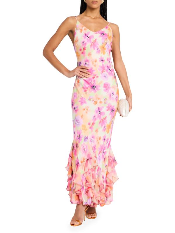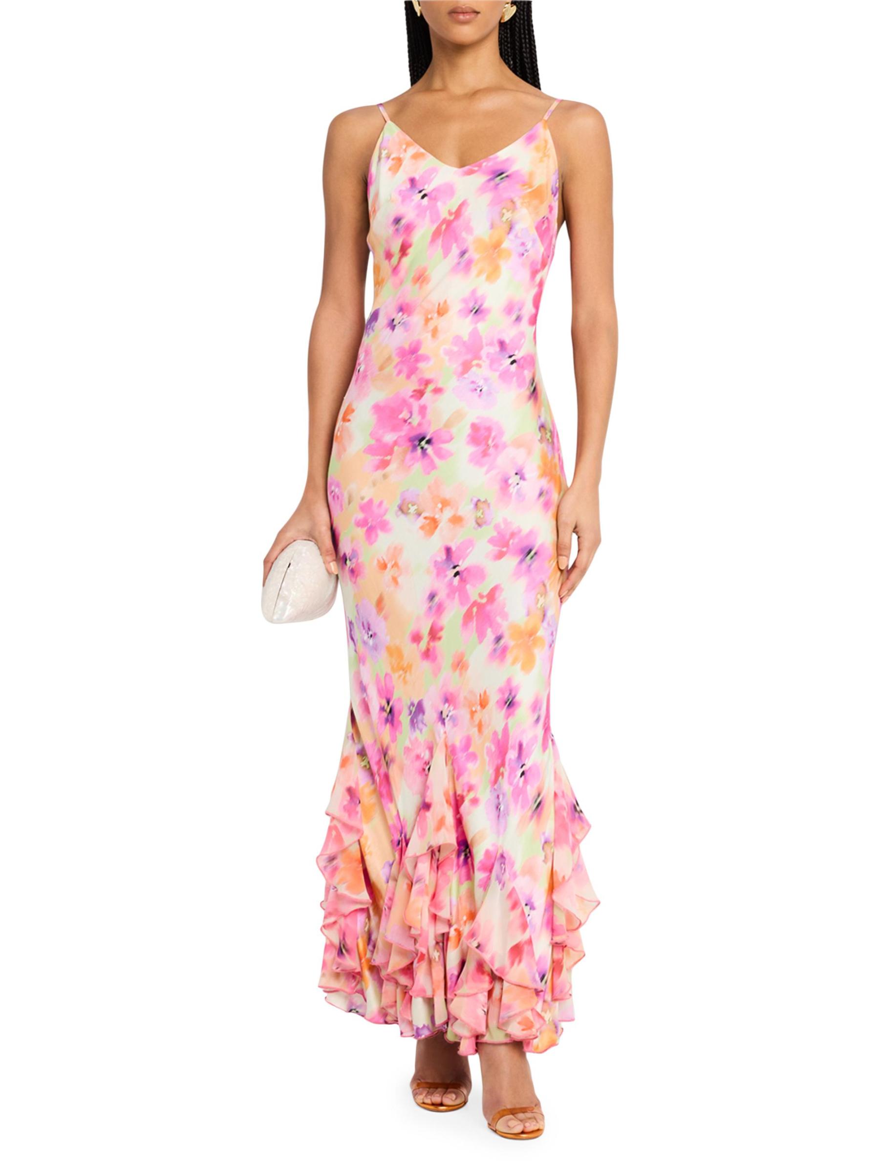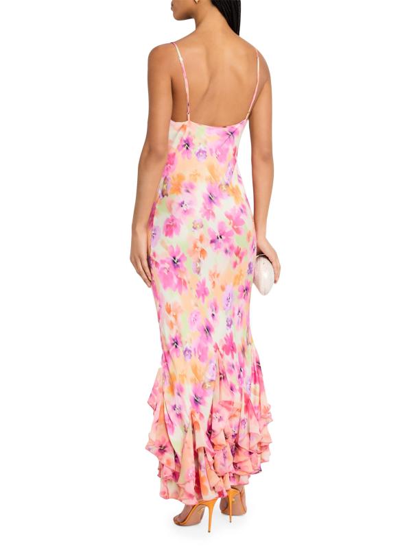 تزين الكشكشة ذات الطبقات فستان فريدا من La Superbe. صُمم التصميم بمقاس ضيق، وهو مطبوع بزهور النيون.