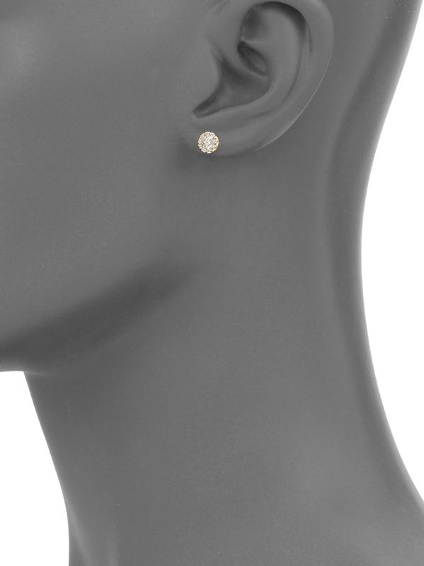 من مجموعة الوفاء. تتألق أقراط Hearts On Fire الرائعة المرصعة على شكل هالة من الذهب الأصفر عيار 18 قيراطًا ببراعة مع الماس المستدير.الماس، 0.47 طن درجة لون الماس: I-J درجة وضوح الماس: VS-SI ذهب أصفر عيار 18 قيراط أرسل مرة أخرى صُنع في الولايات المتحدة الأمريكية