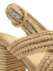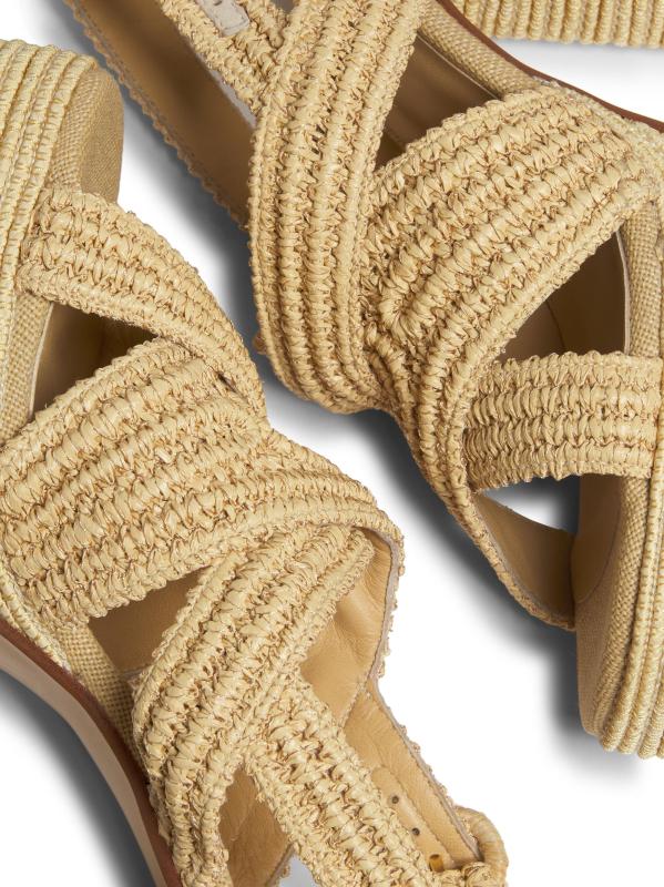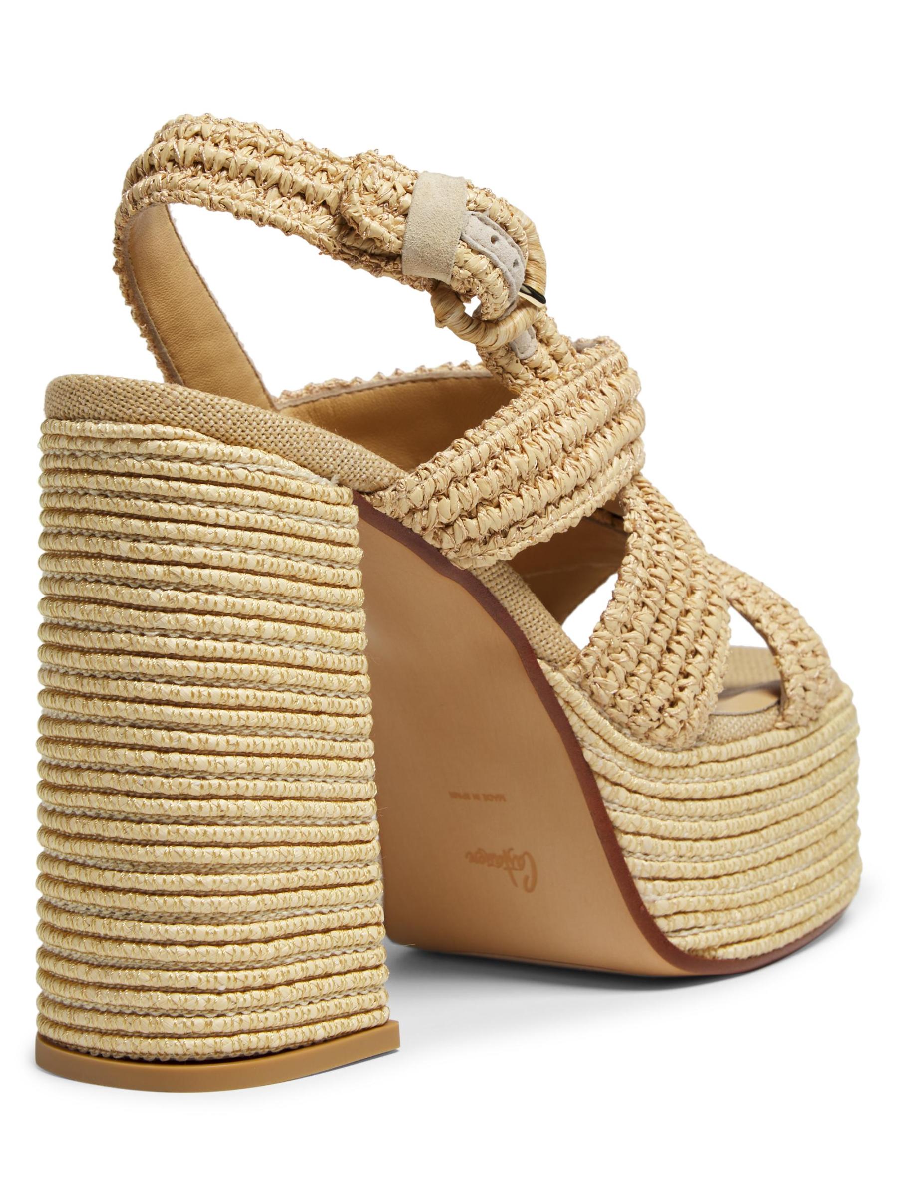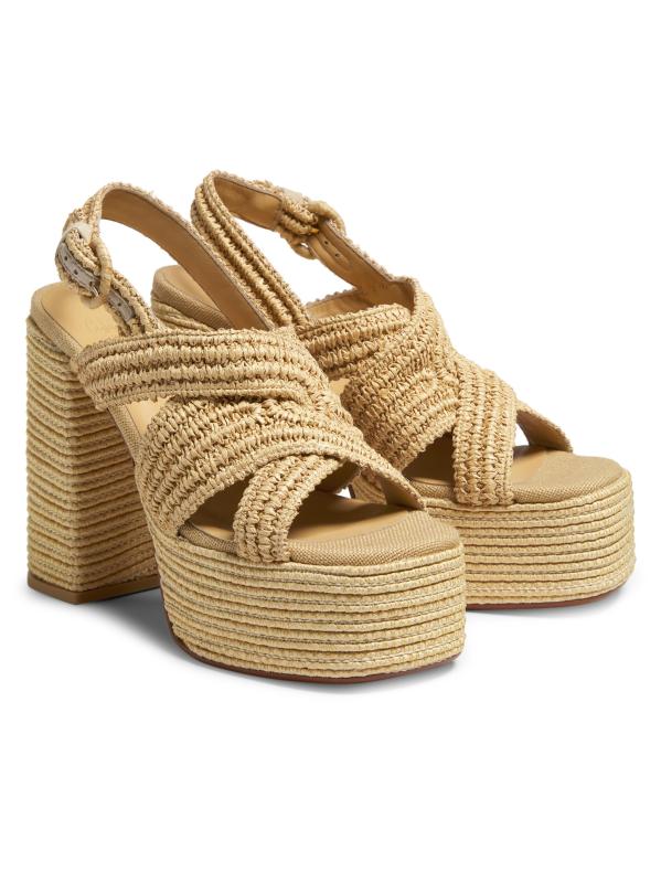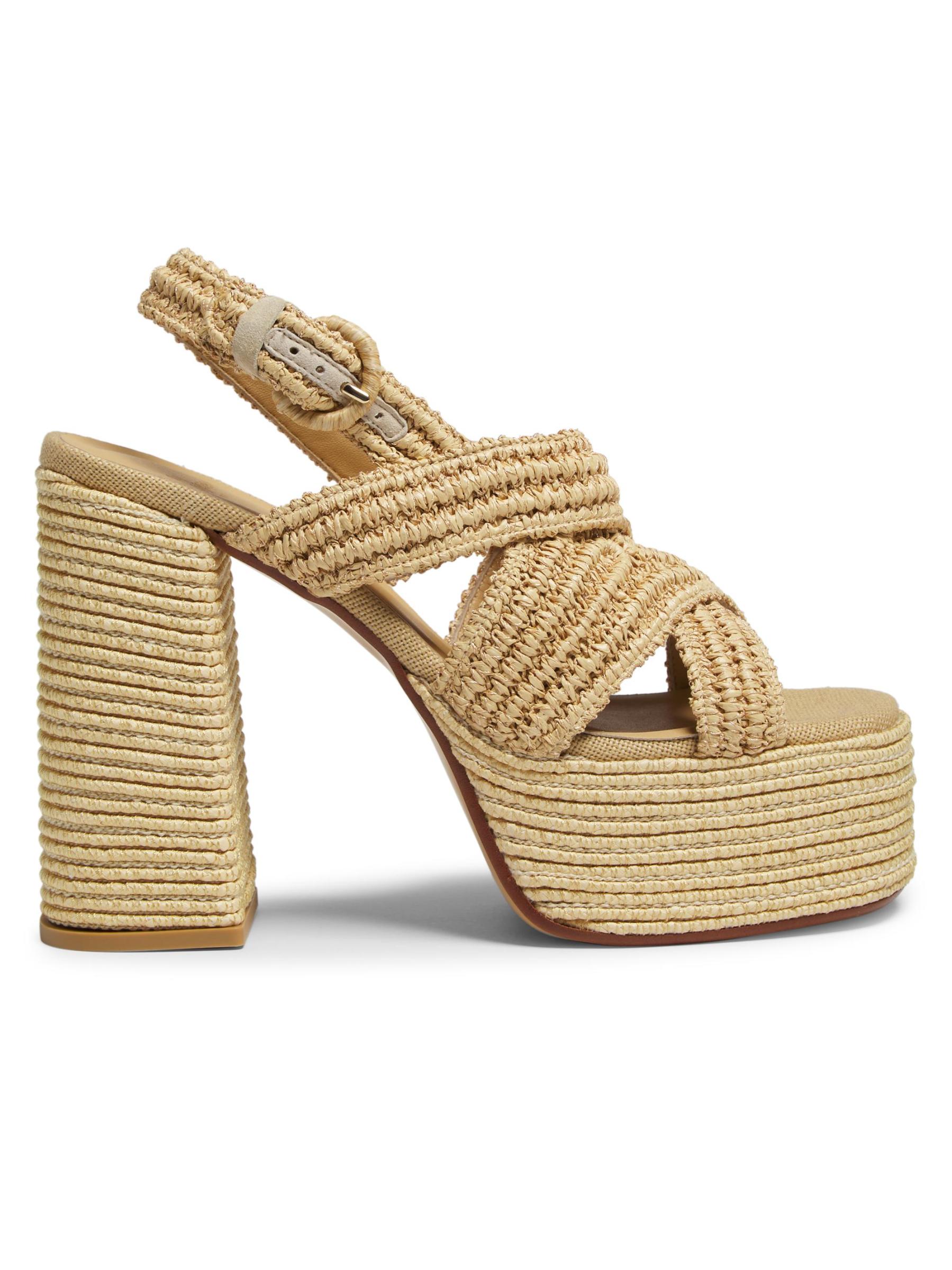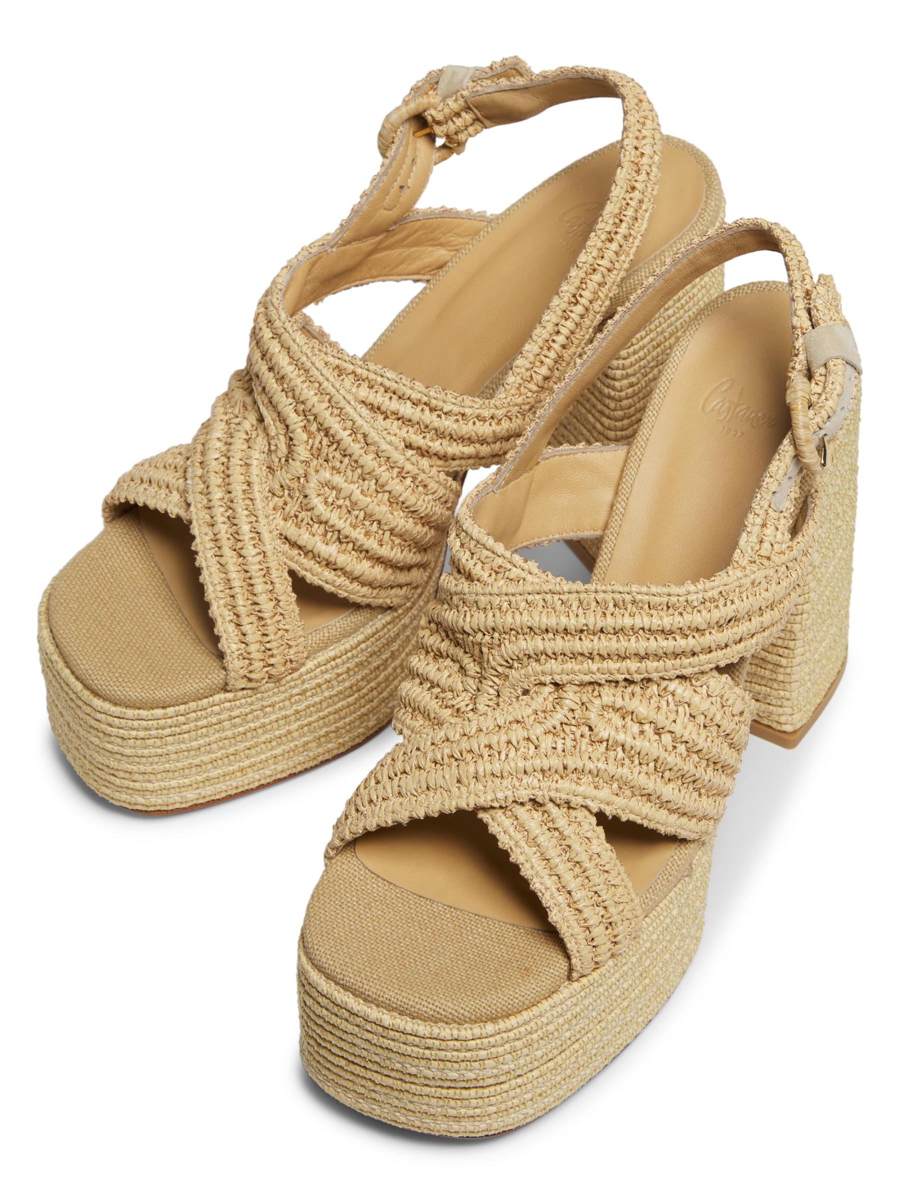 صُنع صندل فولفيا بلاتفورم من Castañer في إسبانيا من الرافيا ويتميز بكعب عالٍ ملفوف.