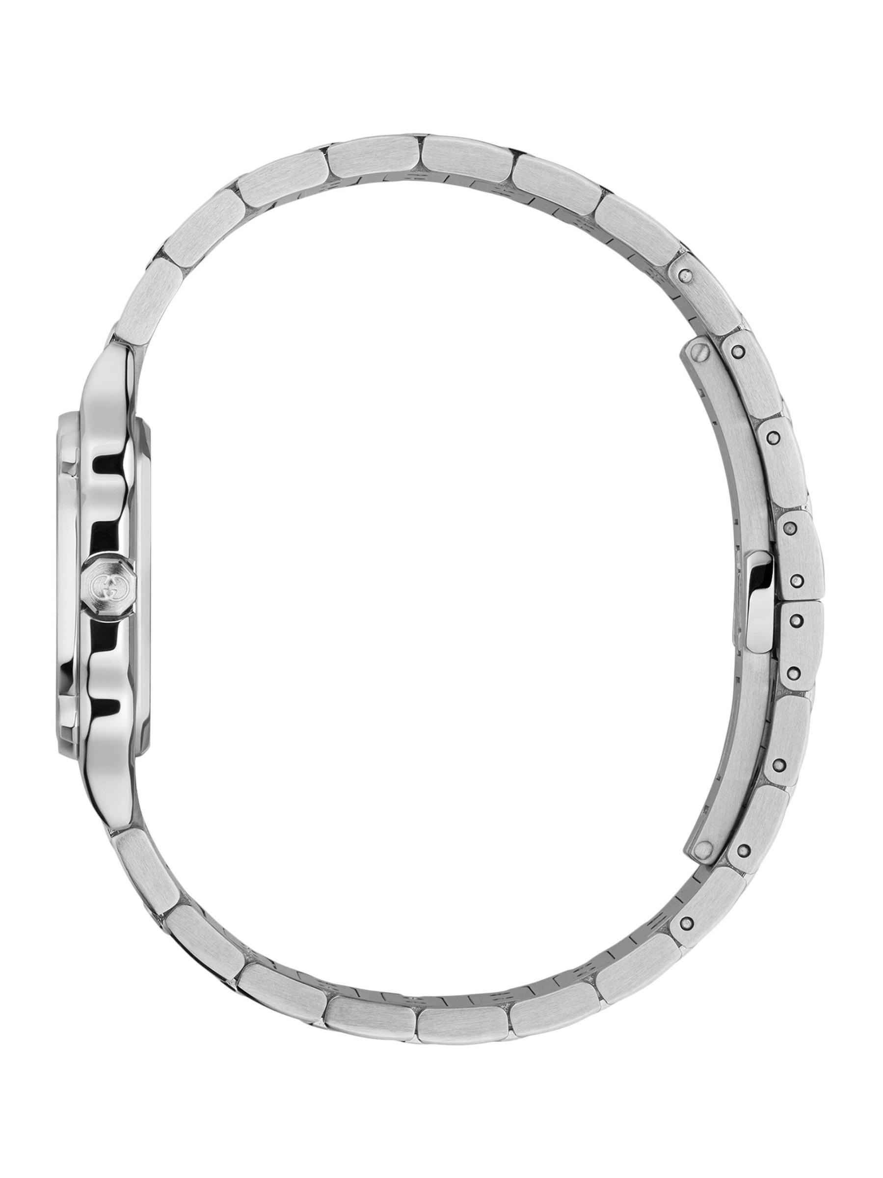 من مجموعة G-Flat. تتميز هذه الساعة الأنيقة من غوتشي المصنوعة من الفولاذ المقاوم للصدأ بمينا أحمر مزين بأشعة الشمس وعلامات الساعة الماسية اللامعة.حركة كوارتز كريستال ياقوتي مضاد للانعكاس قرص أشعة الشمس باللون الأحمر الأرقام الرومانية وعلامات الساعات الماسية، 0.06 tcw إطار وسوار من الفولاذ المقاوم للصدأ مشبك قابل للنشر صُنع في سويسرا