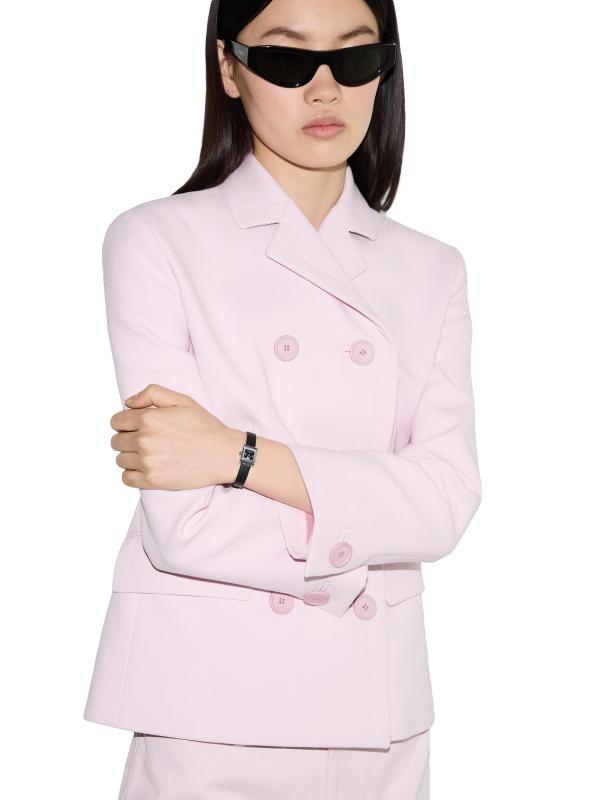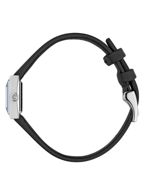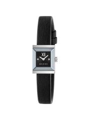 من مجموعة جي-فريم. تتميّز هذه الساعة الأنيقة من غوتشي، المزوّدة بحزام جلدي أسود، بإطار مستطيل من الفولاذ المقاوم للصدأ وقرص أسود مزين بأشعة الشمس مرصّعة بماستين متألقتين.