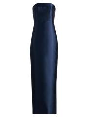 صُنع فستان Gaia من Theia من الميكادو في صورة عمودية بدون حمالات. تُبرز التفاصيل القابلة للطي خط العنق المستقيم لهذا الطراز الذي يصل إلى الأرض.