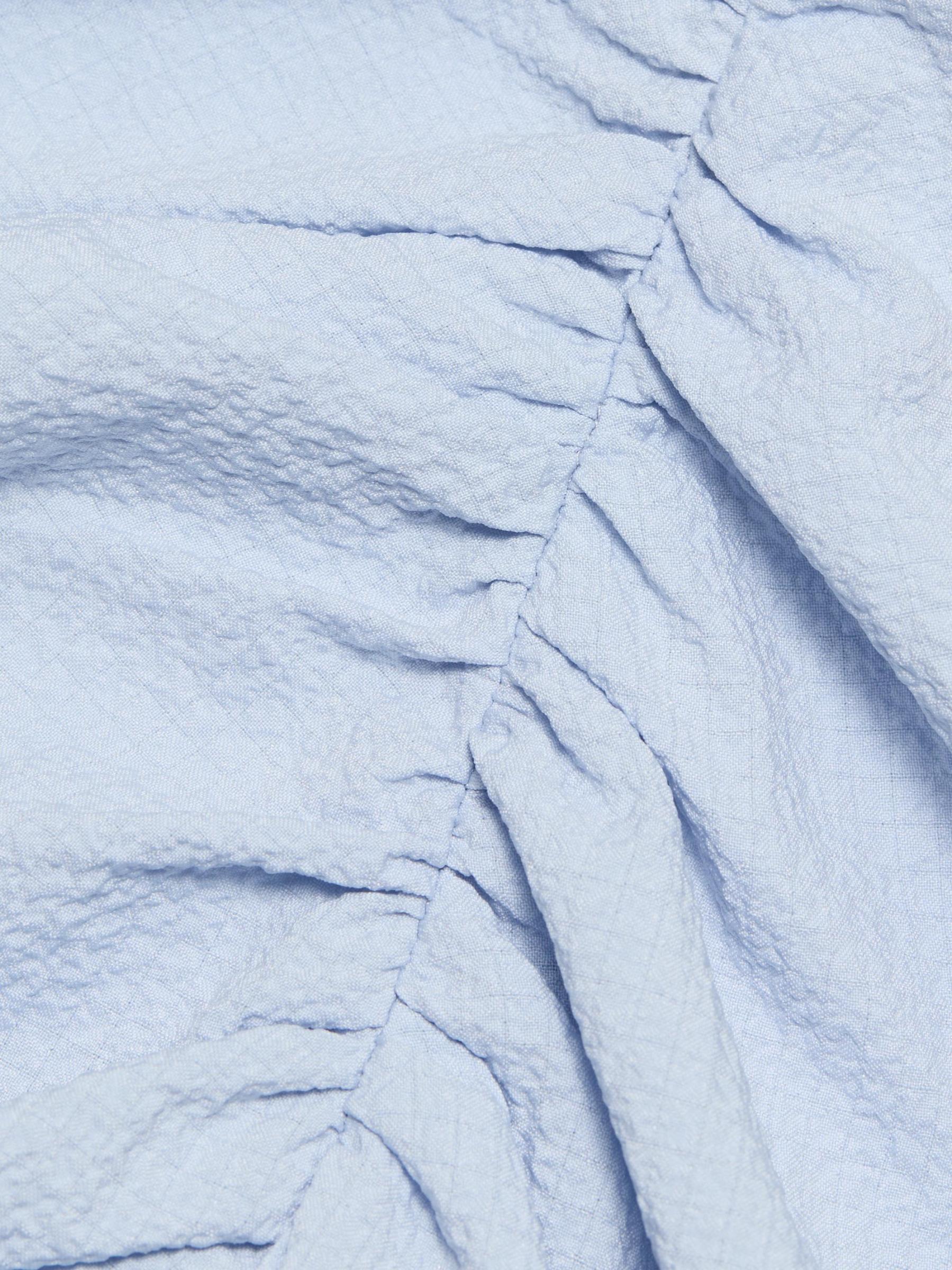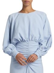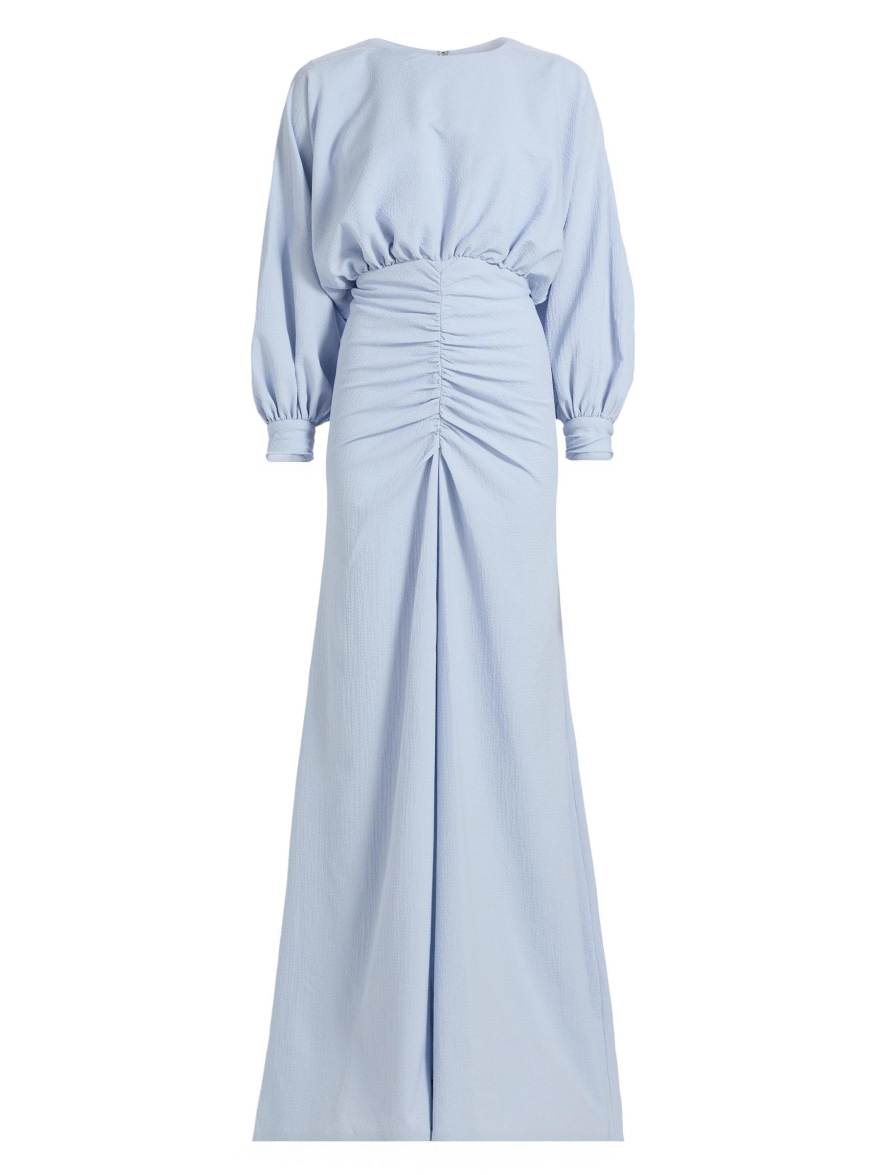 تم تصميم فستان Amsale بتصميم على شكل حرف A، مع تجمع عند الخصر.