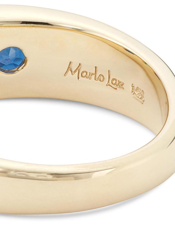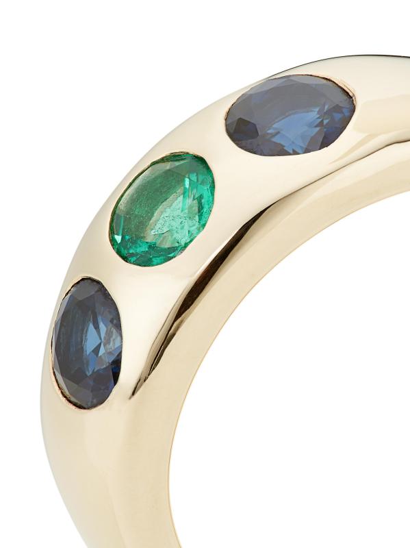 من مجموعة جيما. خاتم Marlo Laz مصنوع يدويًا من الذهب الأصفر عيار 14 قيراطًا ومرصع بقطعتين من الياقوت الأزرق المستدير النابض بالحياة والزمرد المركزي.