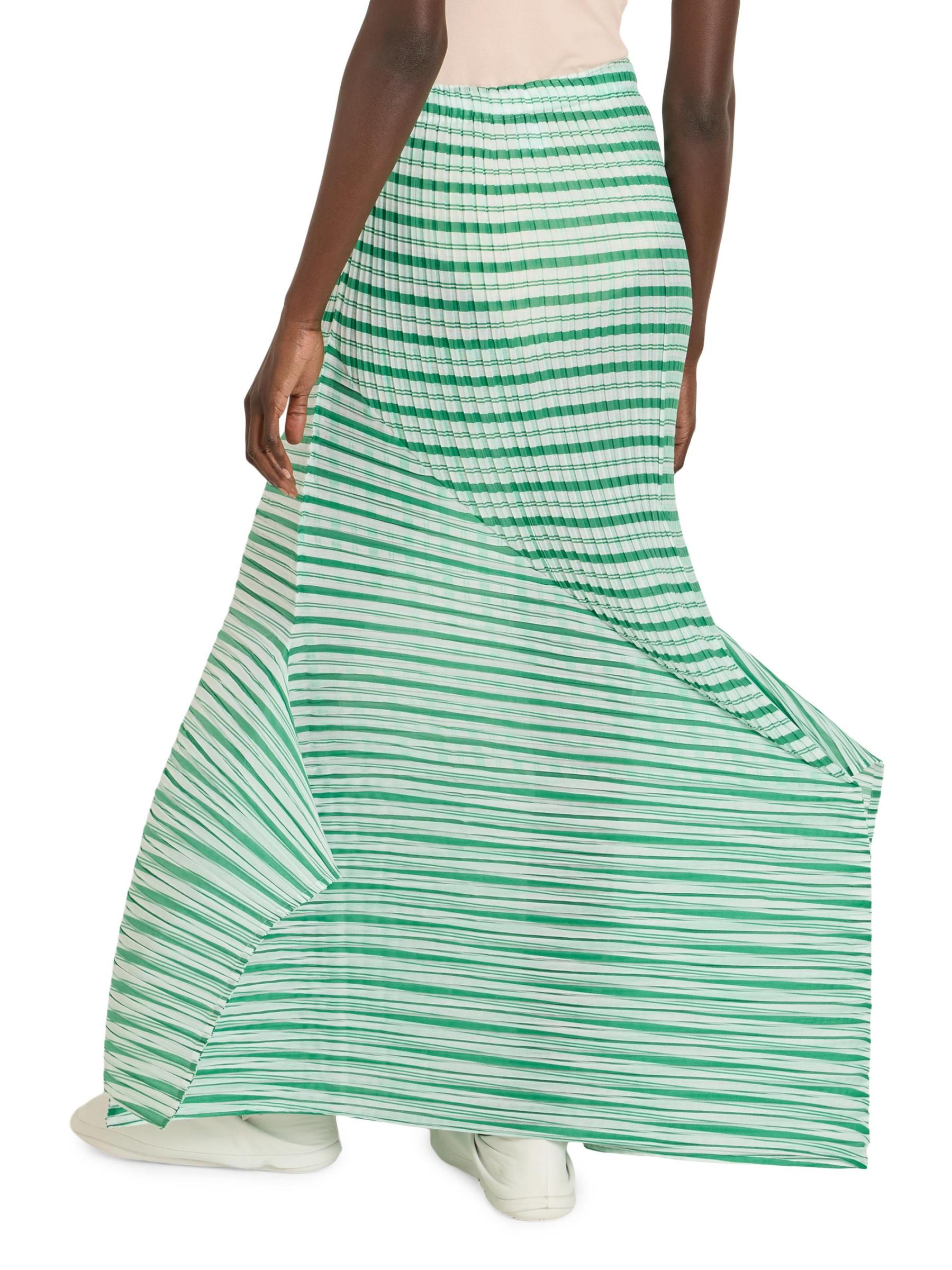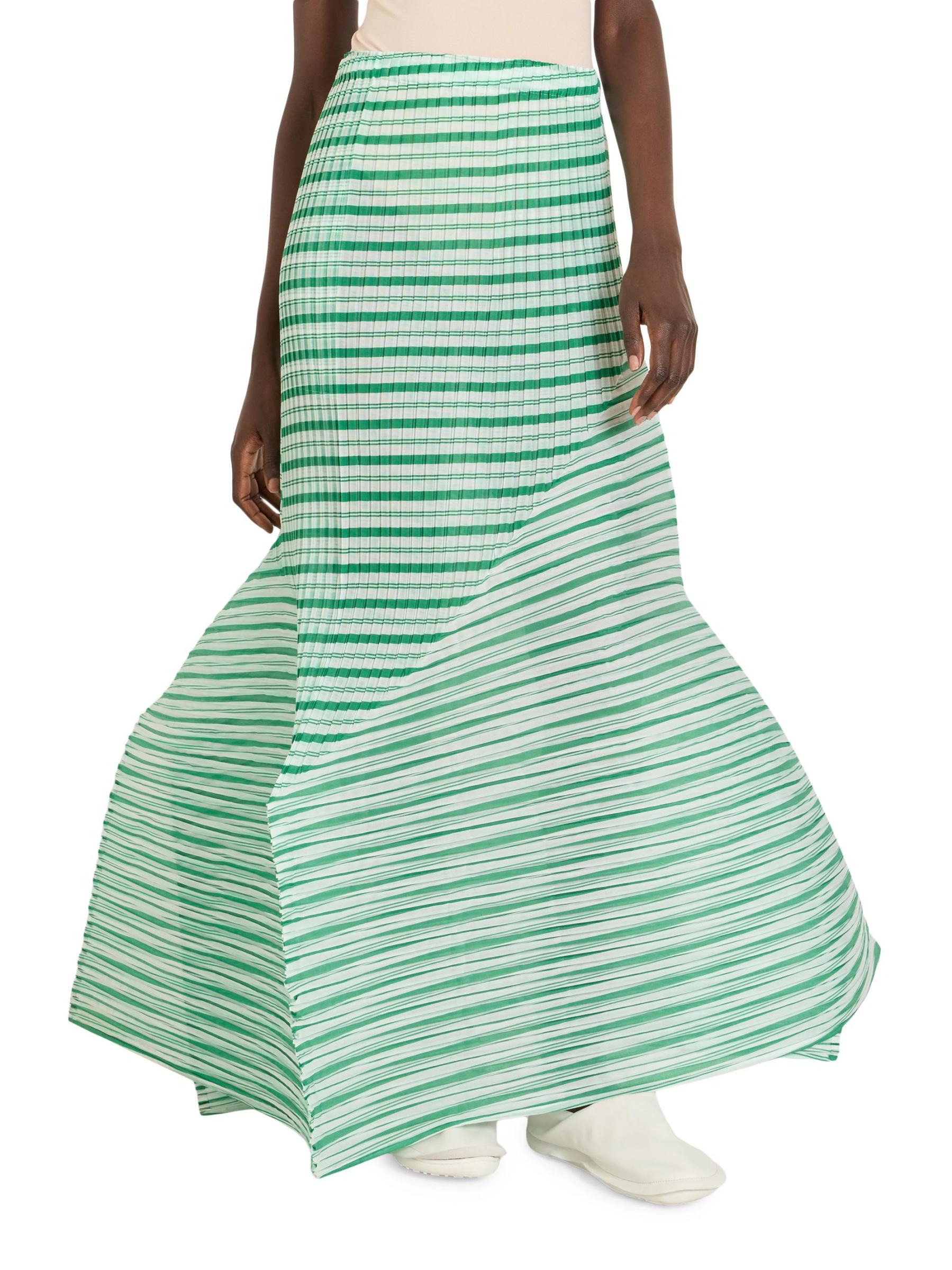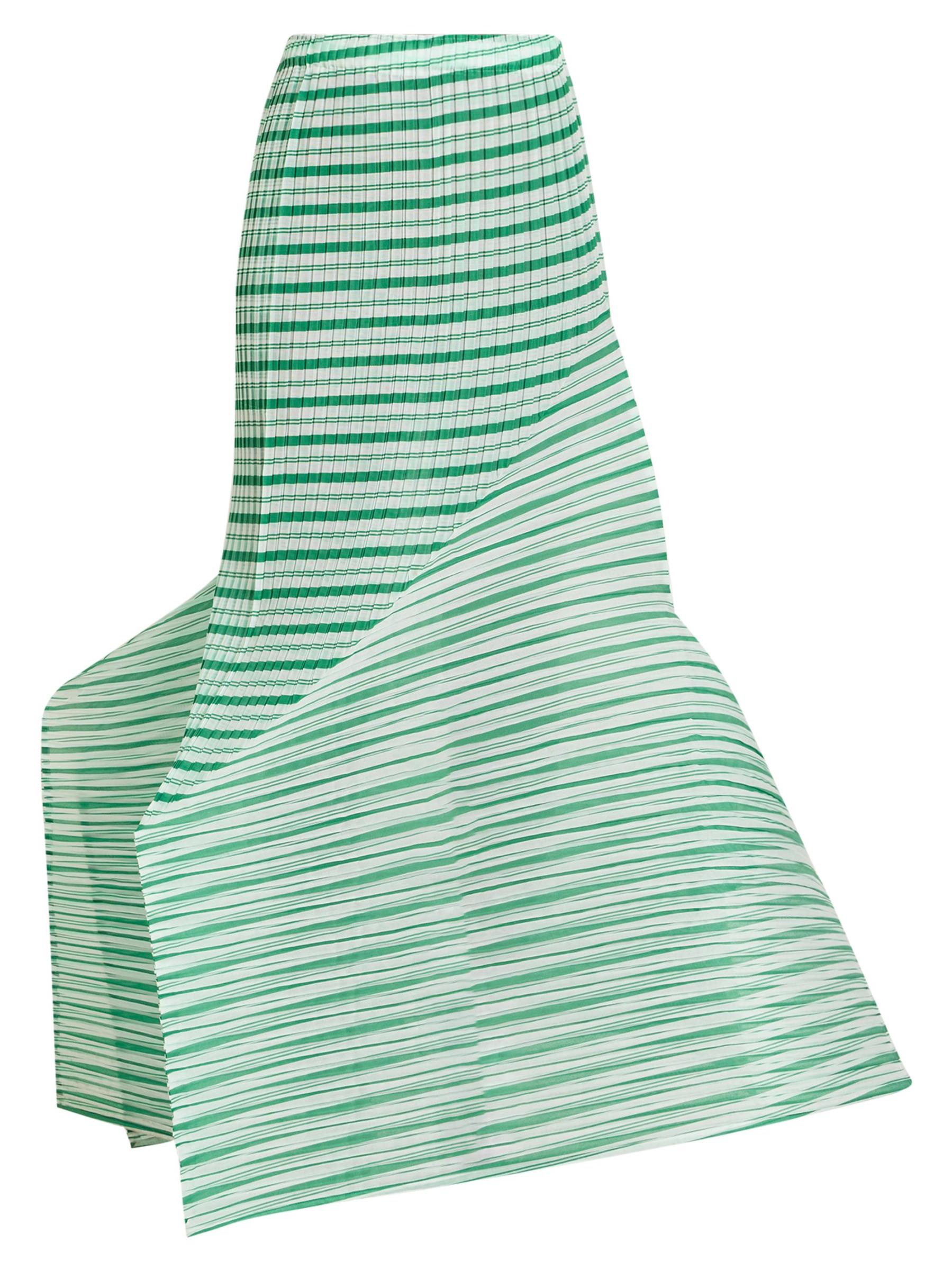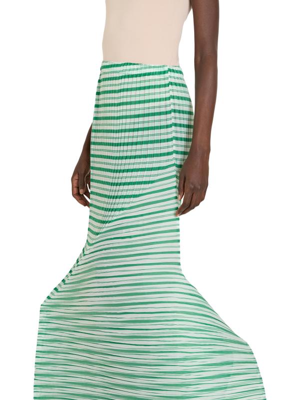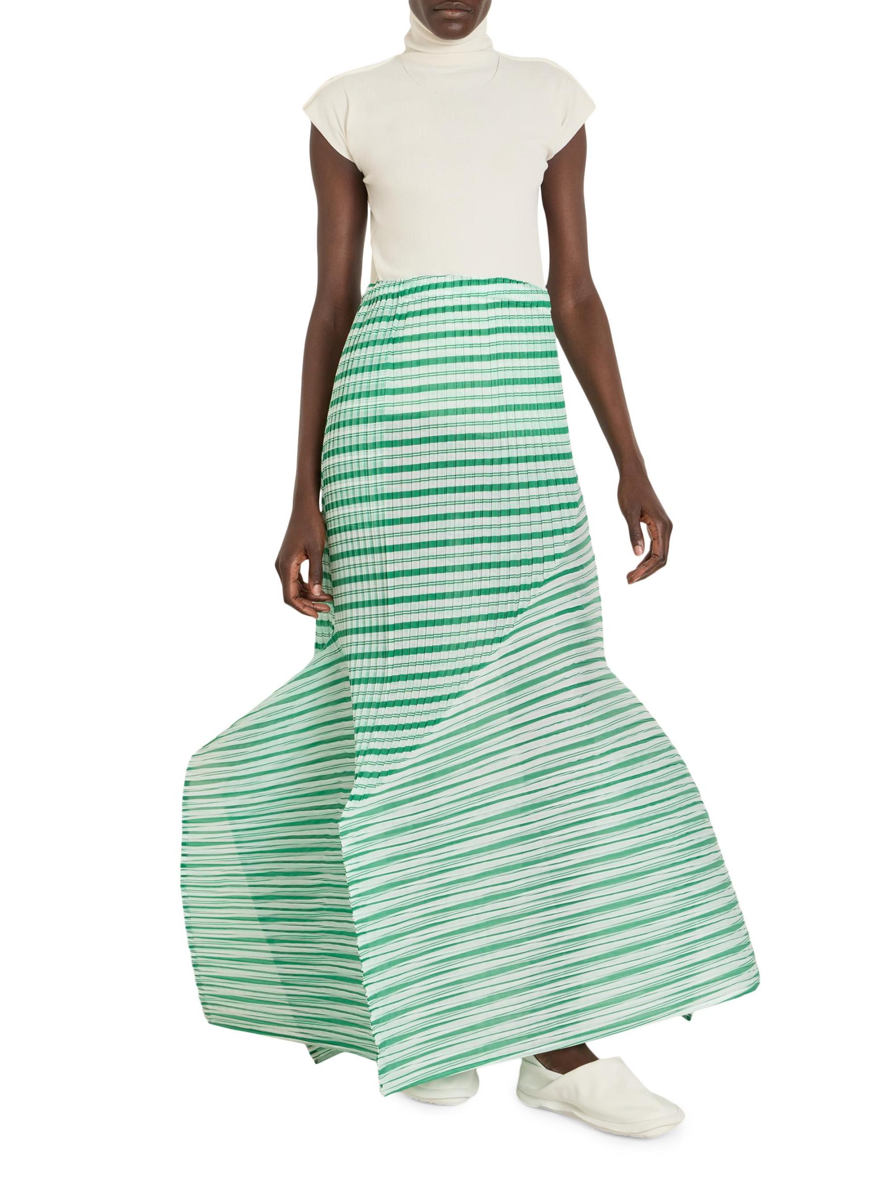 صُممت التنورة الطويلة Generic Stripes من Issey Miyake بتصميم ميكانيكي مطوي، وتم نحتها لخلق صورة ظلية فريدة ورائعة.